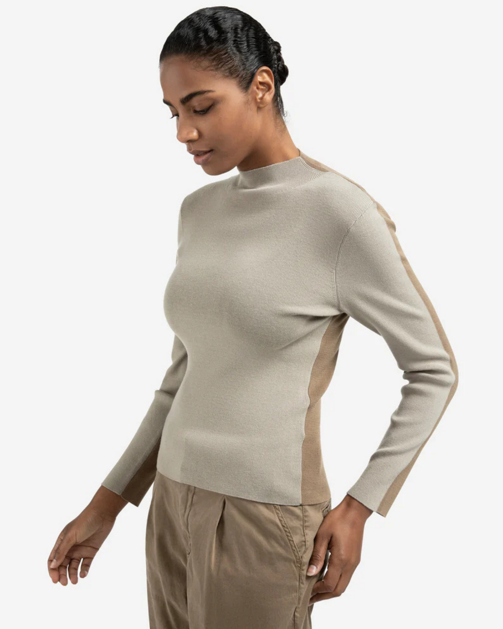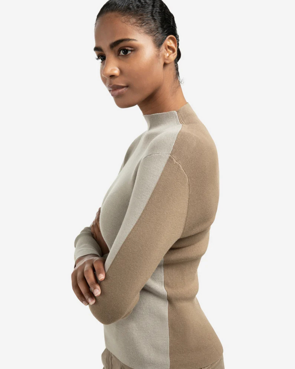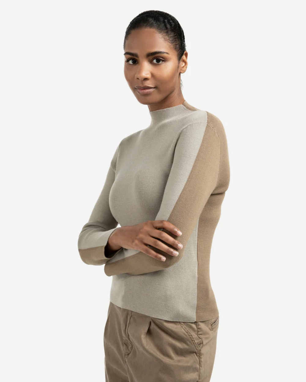 Ce haut ajusté est conçu avec un col montant et des manches longues pour une silhouette sophistiquée. Le design bicolore aux couleurs contrastées ajoute une touche raffinée et moderne.