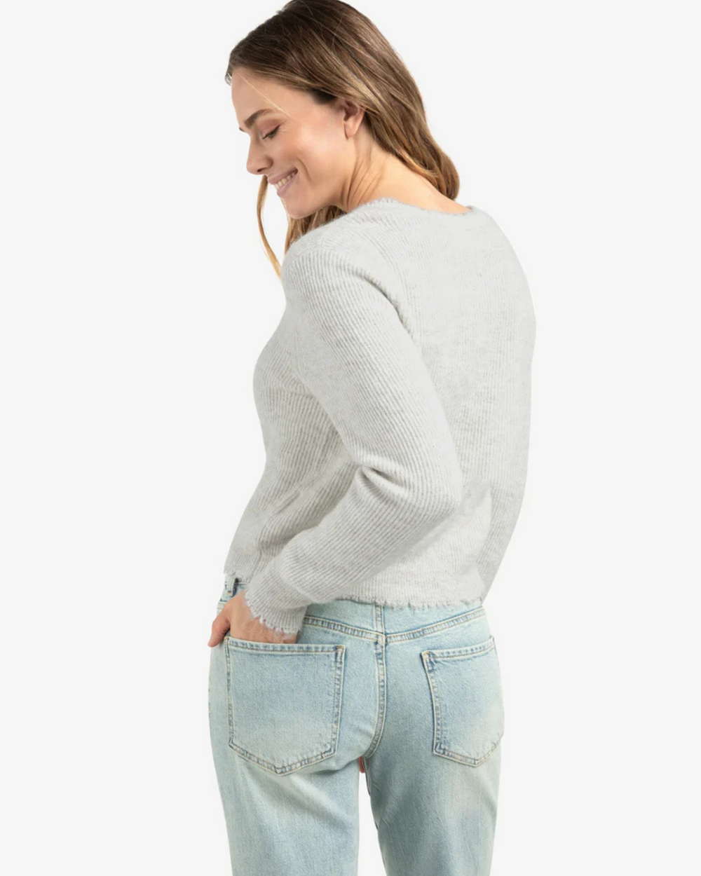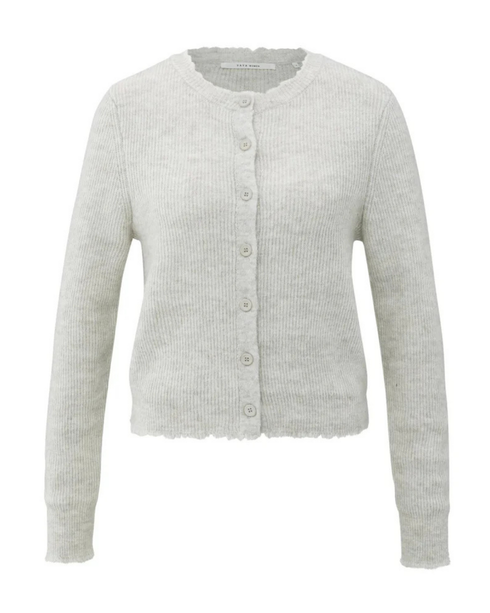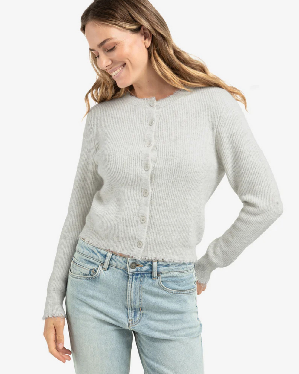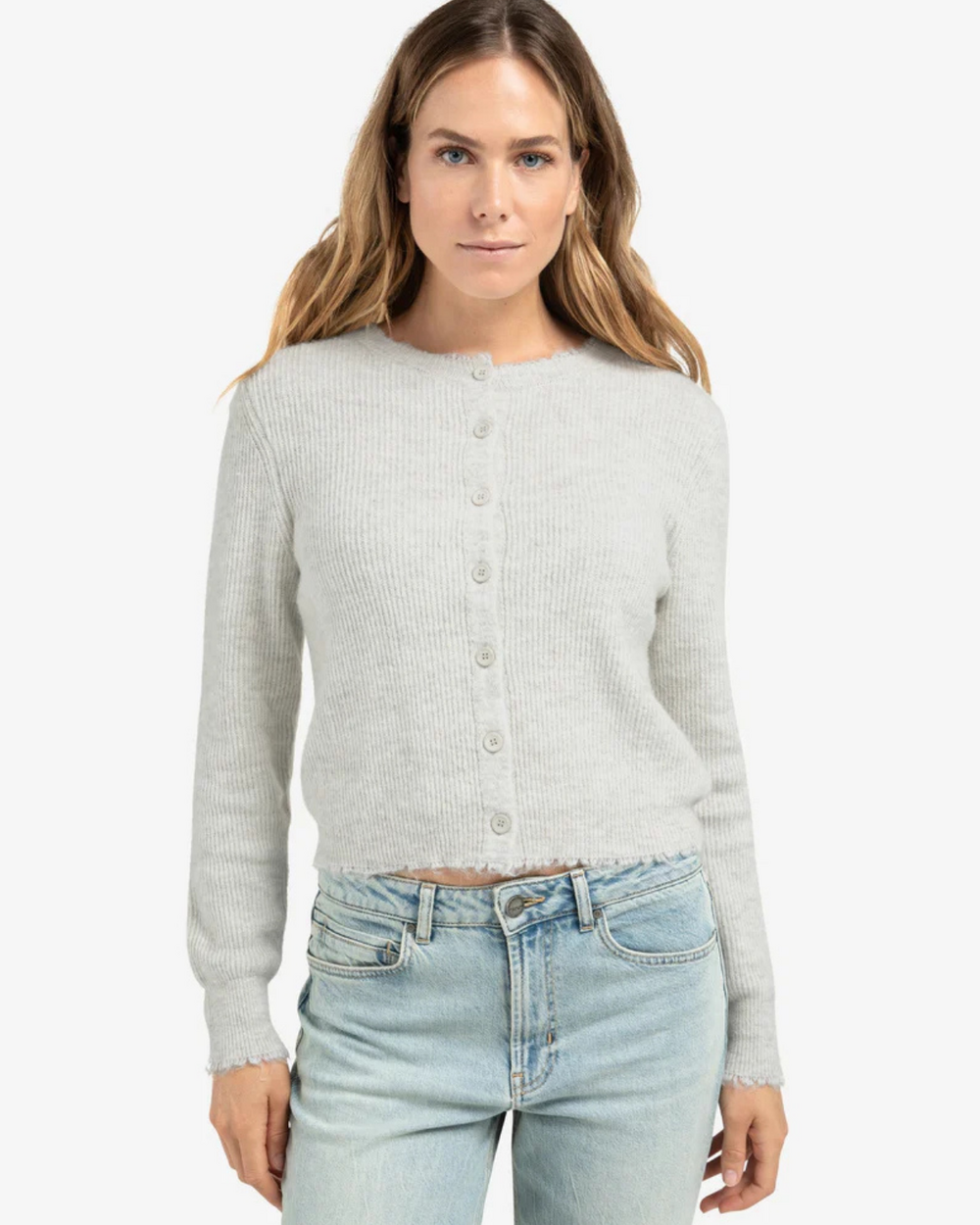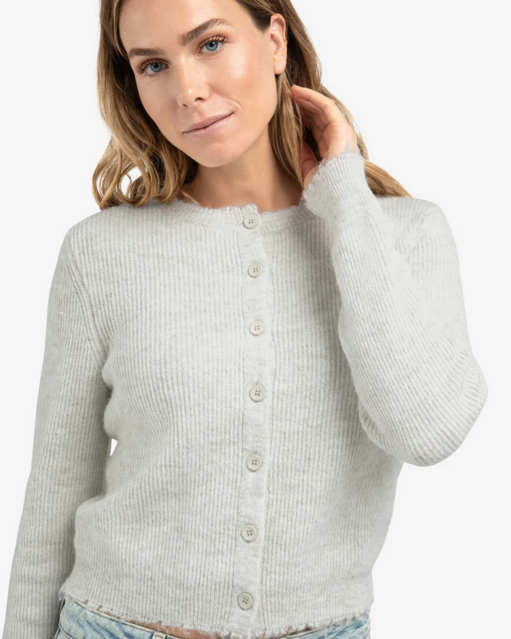 Ce cardigan court est confectionné dans un tissu mélangé doux. Il présente une coupe droite à manches longues, un col rond et des finitions effilochées au niveau du col, des poignets et de l'ourlet.