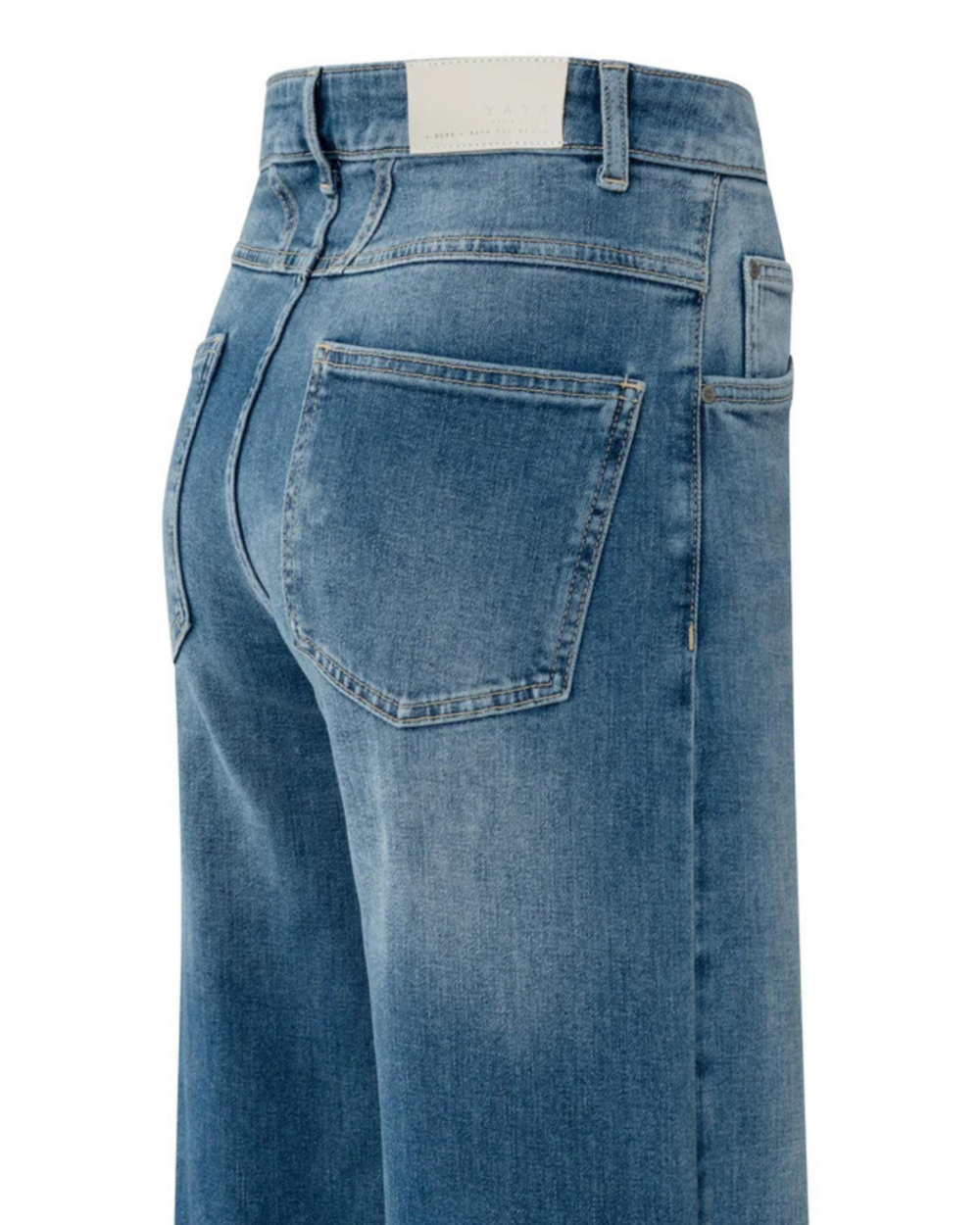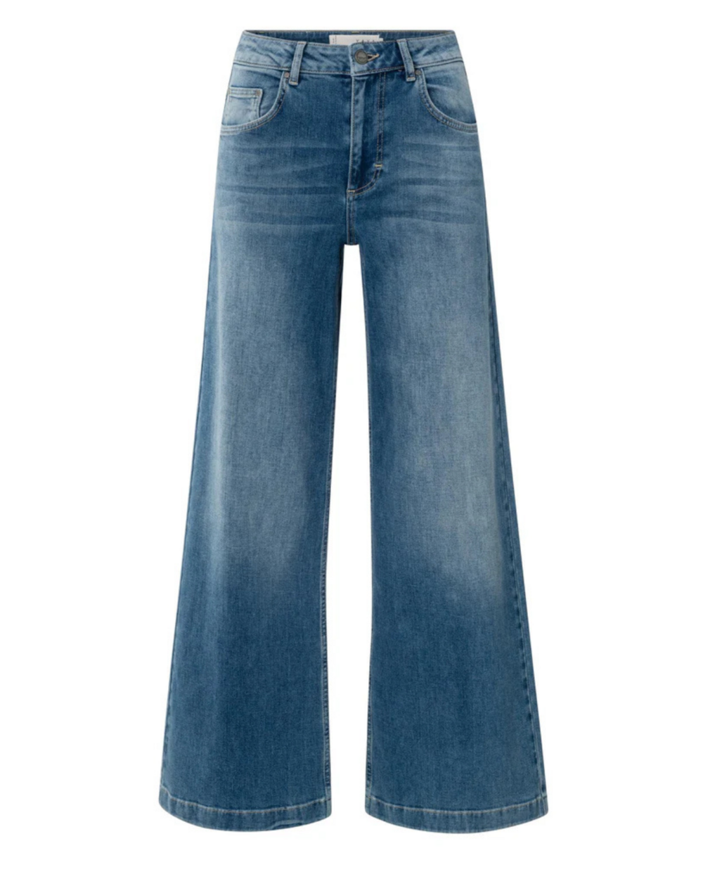 Ce jean confortable est doté d'une taille haute et d'une coupe ample à jambes larges. Il est en denim robuste avec cinq poches et un délavage classique.