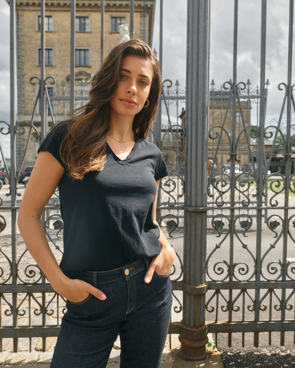 Ce tee-shirt est parfait pour être agencé avec tout, du tailleur au denim décontracté. Fabriqué en coton biologique, une silhouette ajustée et une encolure en V.
