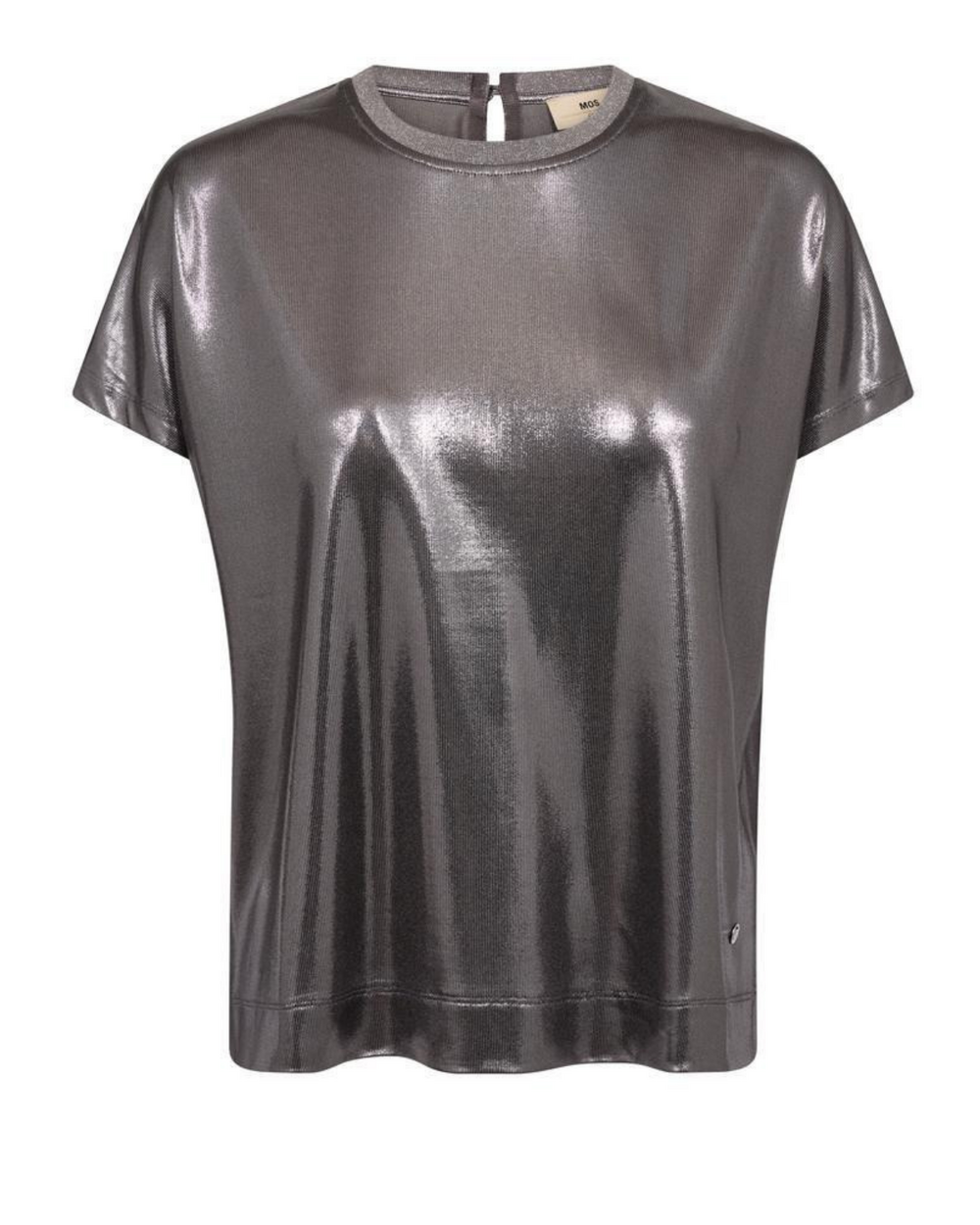 T-shirt décontracté à col rond, finition métallique, détail côtelé à l'encolure et fermeture à bouton à l'encolure.