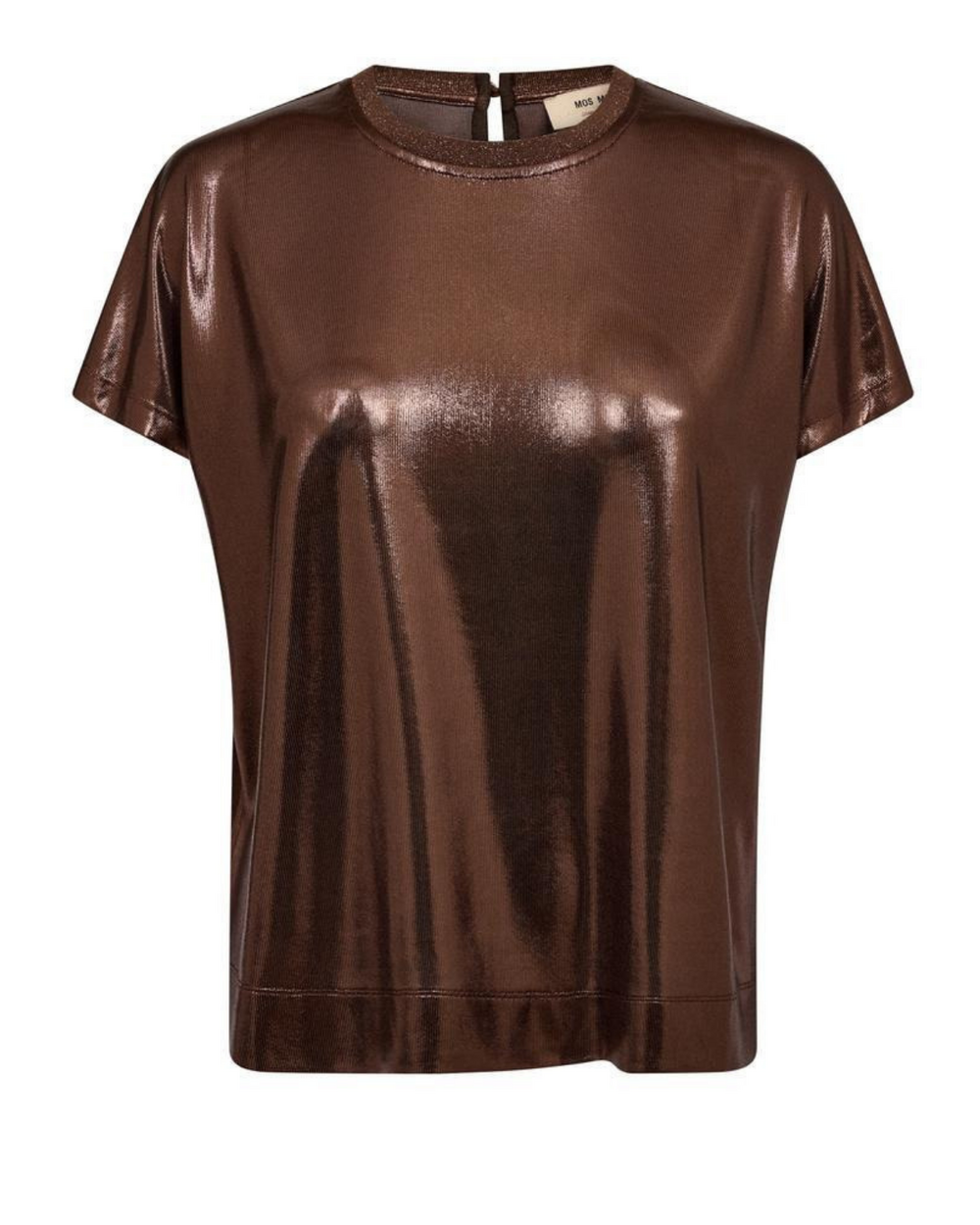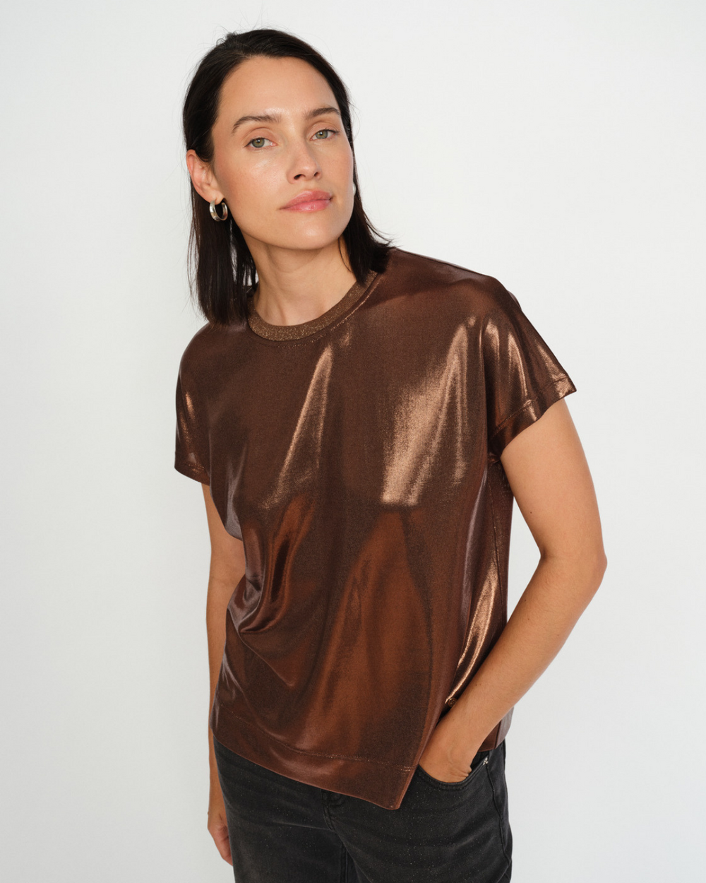 T-shirt à col rond de coupe décontractée avec finition métallique, détails en côtes à l'encolure et fermeture à bouton à l'encolure.