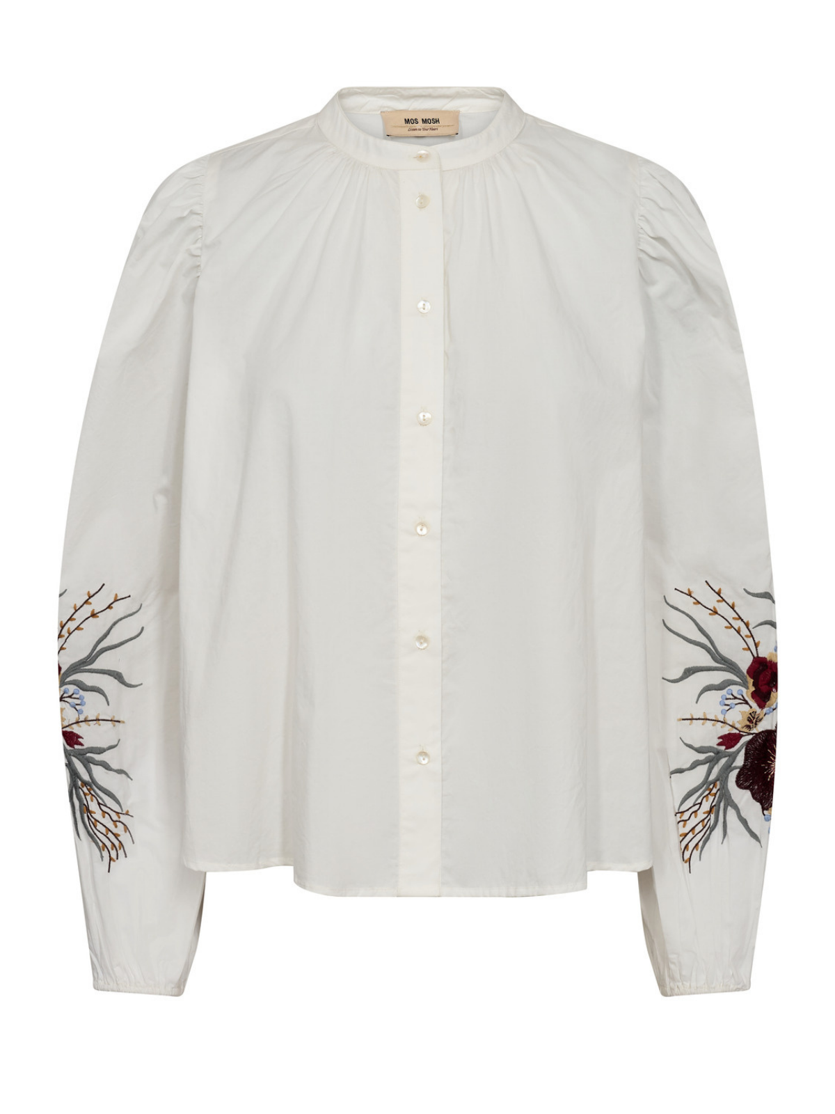 Chemisier à col mao et à manches longues ornée de broderies florales.