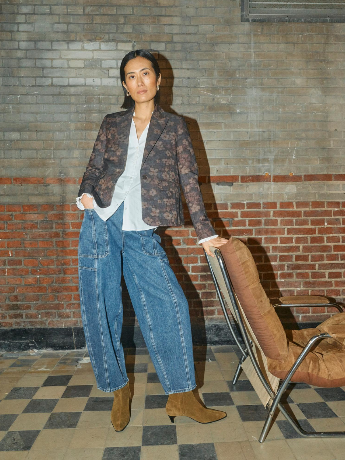 Veston à boutonnage simple, fait de tissu italien, avec poches à rabat sur le devant et boutons aux poignets.
