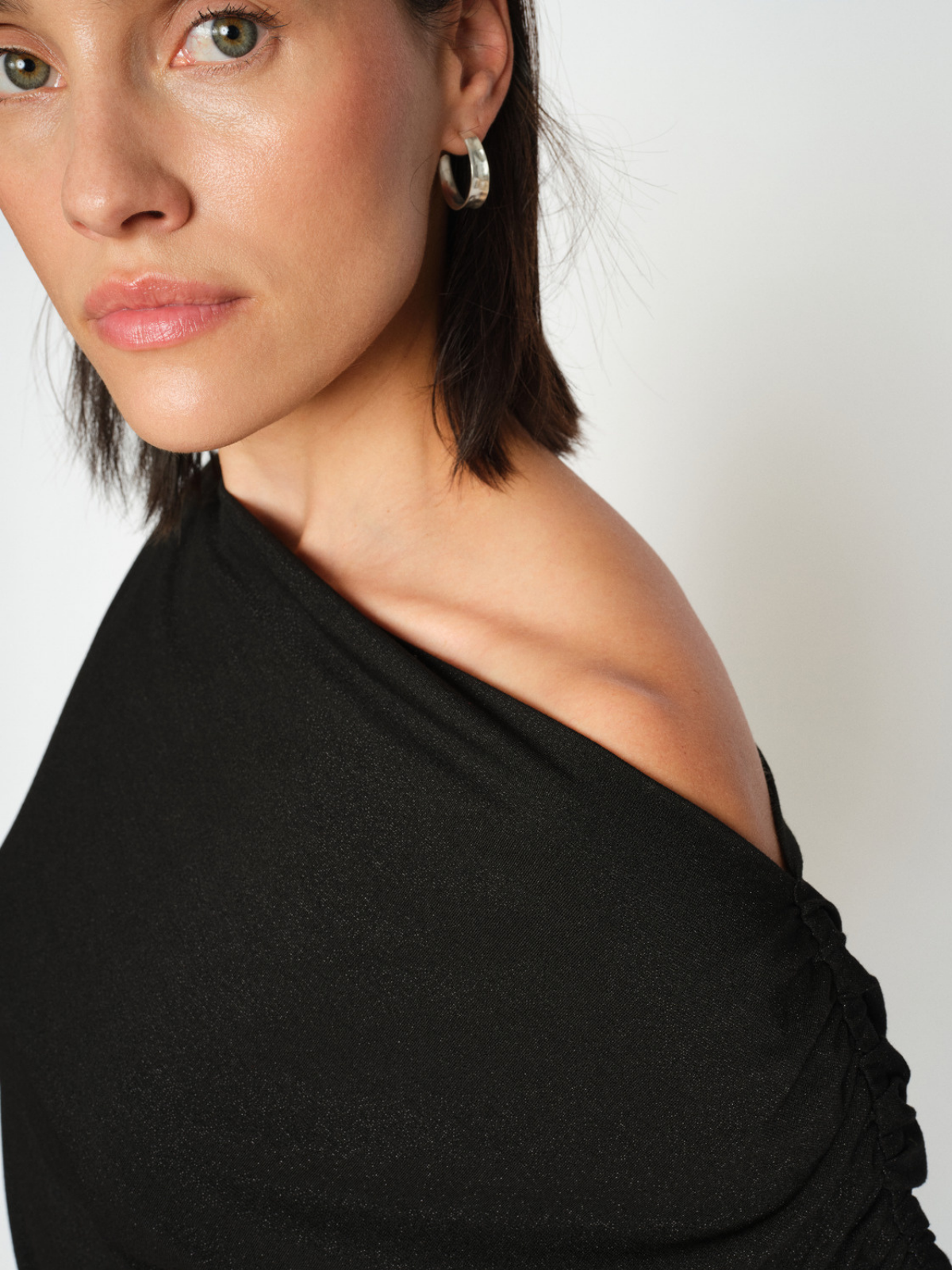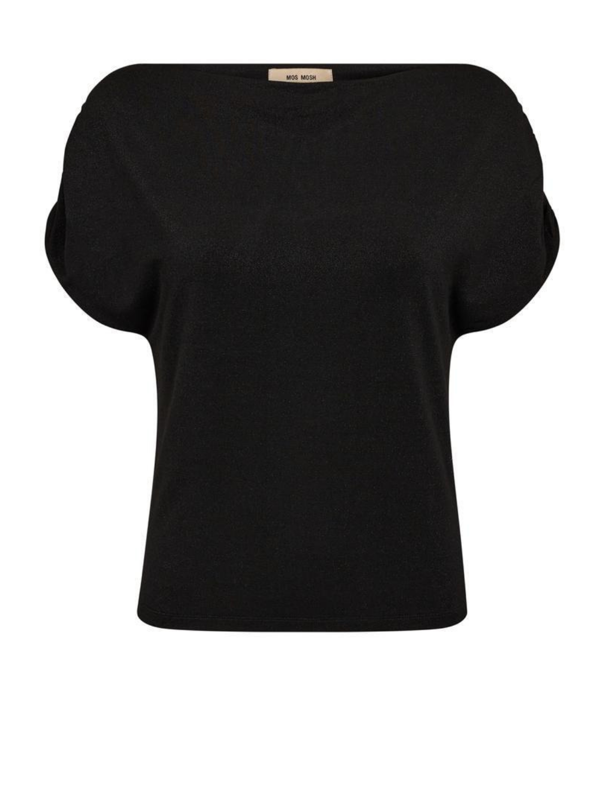 Blouse cintrée à manches courtes et épaules dégagées, avec détails froncés aux manches, en mélange viscose-lurex doux.