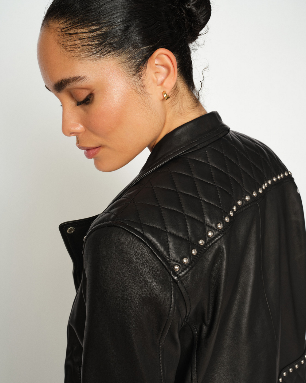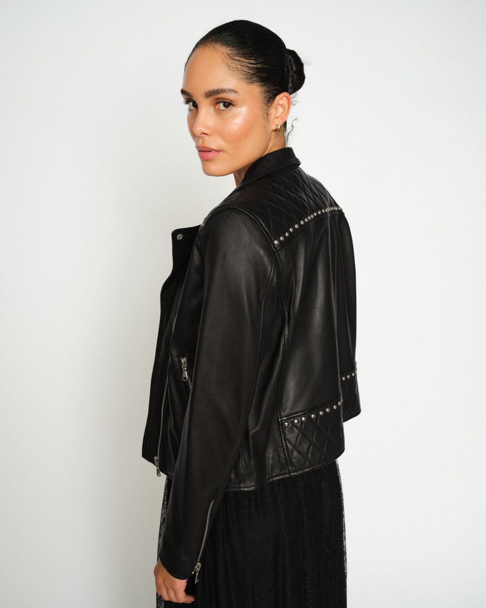 Veste de moto classique entièrement doublée avec détails cloutés, réalisée en cuir souple et finie avec un motif matelassé à losanges unique sur les épaules et dans le haut du dos.