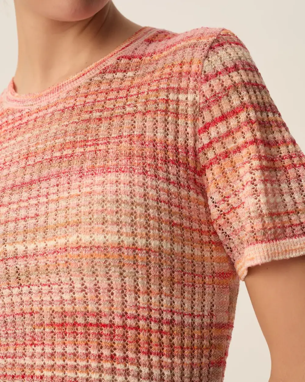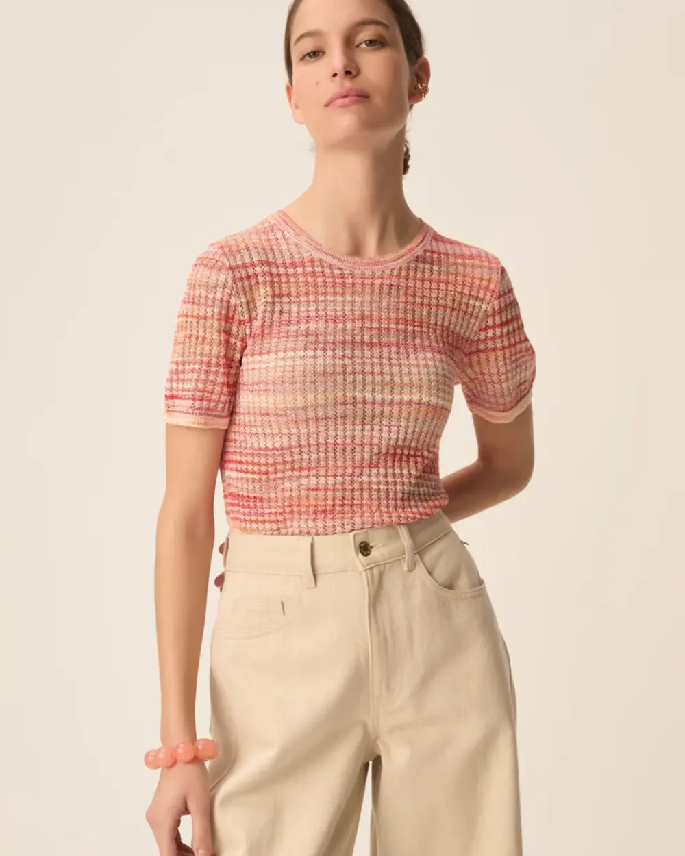 Pull à manches courtes et col rond ajusté, en fil mélangé de viscose multicolore doux.
