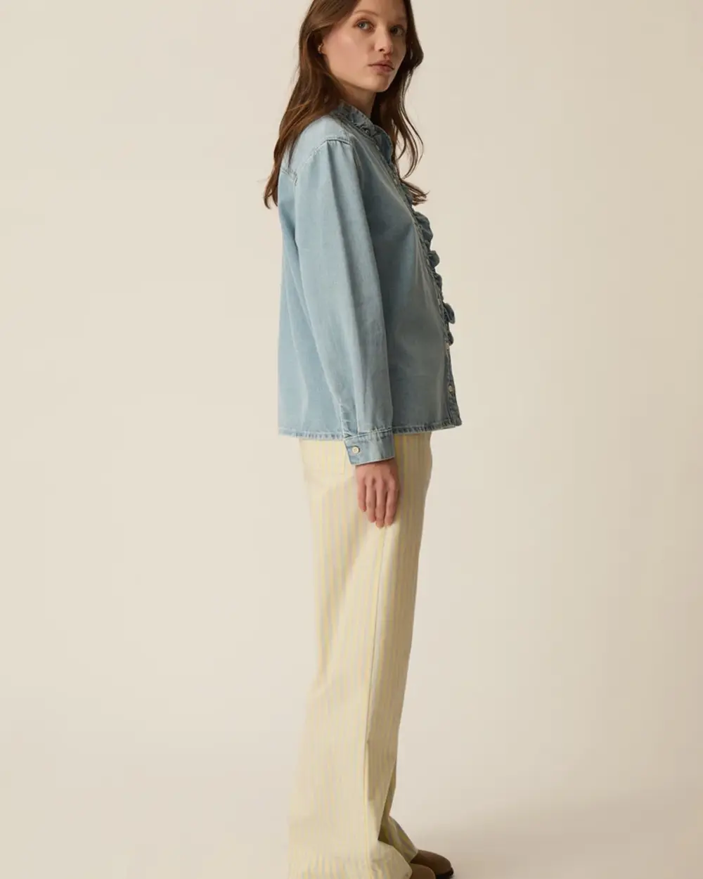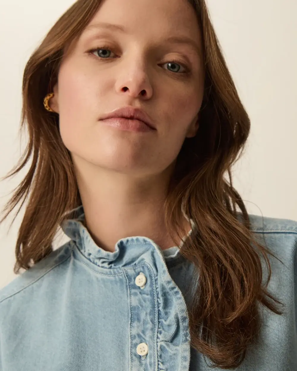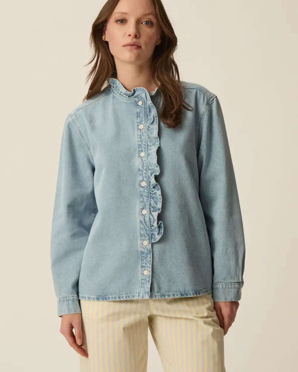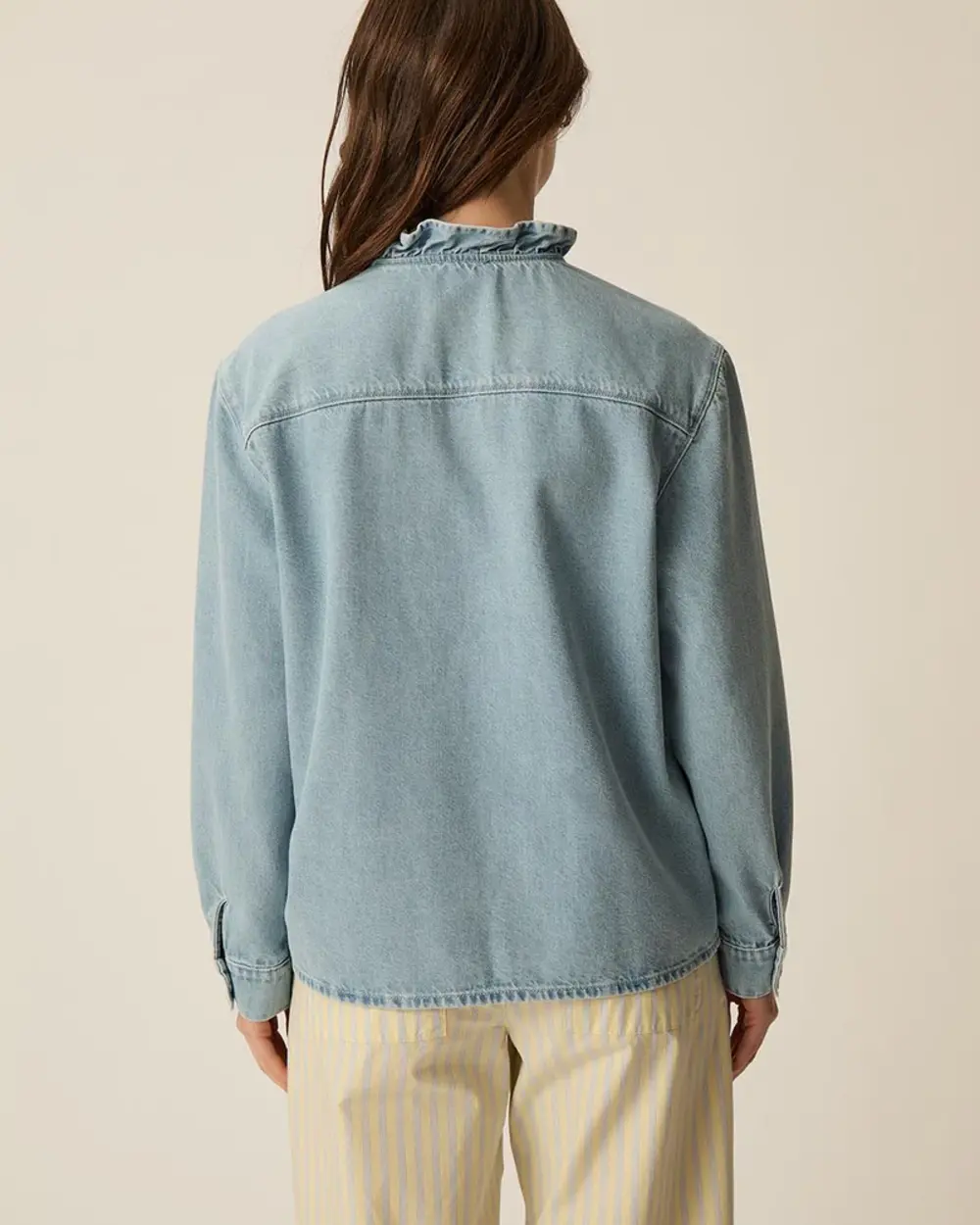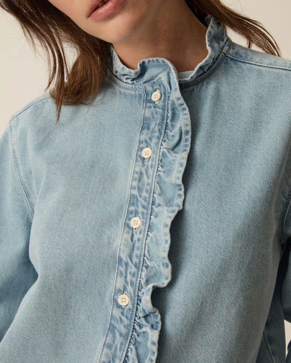 Chemise ample à manches longues en denim, avec volants au col montant et à la patte de boutonnage sur le devant.