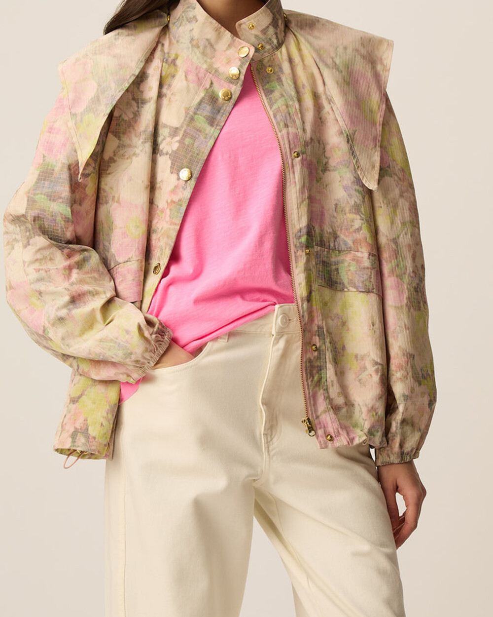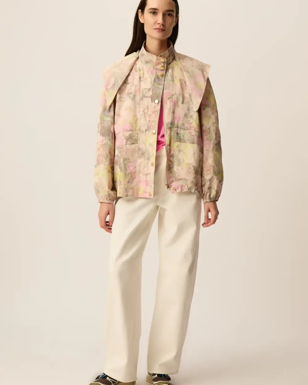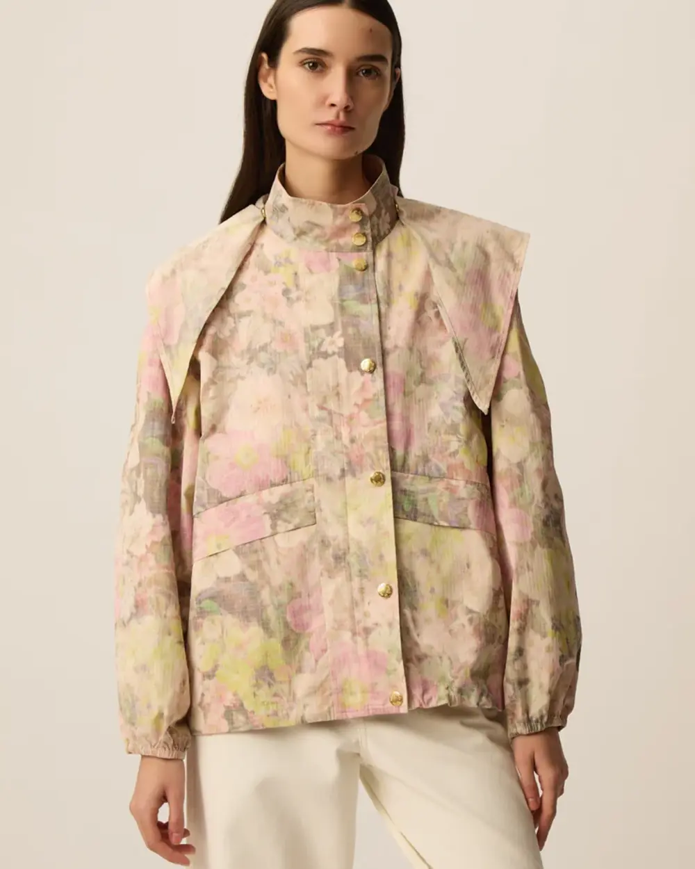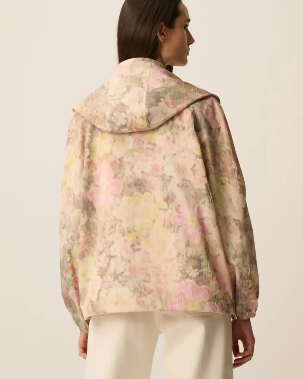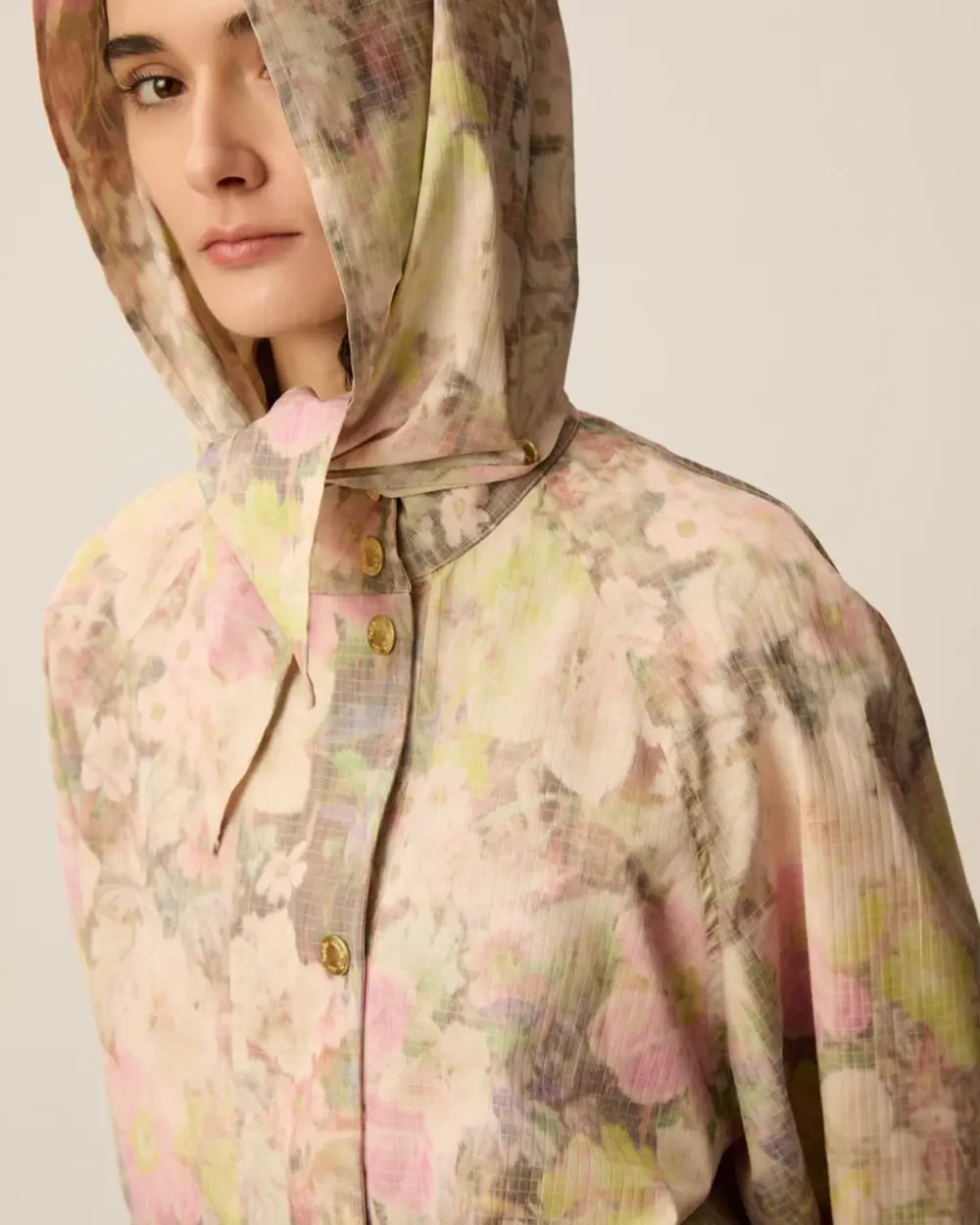Veste de pluie ample avec fermeture à glissière dissimulée et boutons-pression, poches avant et capuche amovible.