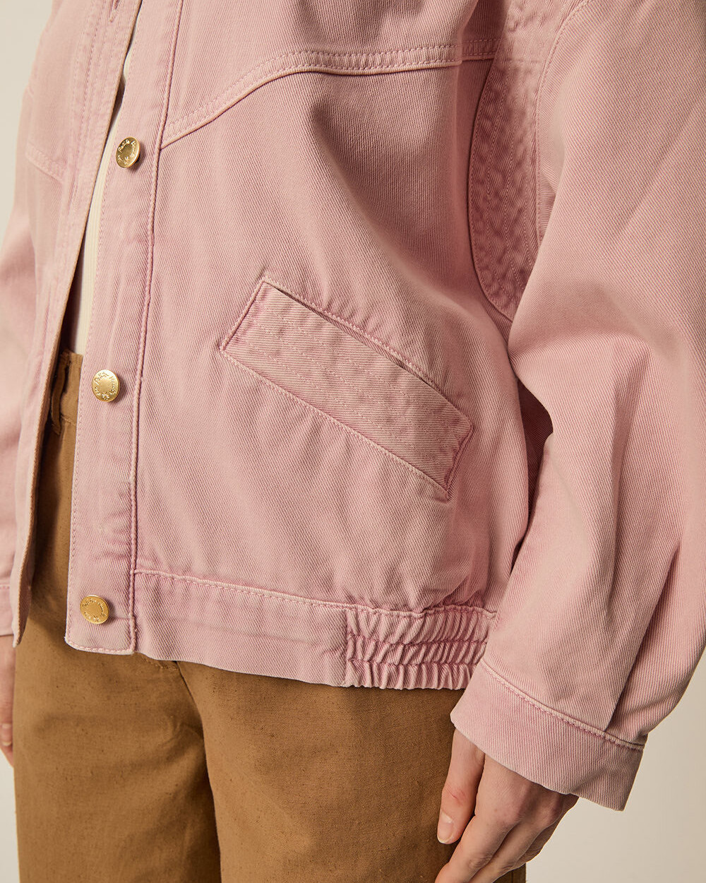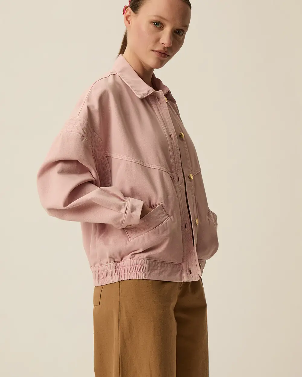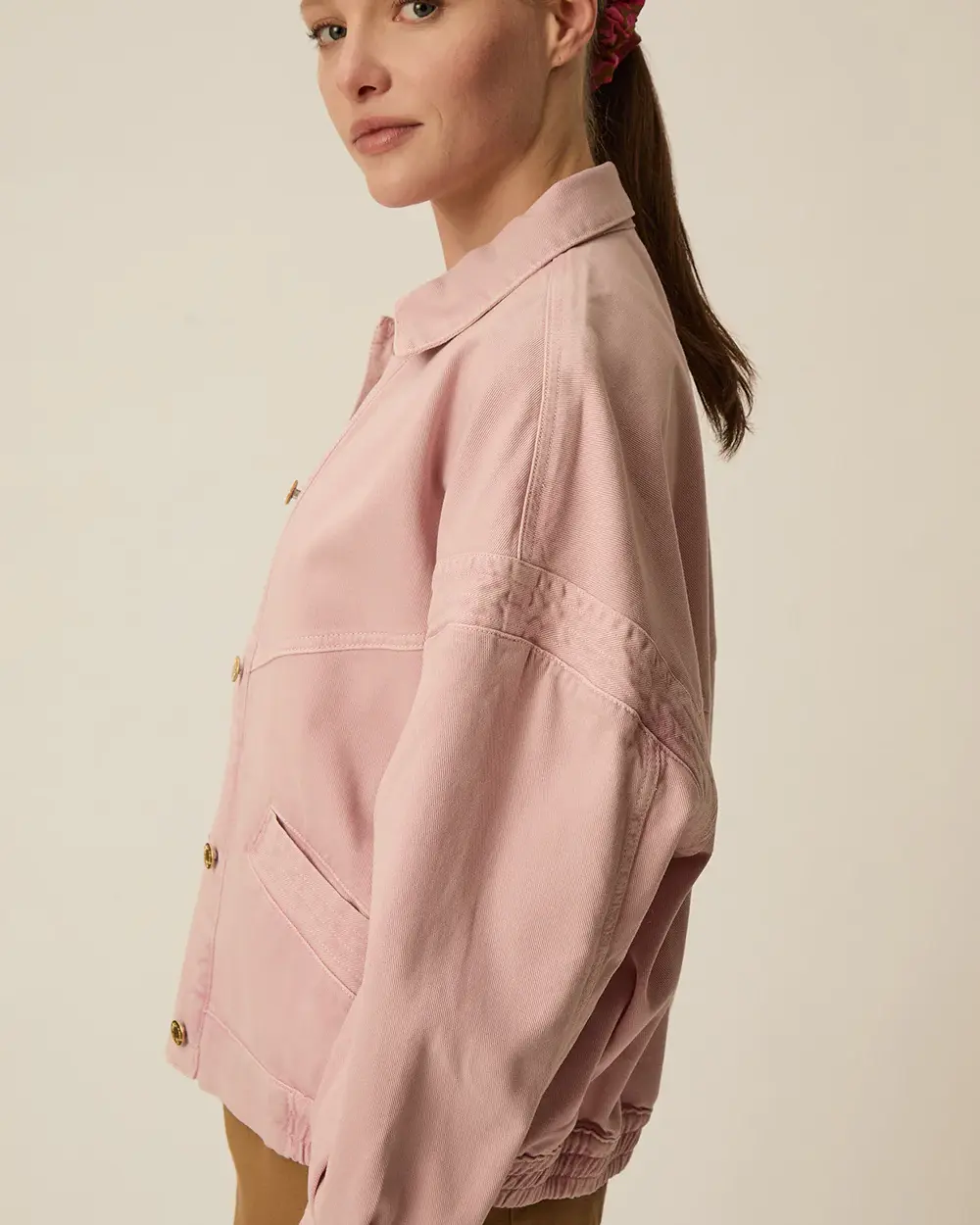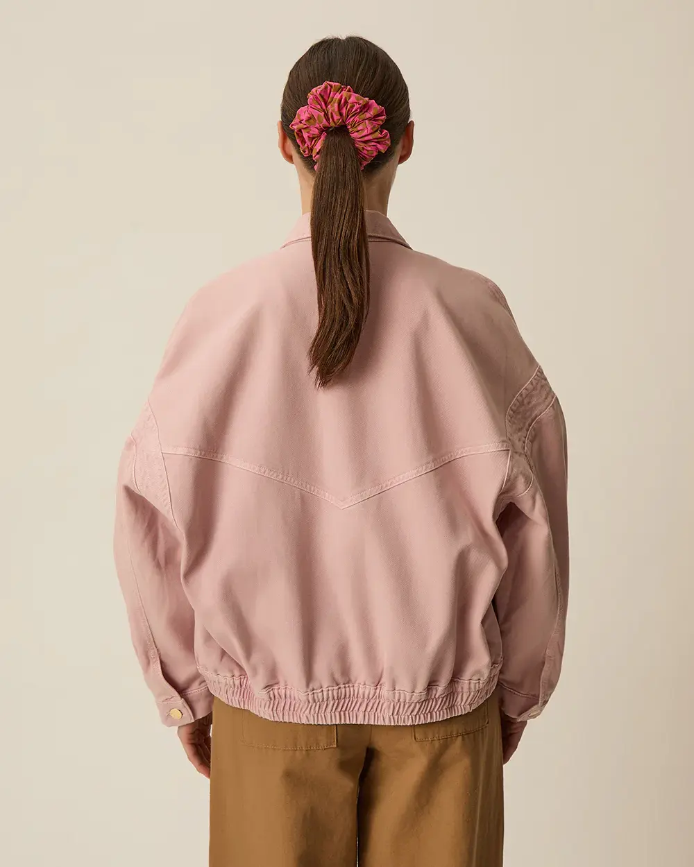 Blouson bomber oversize en denim avec poches avant, épaules tombantes et taille élastiquée à l'arrière.