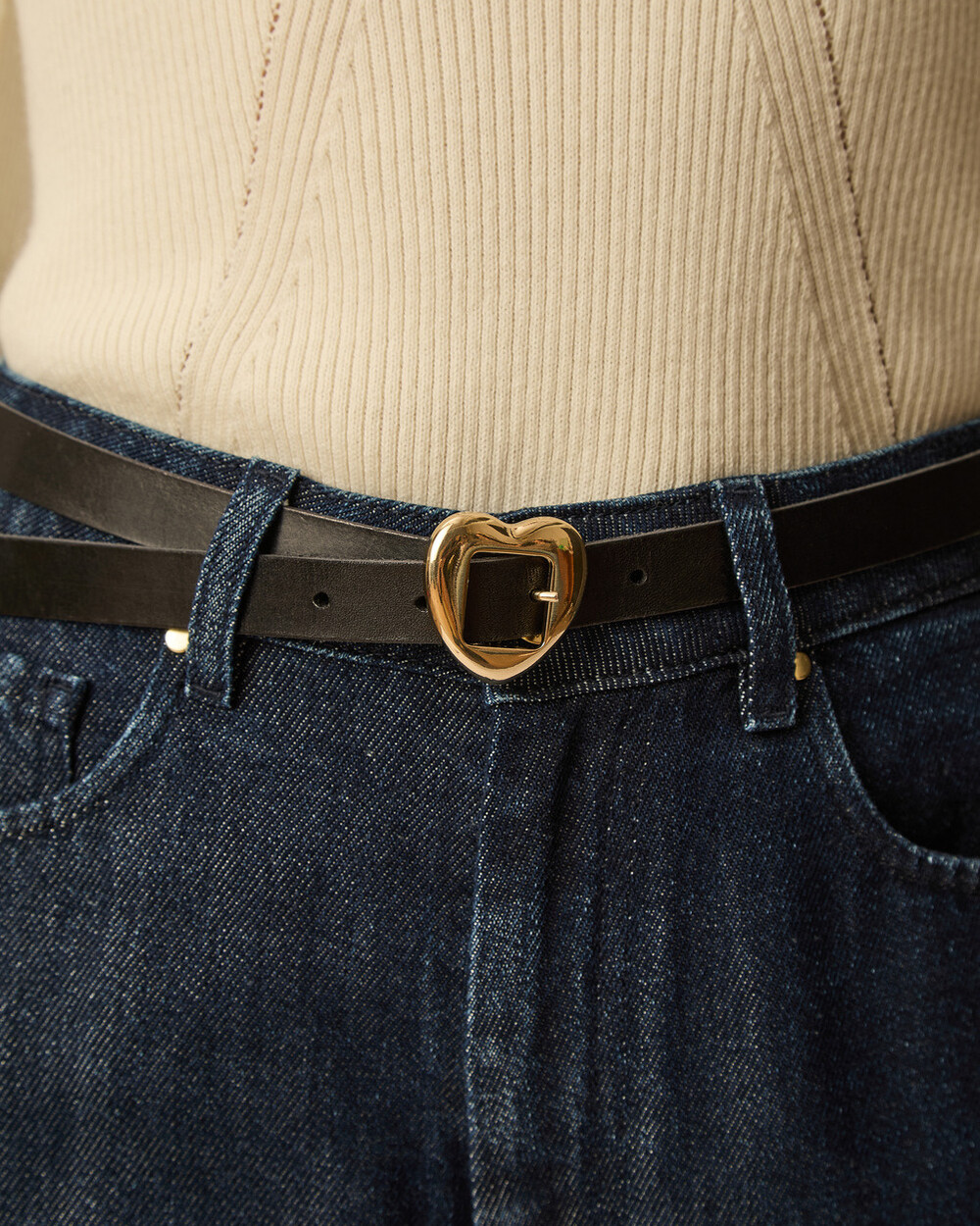 Ceinture noire ajustée avec boucle dorée en forme de cœur, en cuir souple.