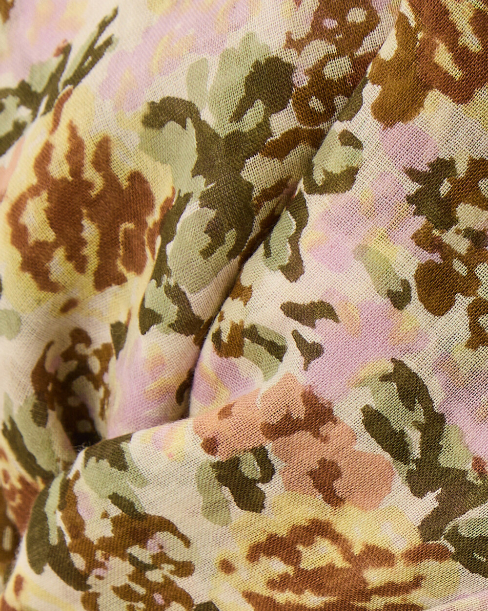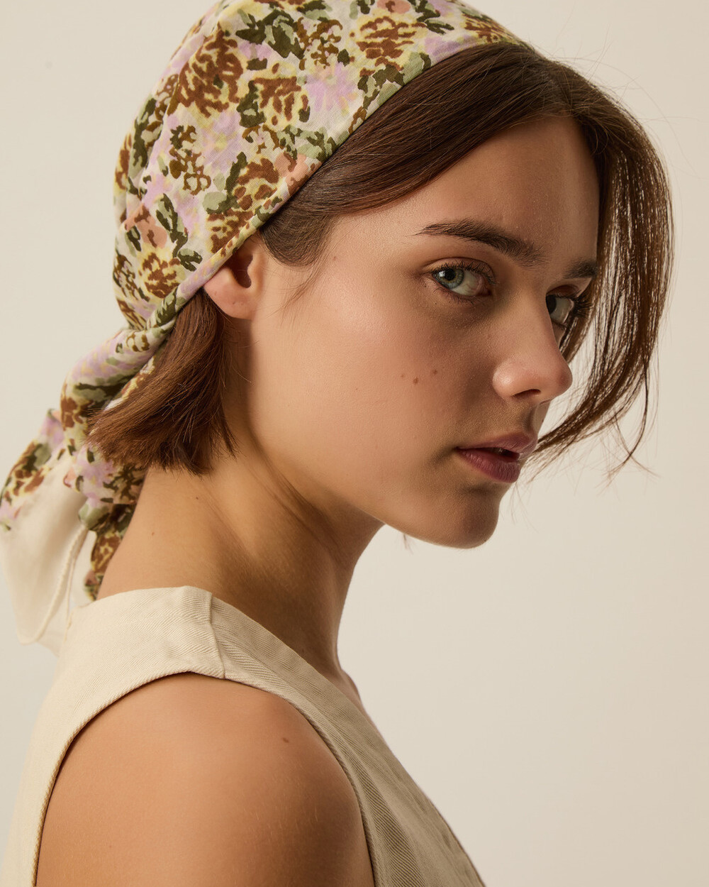 Foulard carré en voile de coton léger pouvant être porté autour du cou, comme accessoire pour les cheveux ou comme ceinture.