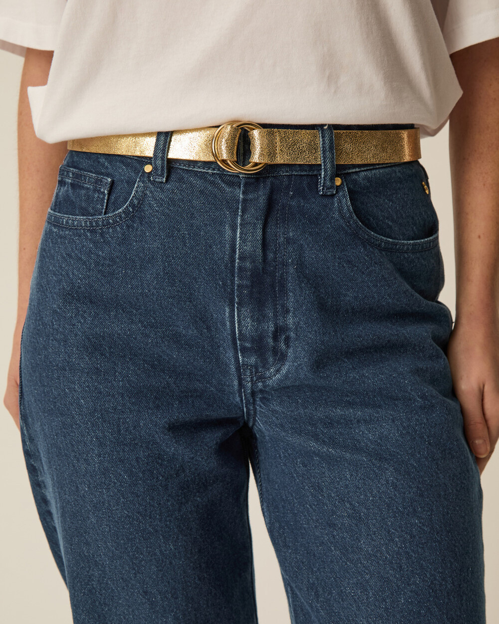 Ceinture en cuir métallisé avec double boucle pour un ajustement flexible.