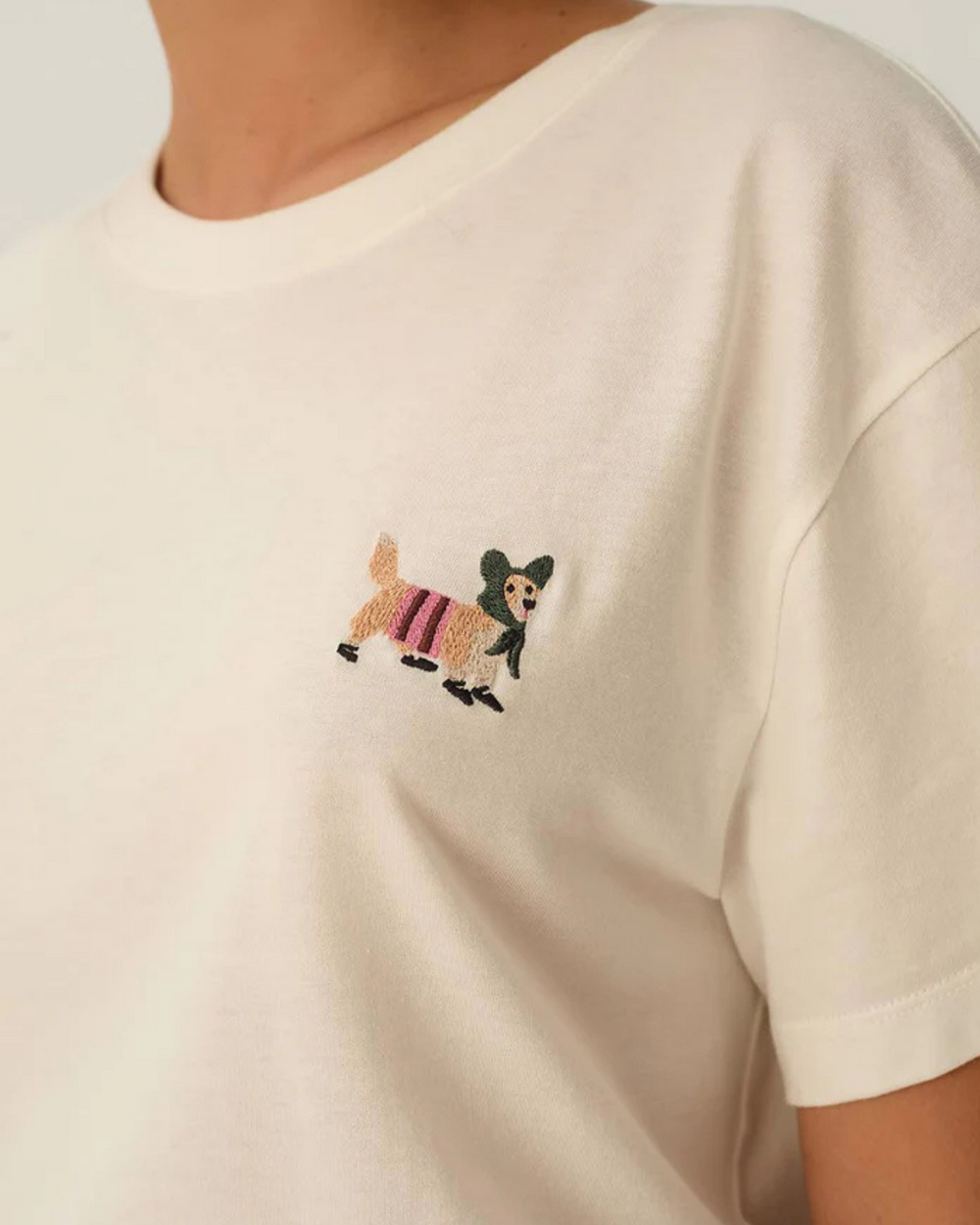 T-shirt blanc avec chien Corgi brodé sur le devant.