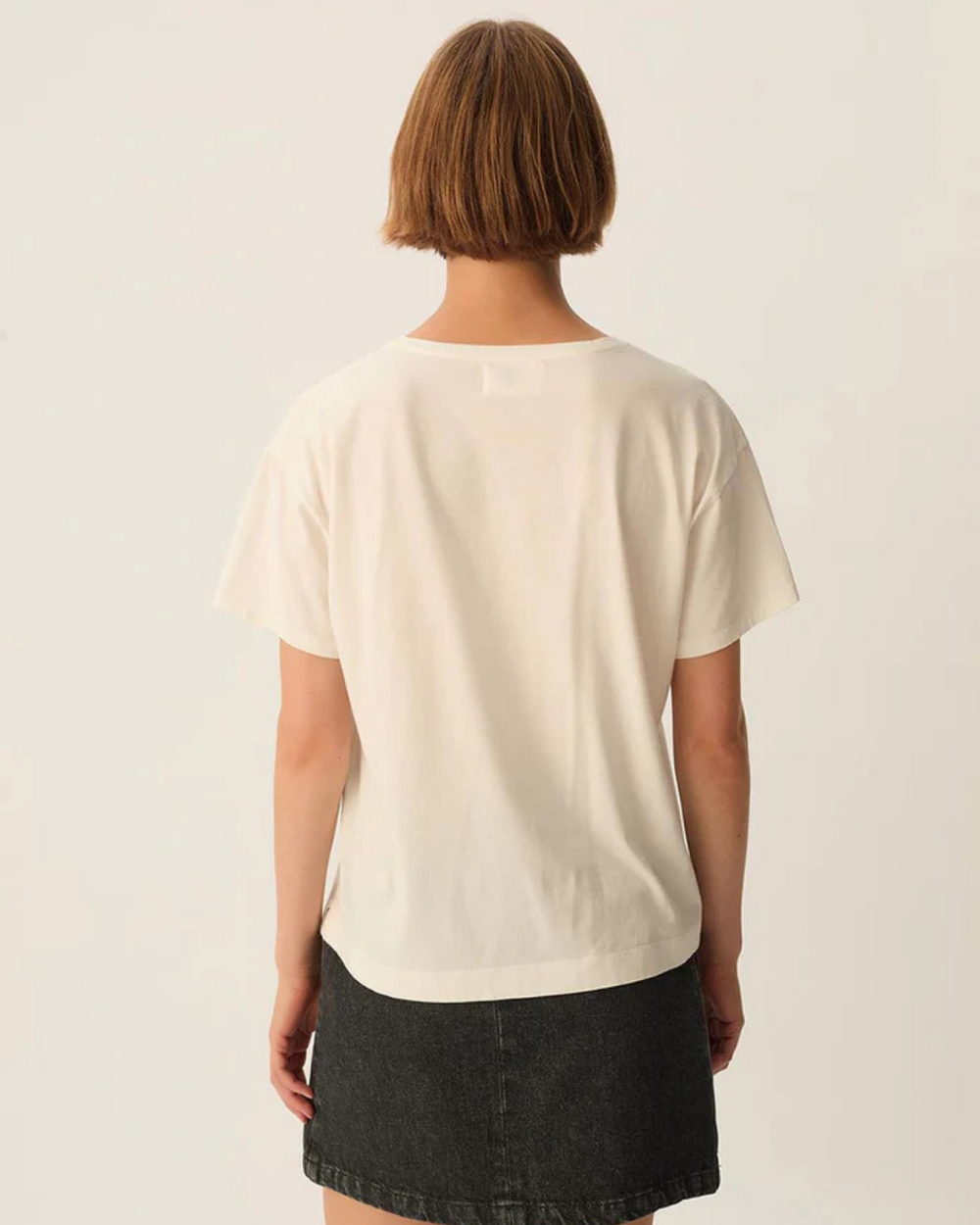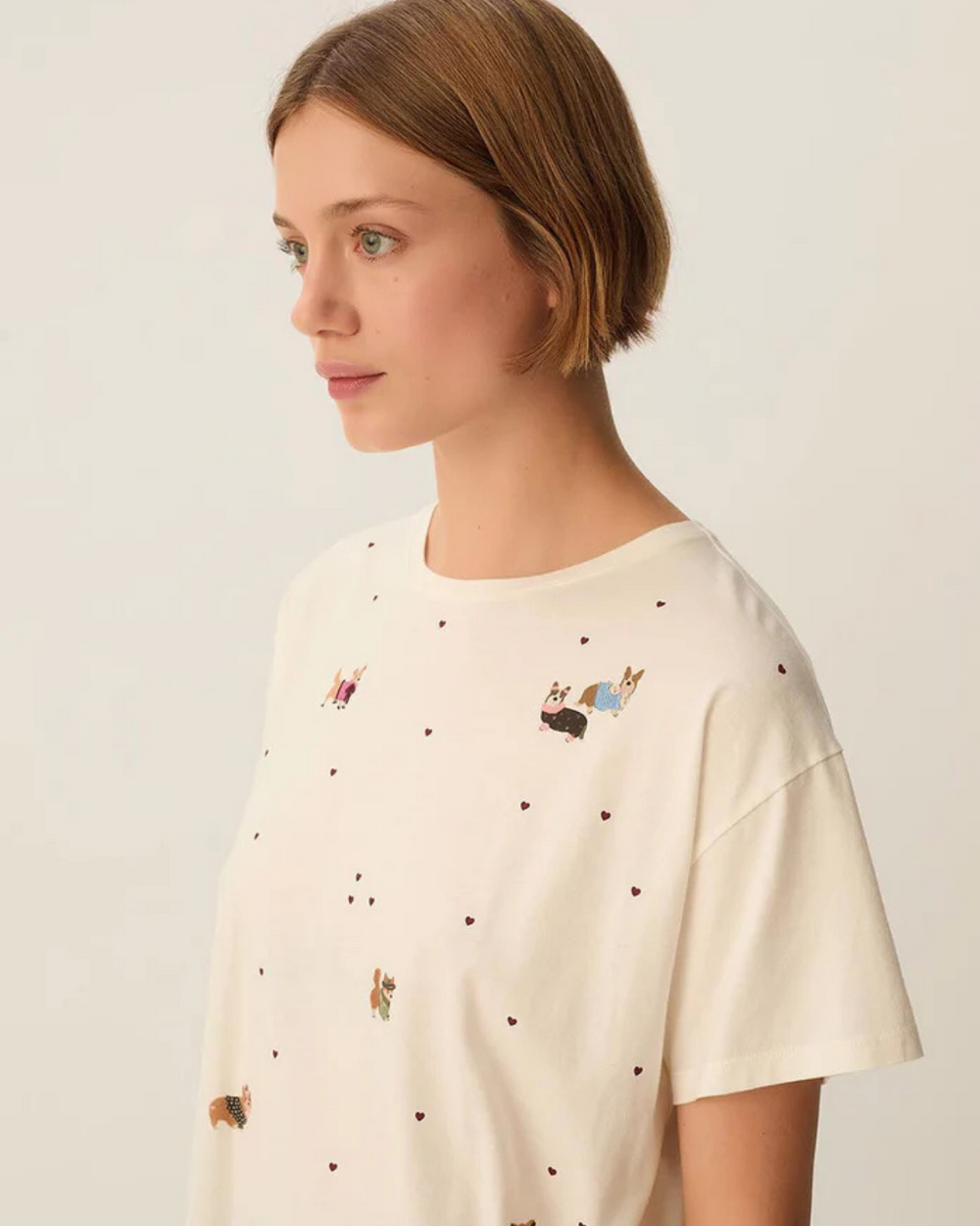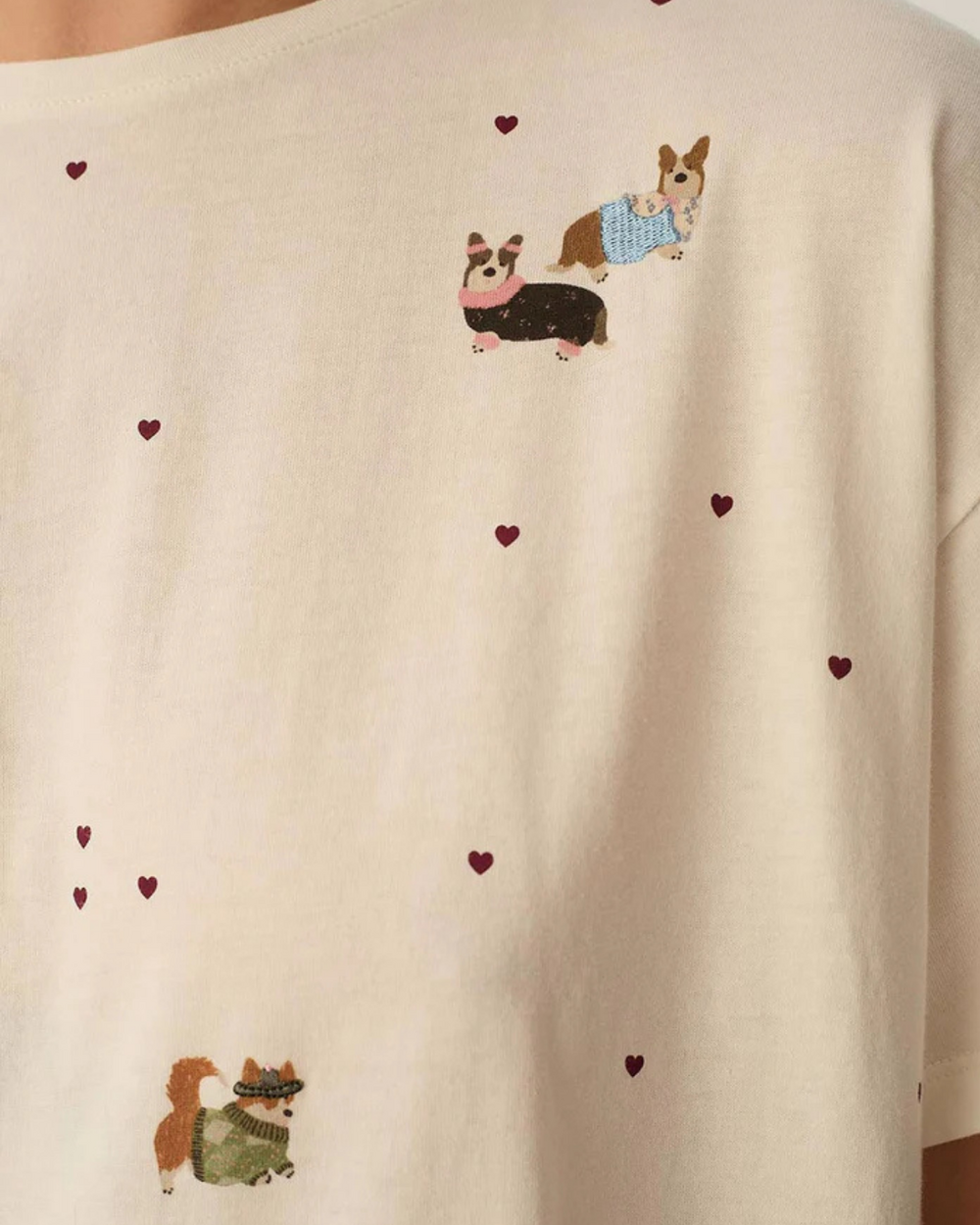 T-shirt blanc avec chiens Corgi brodés sur tout le devant.