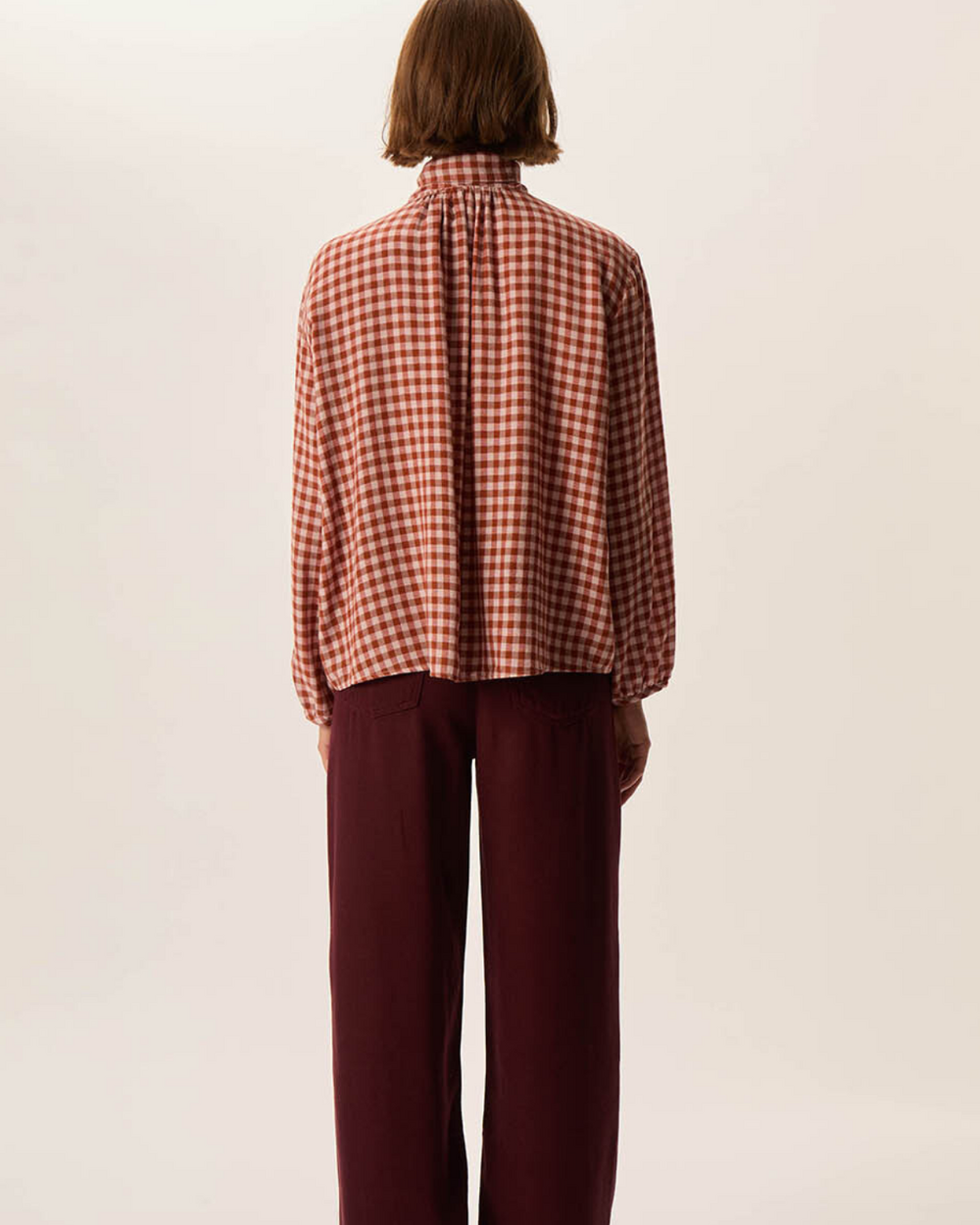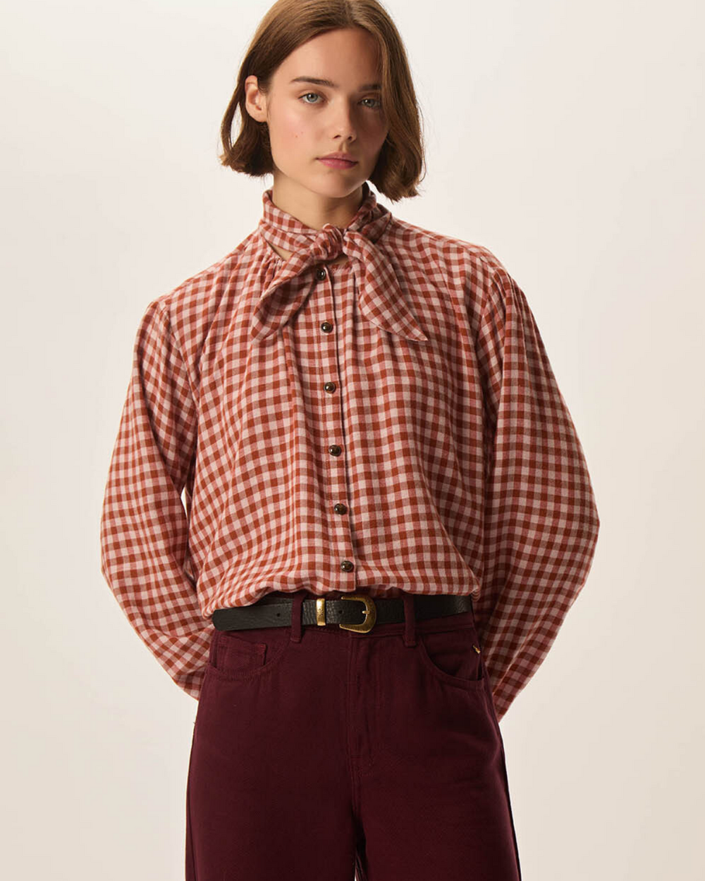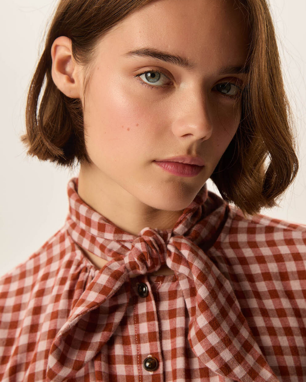 Chemisier à carreaux avec bande à nouer autour du cou.