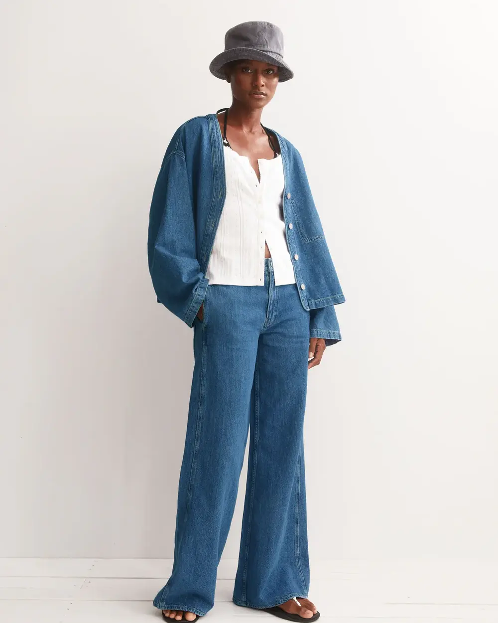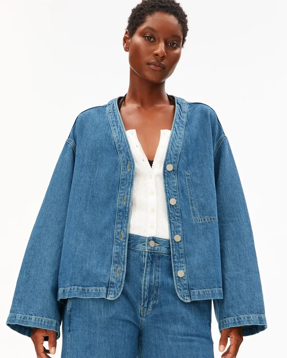 Veste sans col en denim mélangé lin. Détails de fausse poche à l'avant et vraie poche à l'arrière.