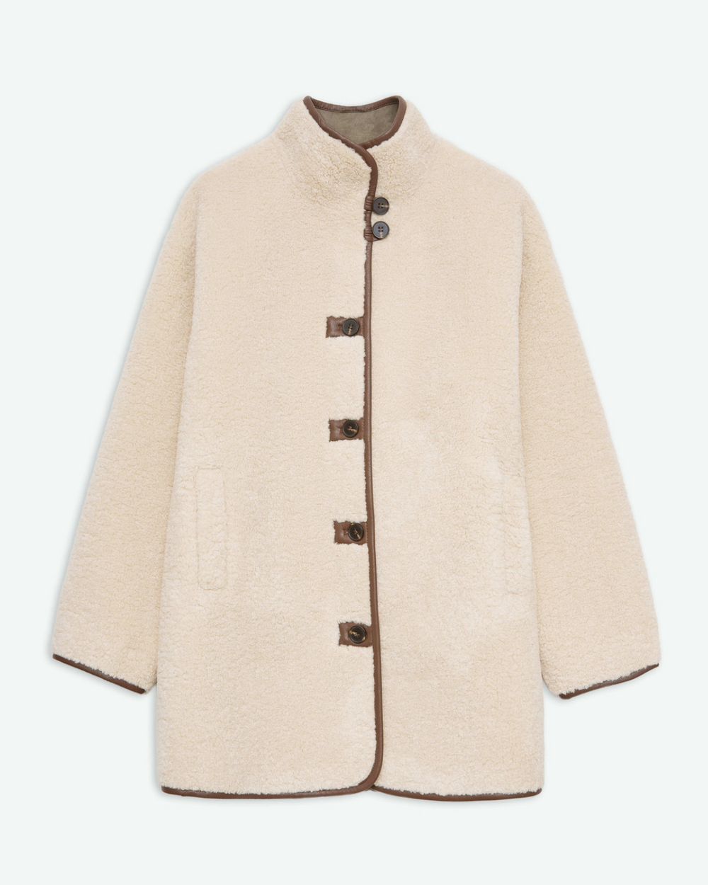 Manteau en sherpa duveteux avec détails en faux cuir.