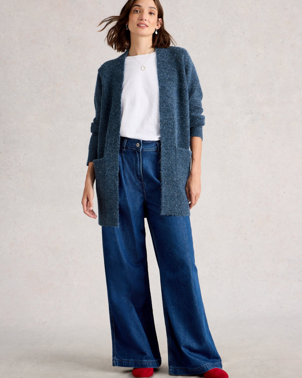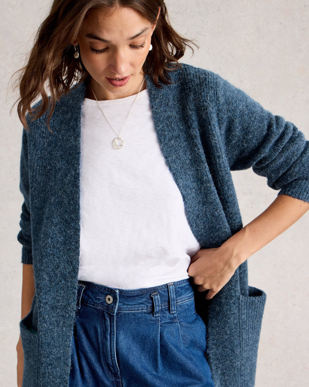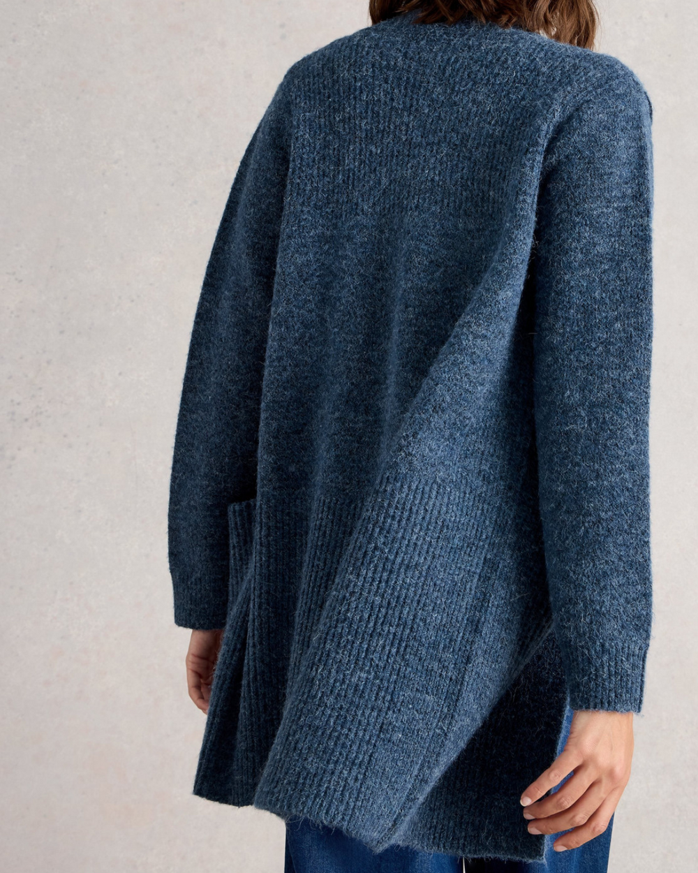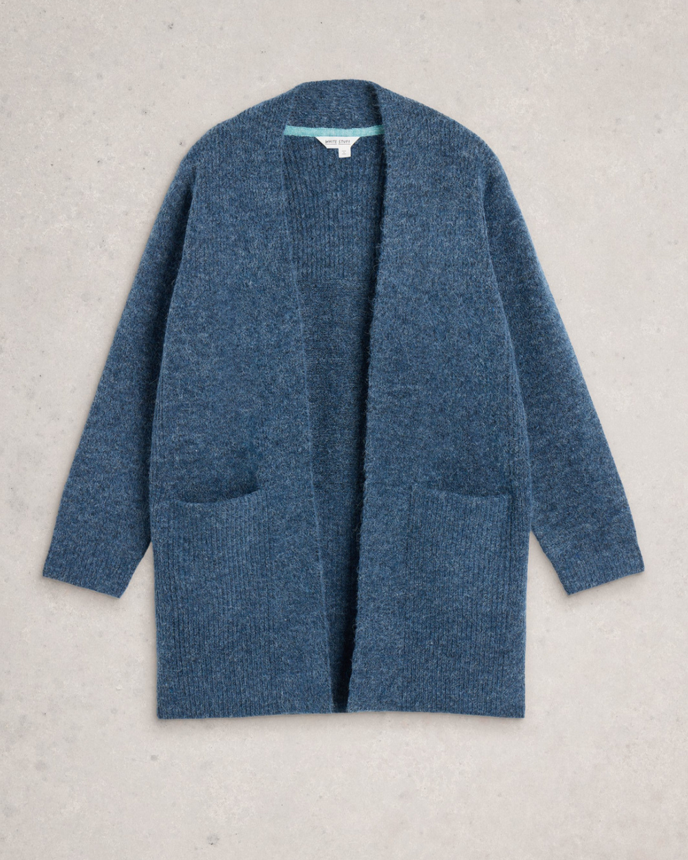 Ce cardigan douillet possède des manches longues et arrive au milieu de la cuisse.