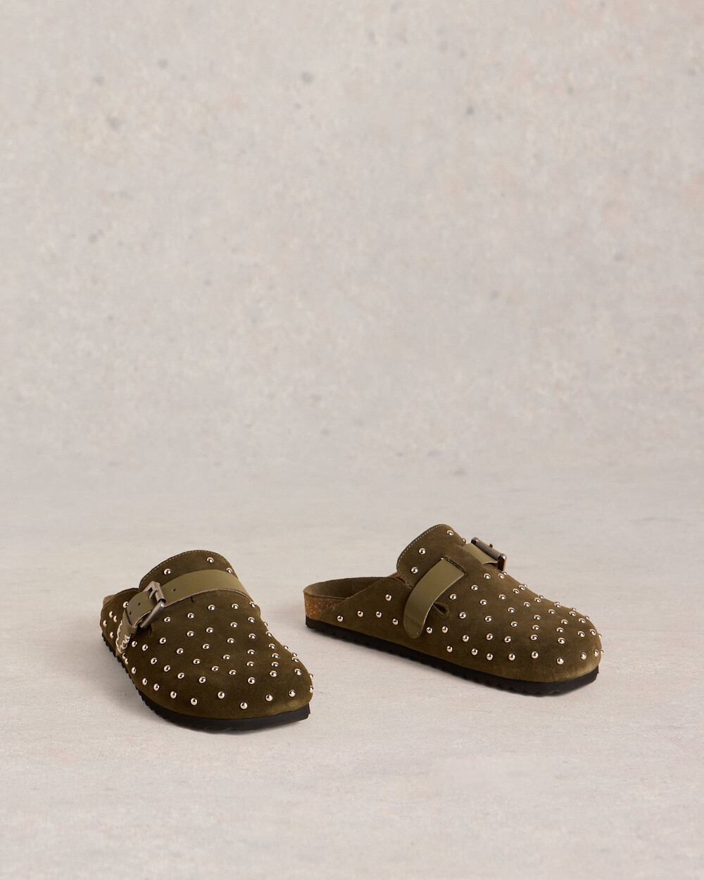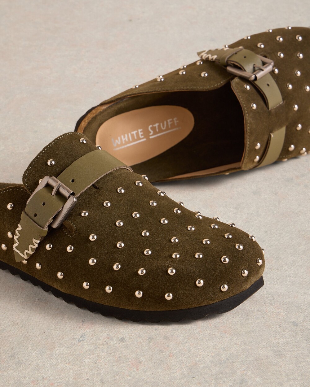 Enfilez une chaussure intérieure en suède souple et coussinée, ornée de clous. Une bride métallique réglable est également présente.