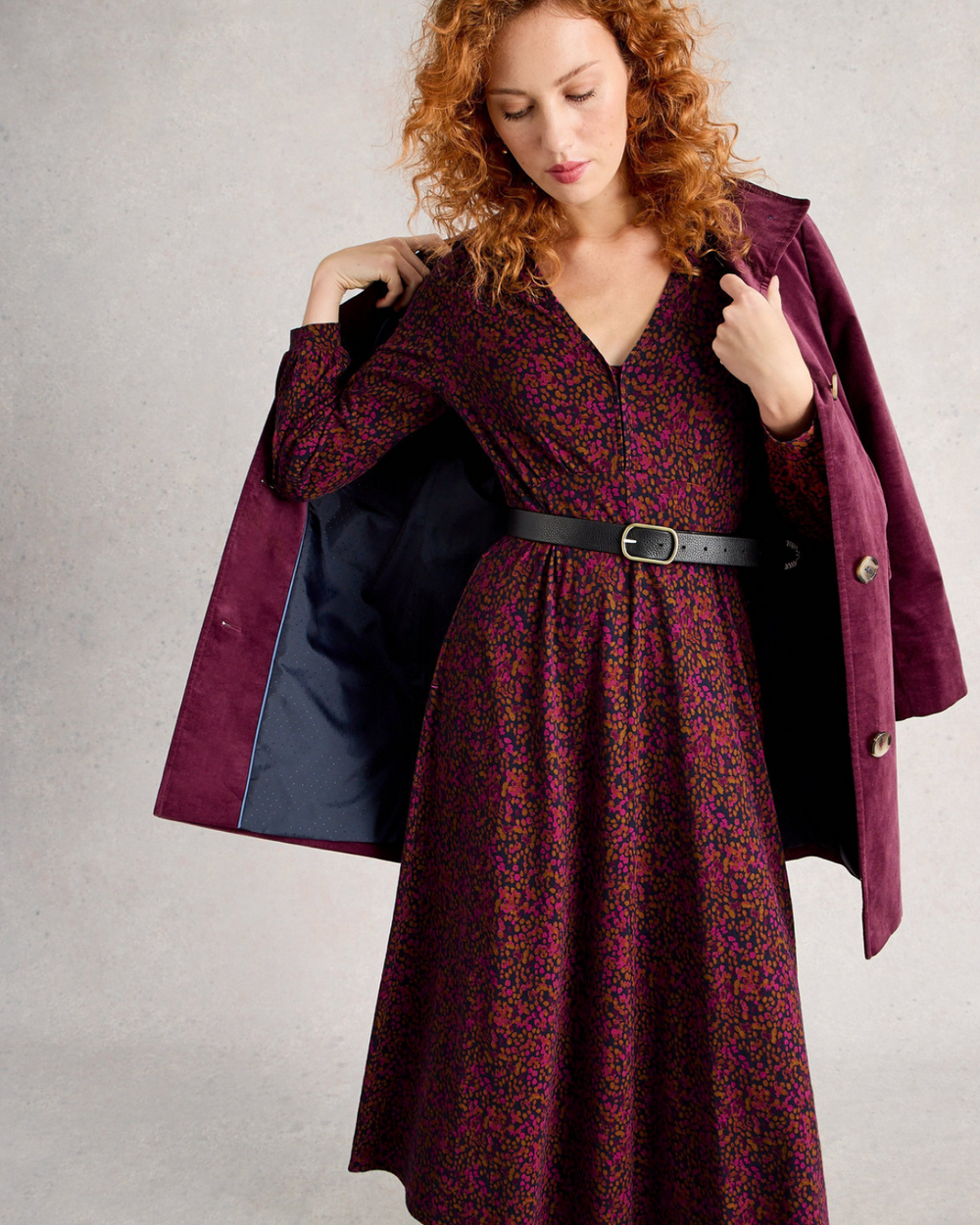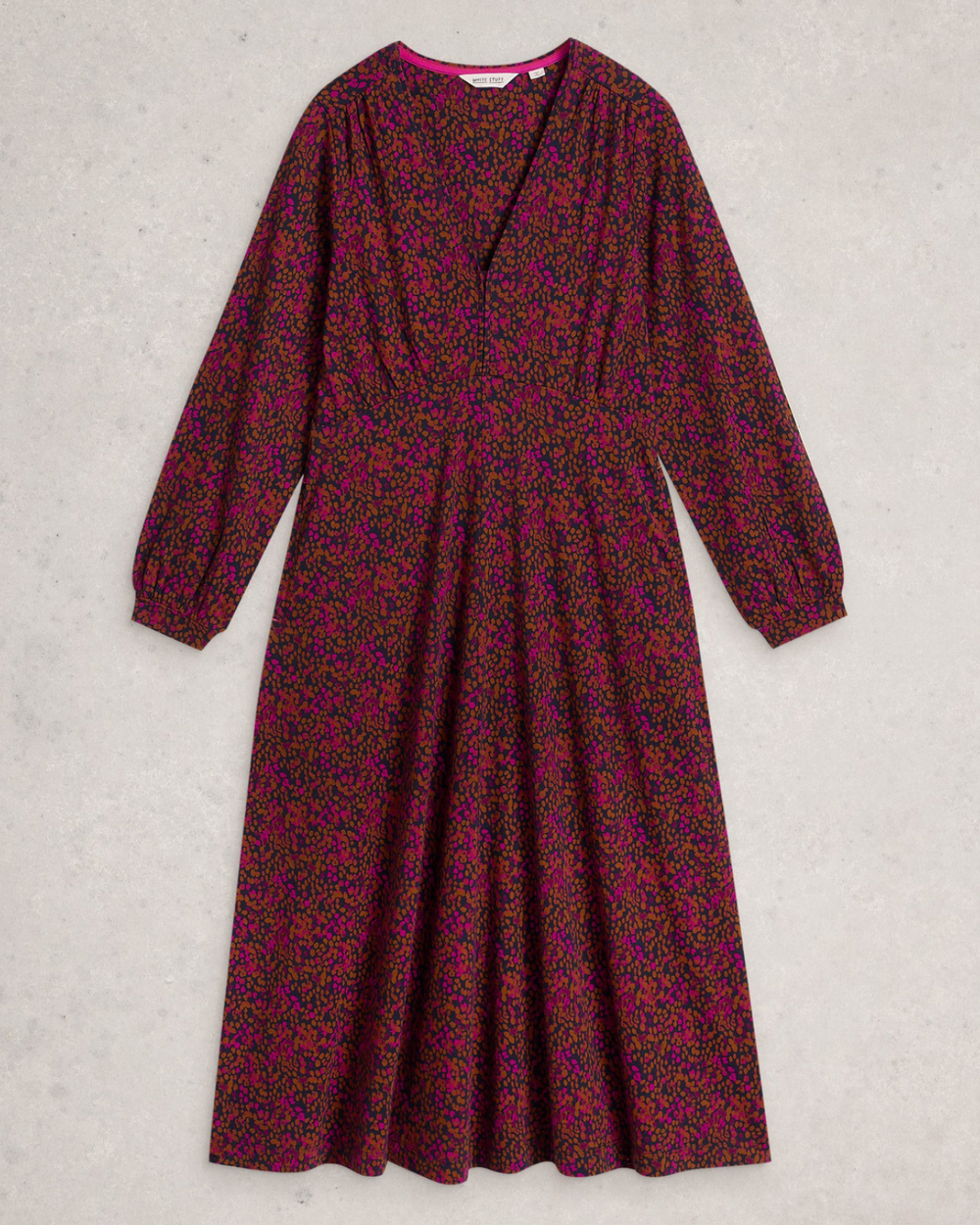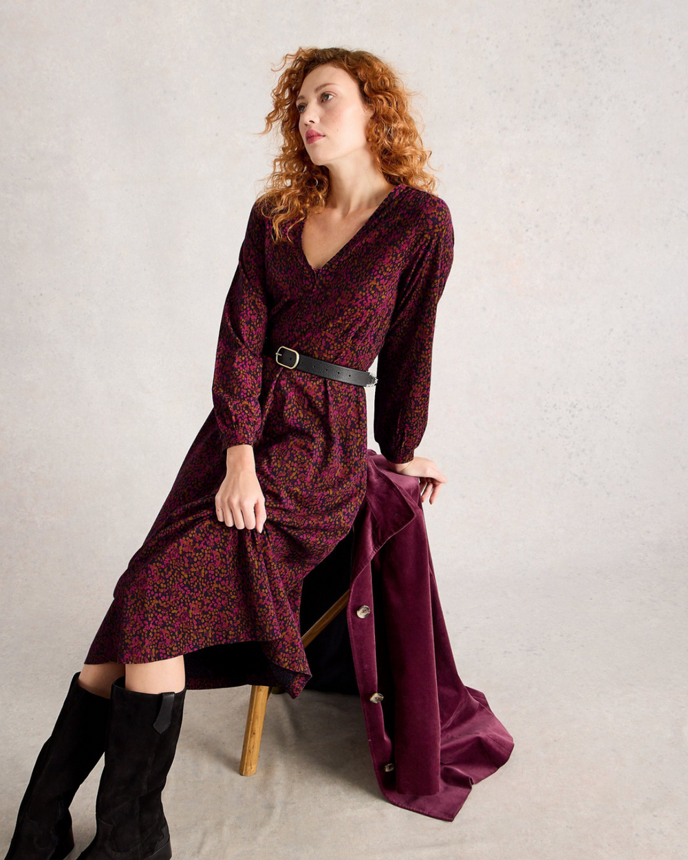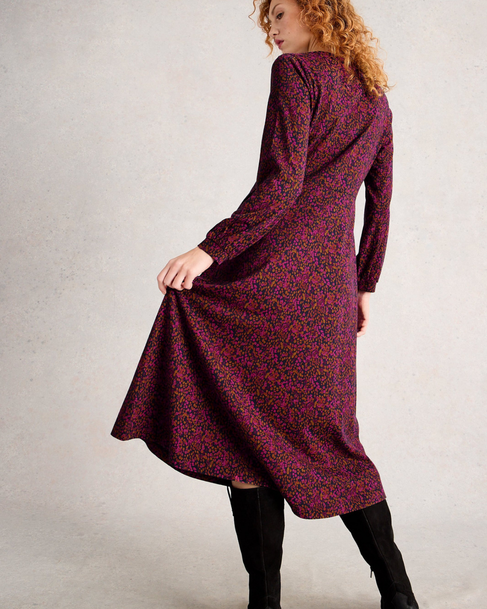 Cette robe classique à une encolure V, des manches longues et une longueur midi.