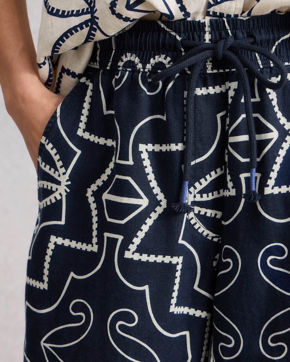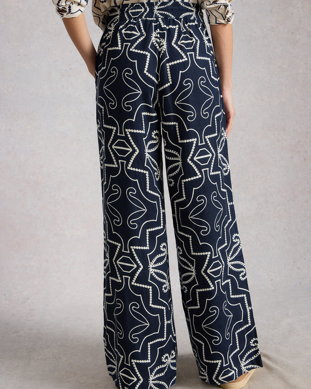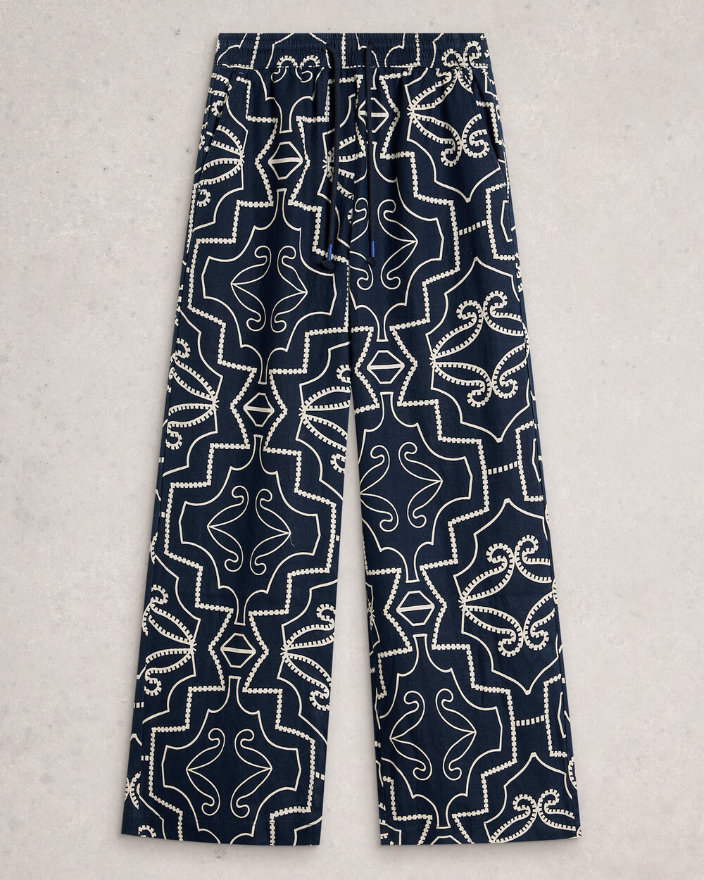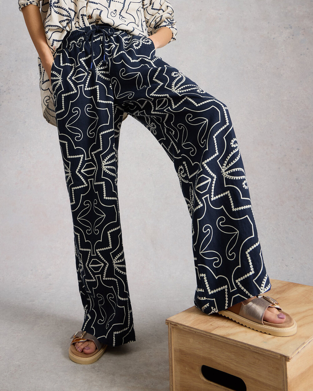 Pantalon large en lin imprimé avec taille élastique et cordon de serrage. Imprimé exclusif White Stuff.