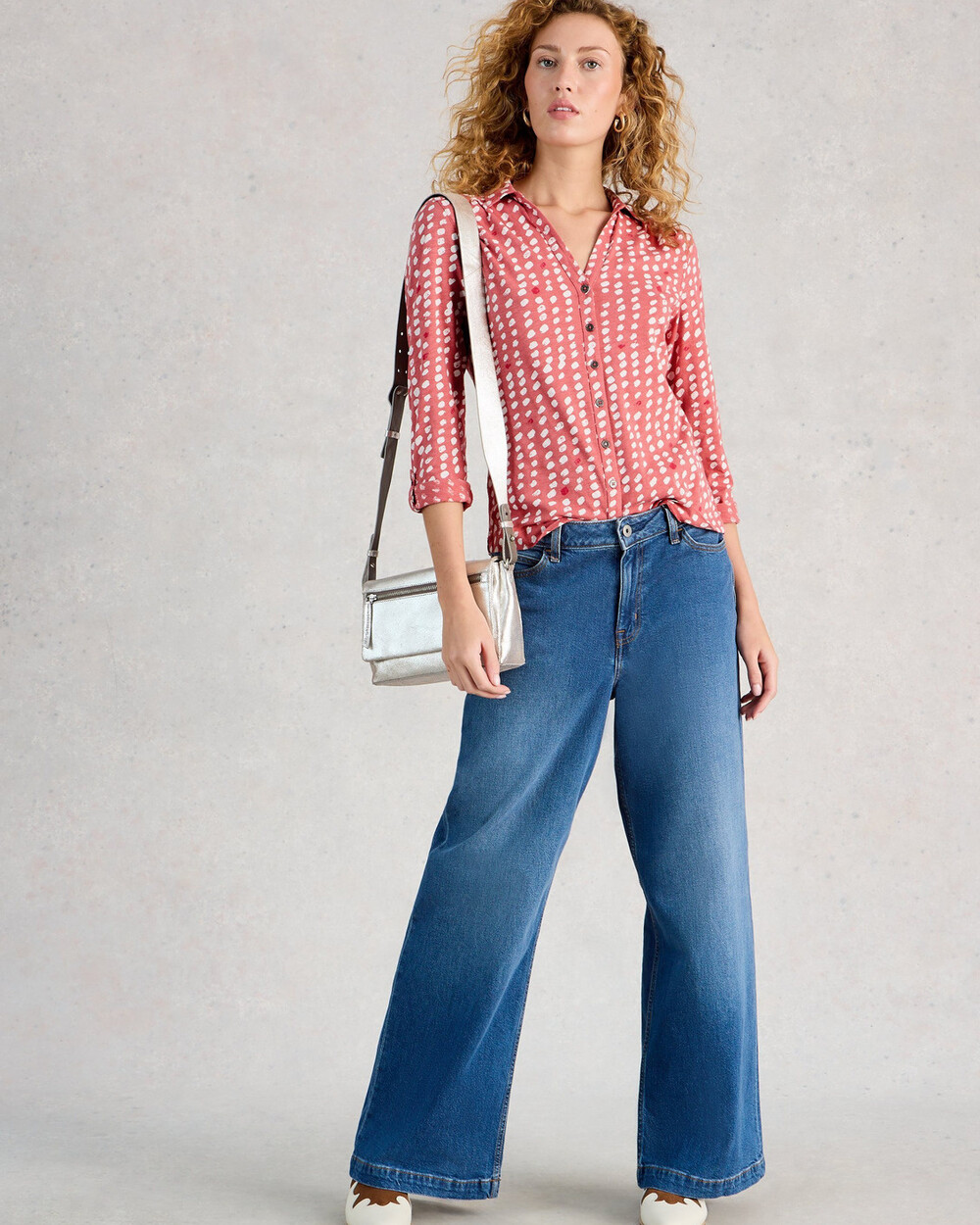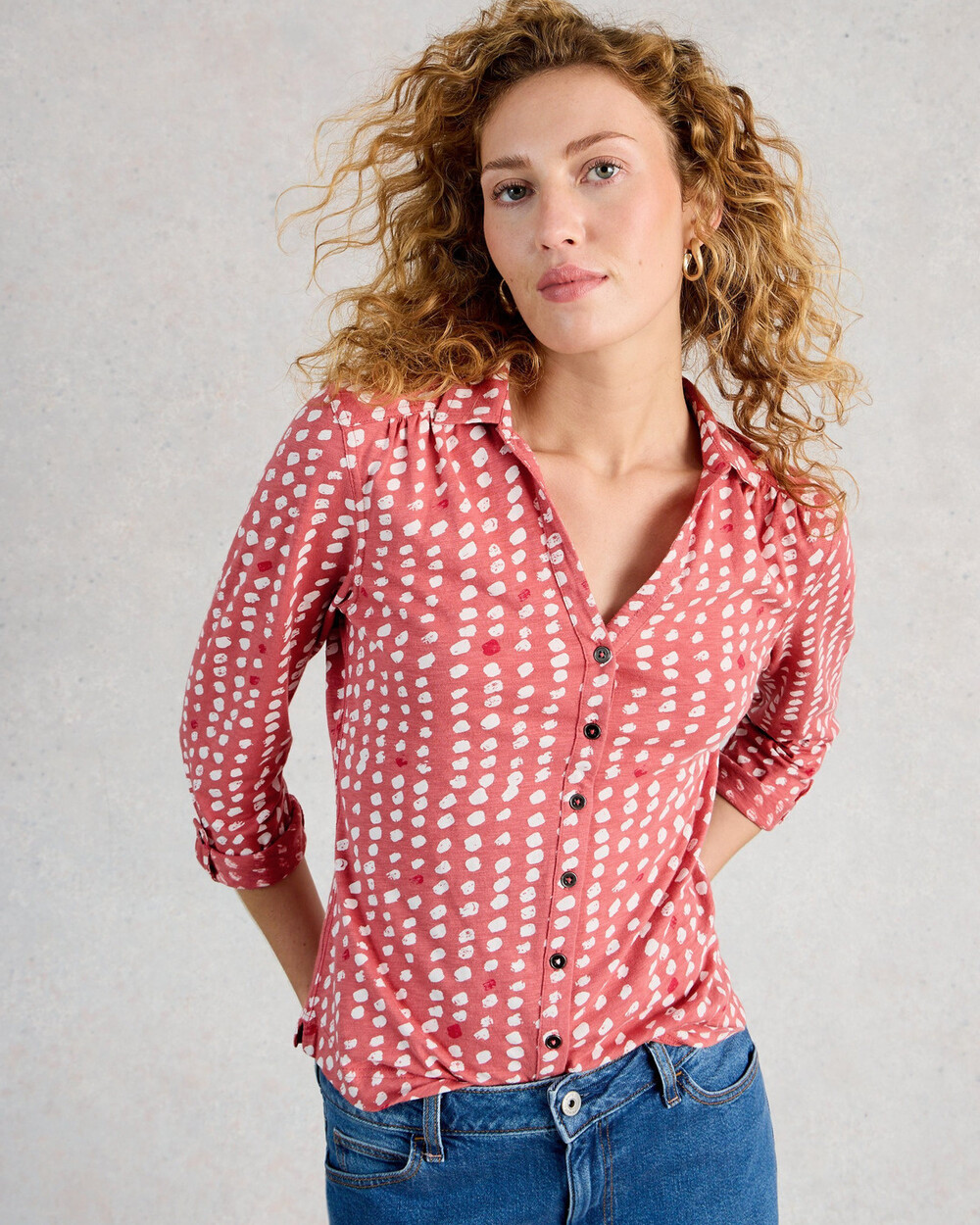 Chemise en jersey à manches longues, col en V et boutons. Imprimé exclusif White Stuff.