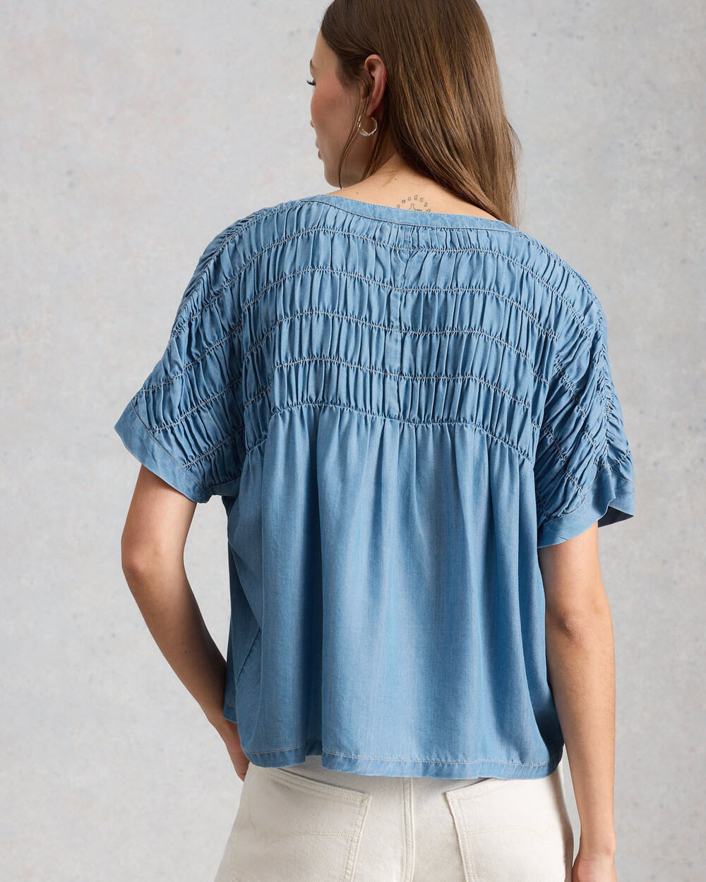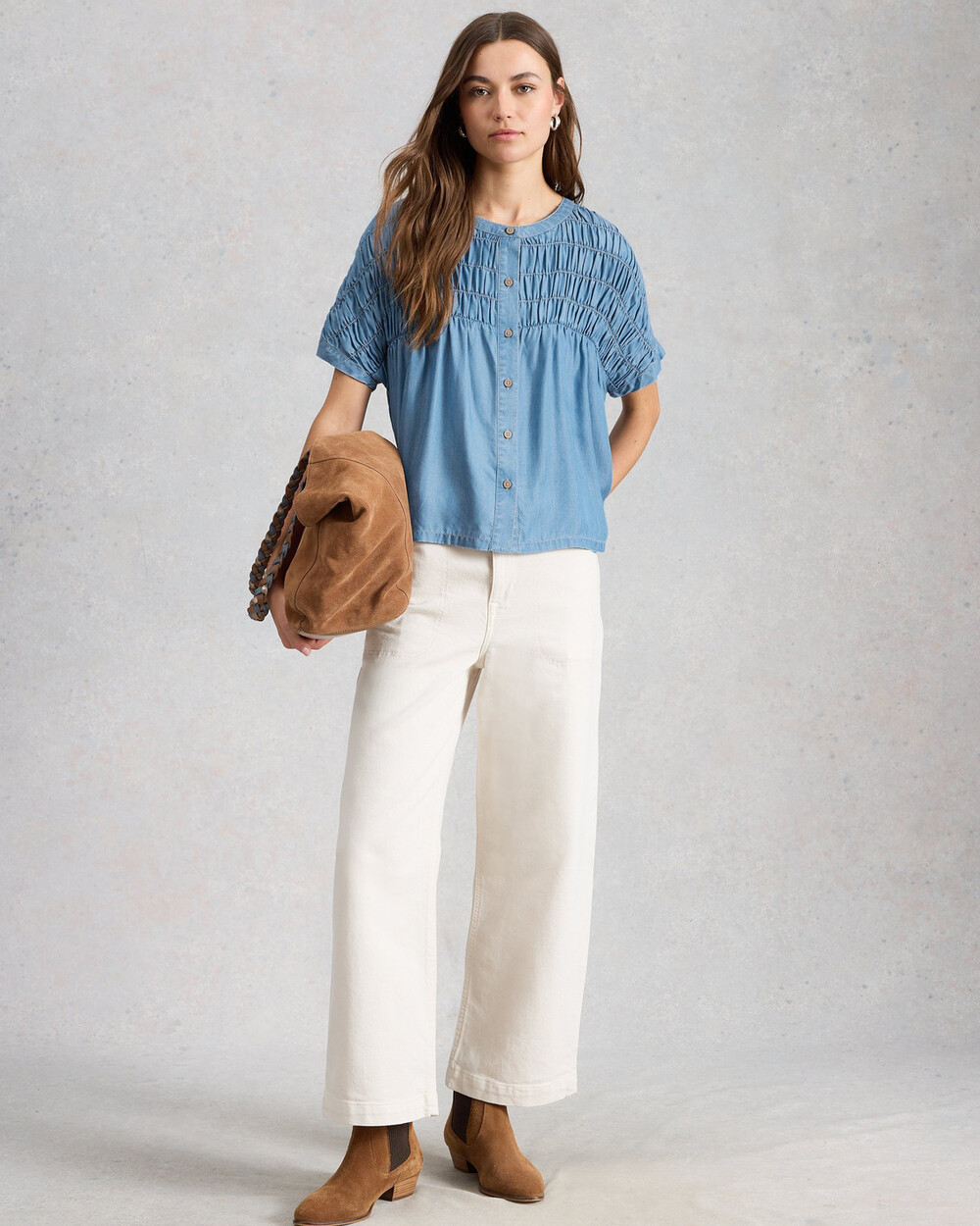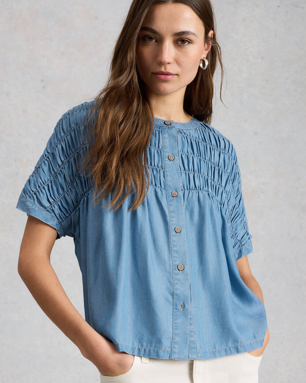 Chemise en chambray à col rond, boutons et manches courtes, avec traitement froissé.