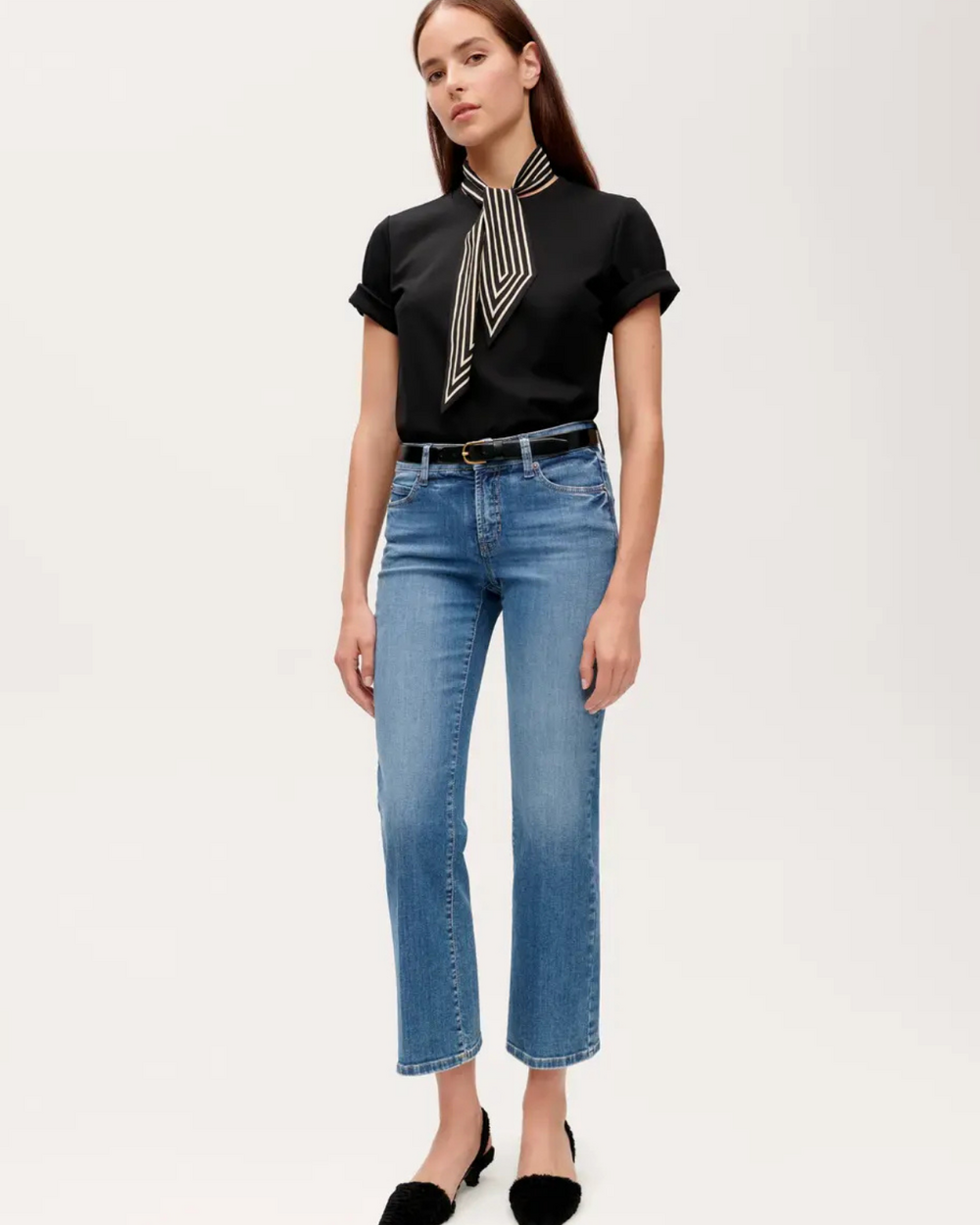 Jeans évasé raccourci Paris easy kick. Le denim en coton biologique convainc par sa durabilité et sa coupe parfaite et confortable grâce au superstretch.