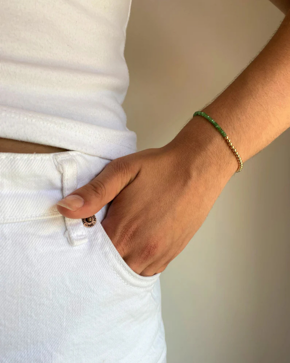 Bracelet 6" avec pierres de grenat vert et billes de 3mm en gold-filled. Rallonge de 1.5".