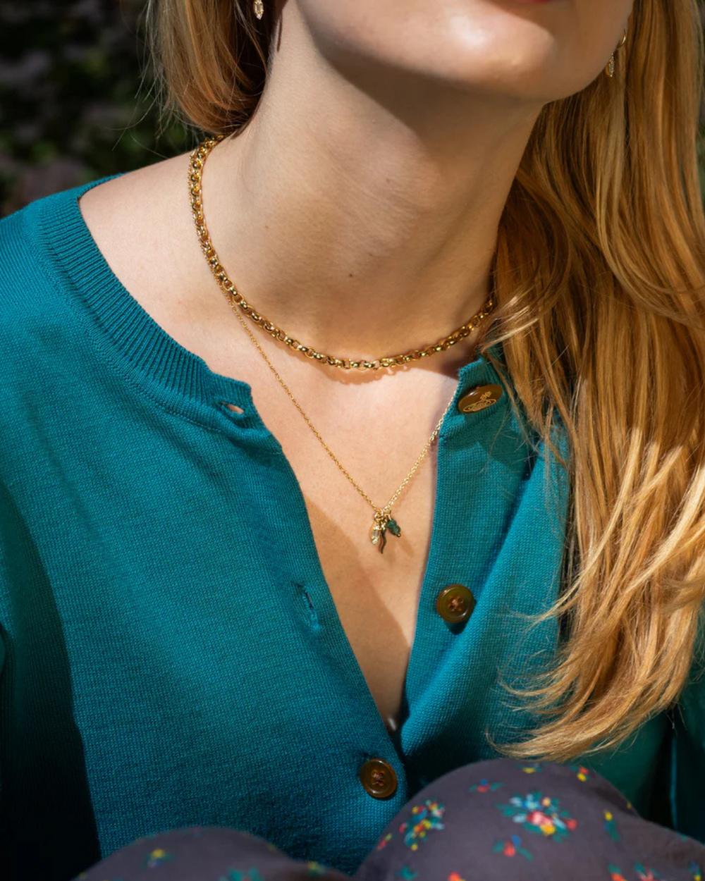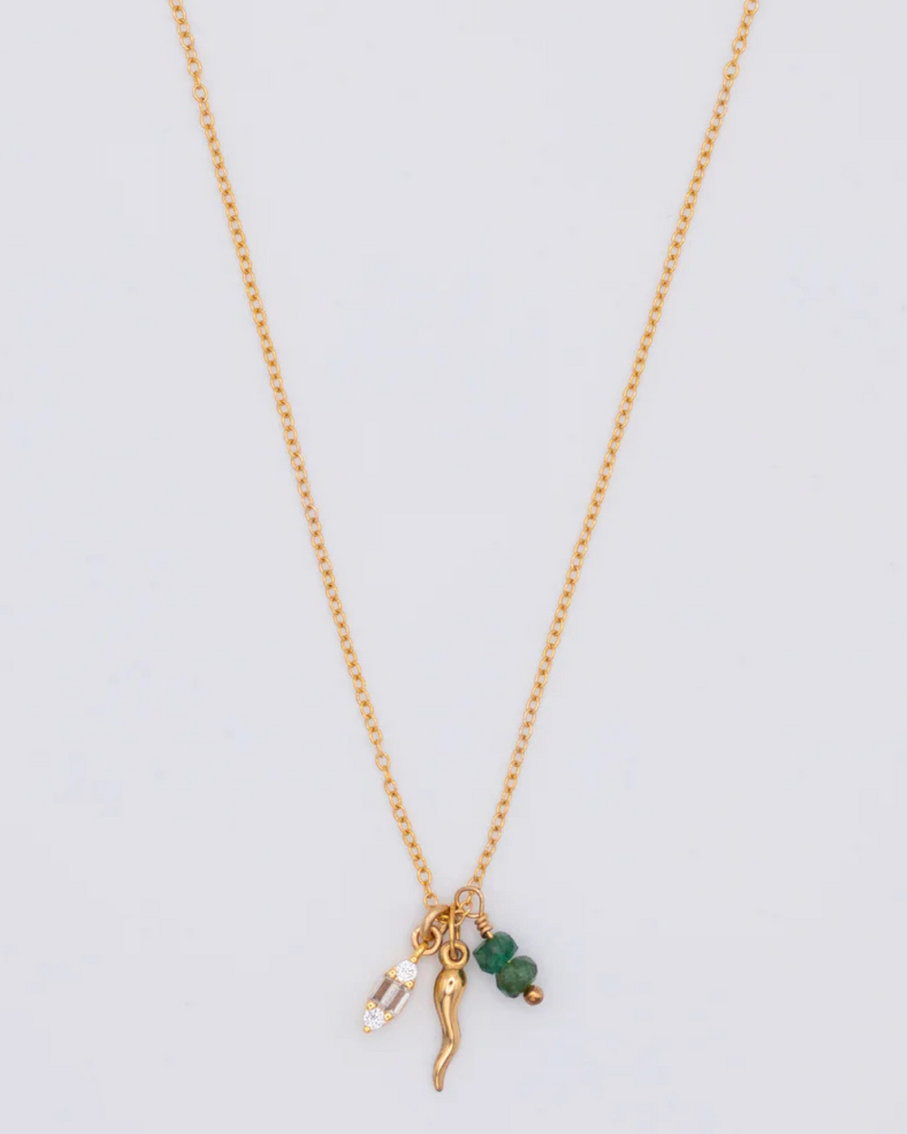 Collier 18" en or rempli avec trio de breloques: pierres d'émeraude, corne en or rempli, losange en zircon. Avec rallonge de 2.5".