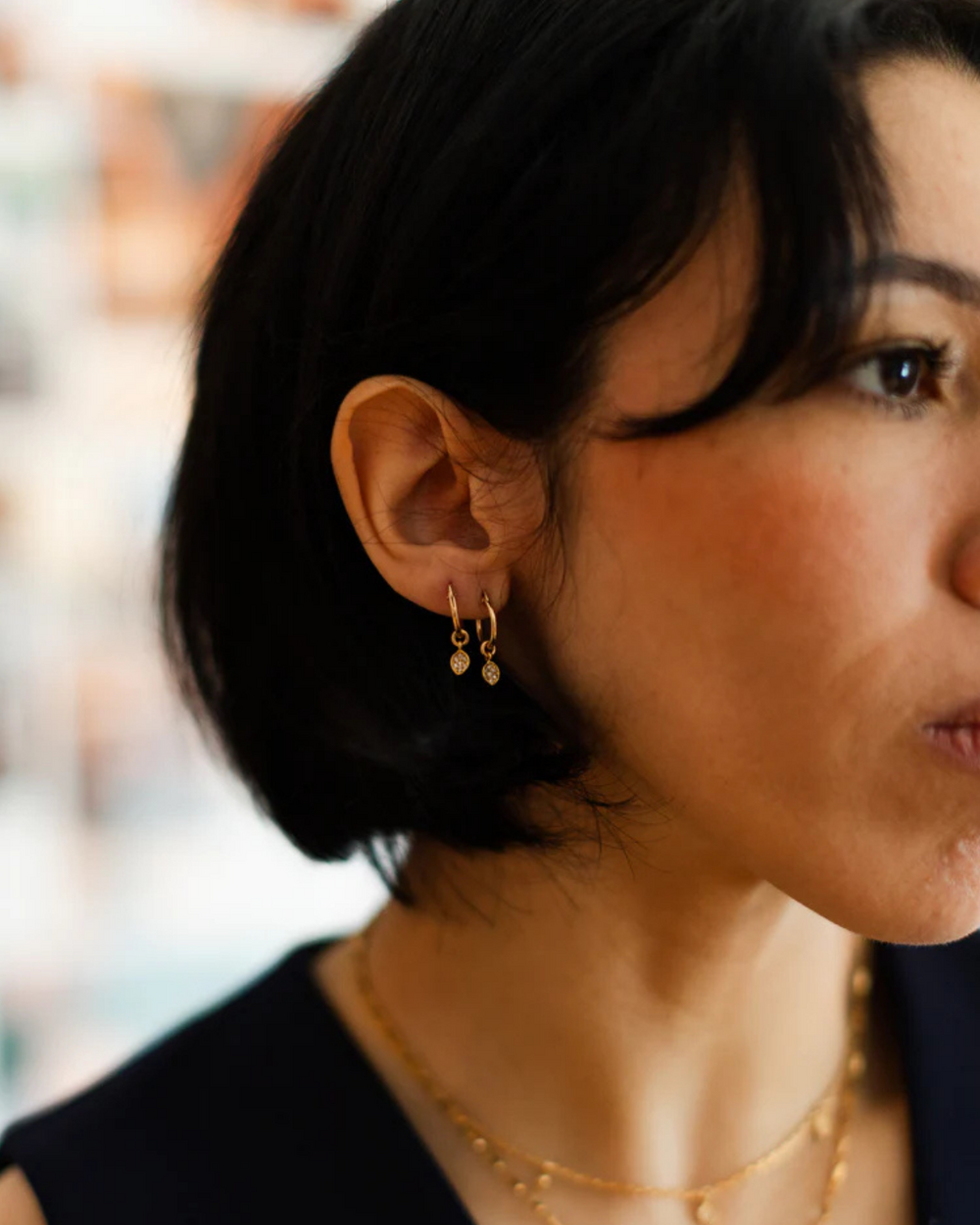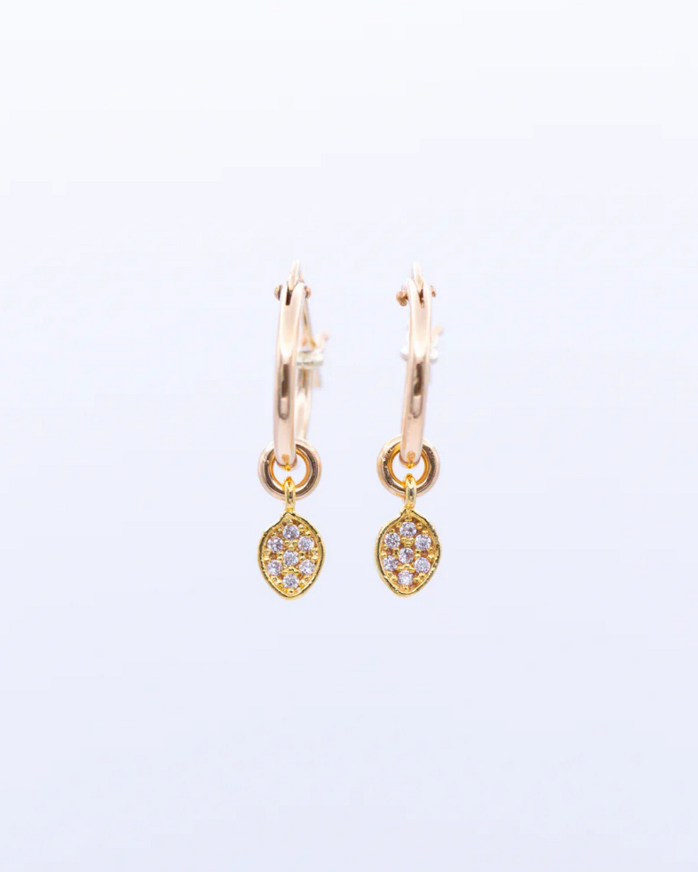 Petits anneaux (12mm) en gold-filled avec mini gouttes serties de zircons. Longueur totale de la boucle: 21mm