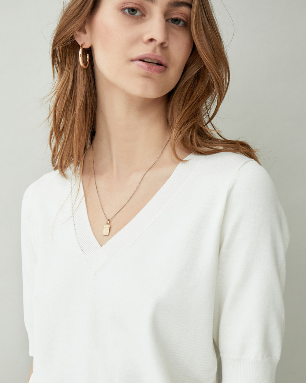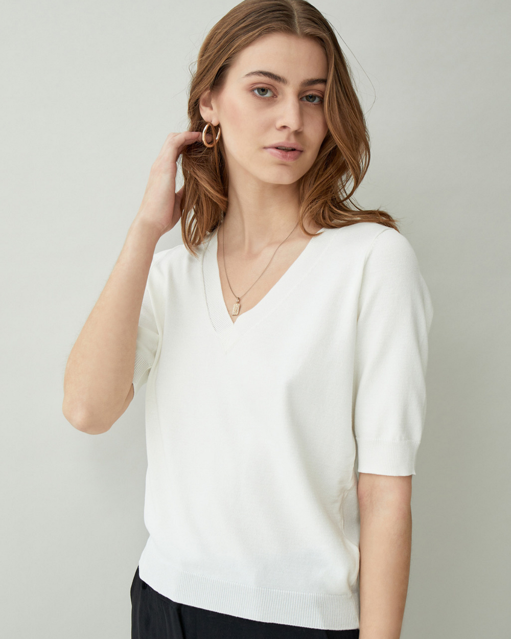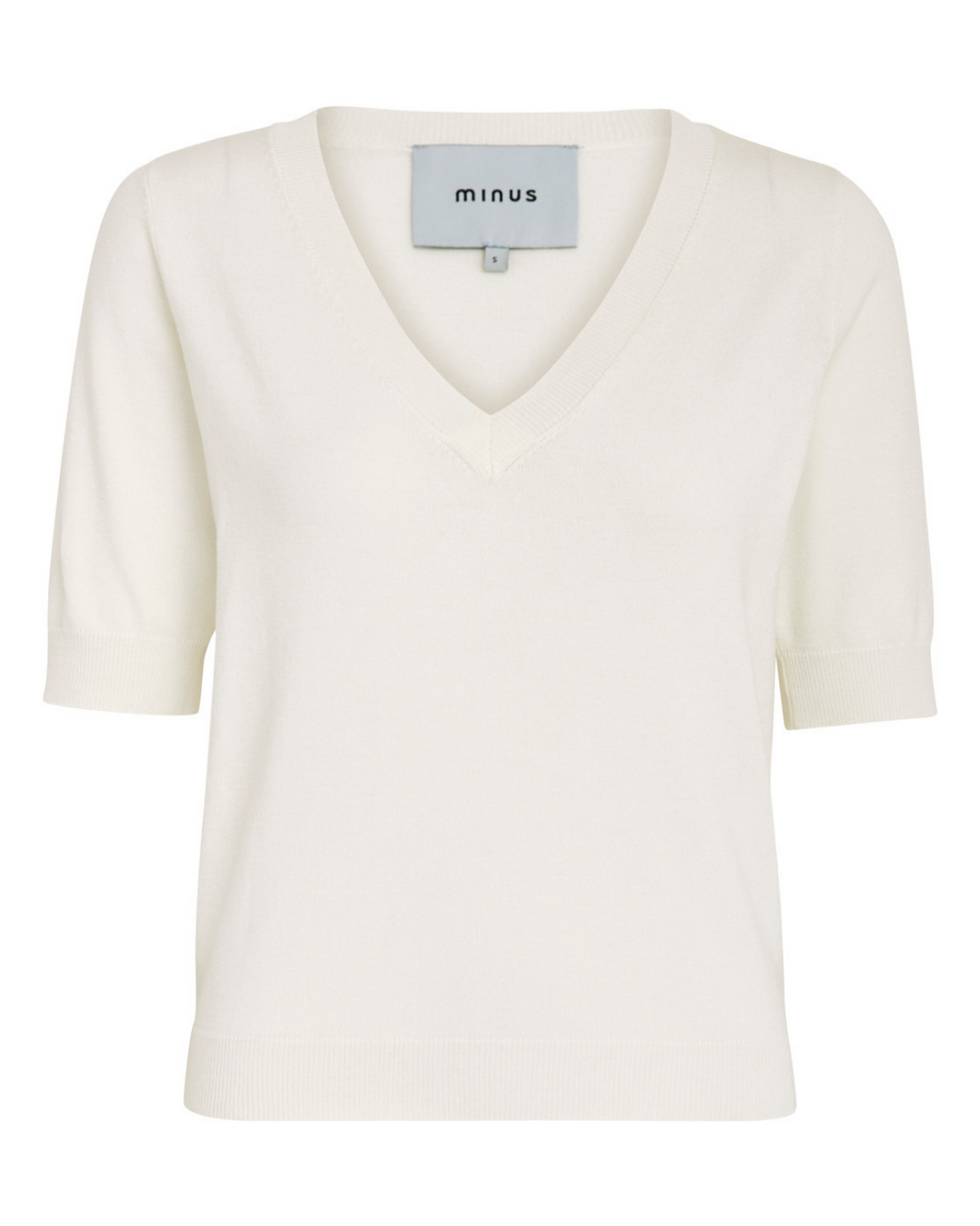 Le t-shirt en maille Milla est confectionné à partir d'un mélange d'Eco Vero, une alternative durable à la viscose, et d'élasthanne, ce qui lui confère une qualité extensible et douce. Ce t-shirt a des manches courtes et un décolleté en V flatteur.
