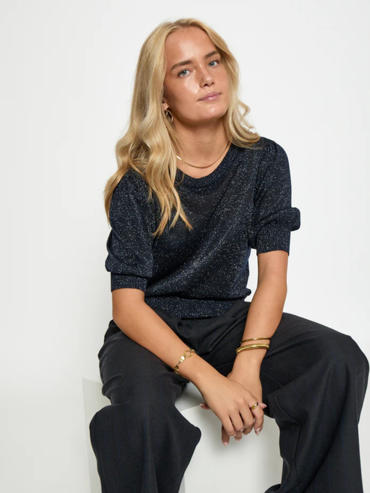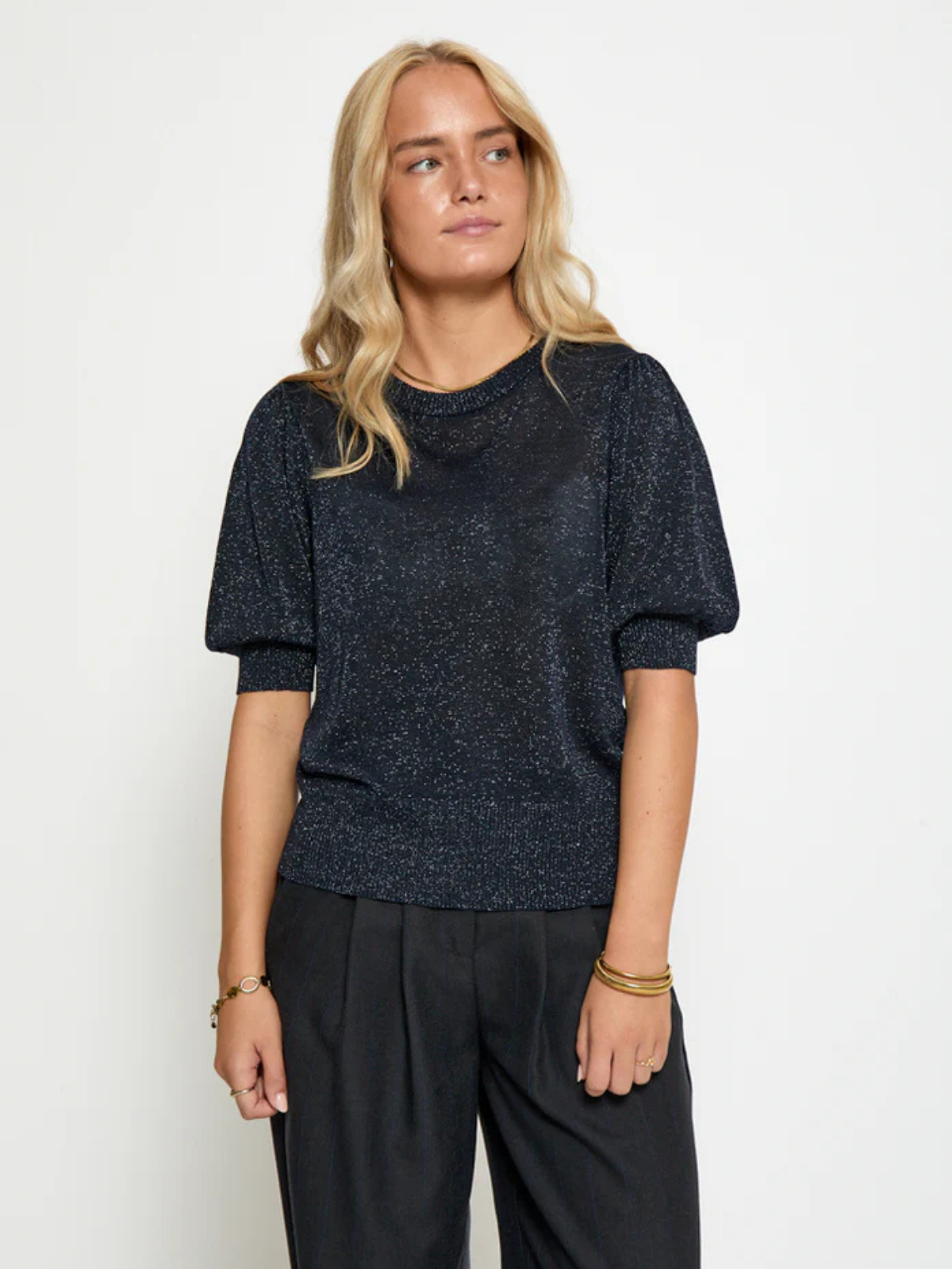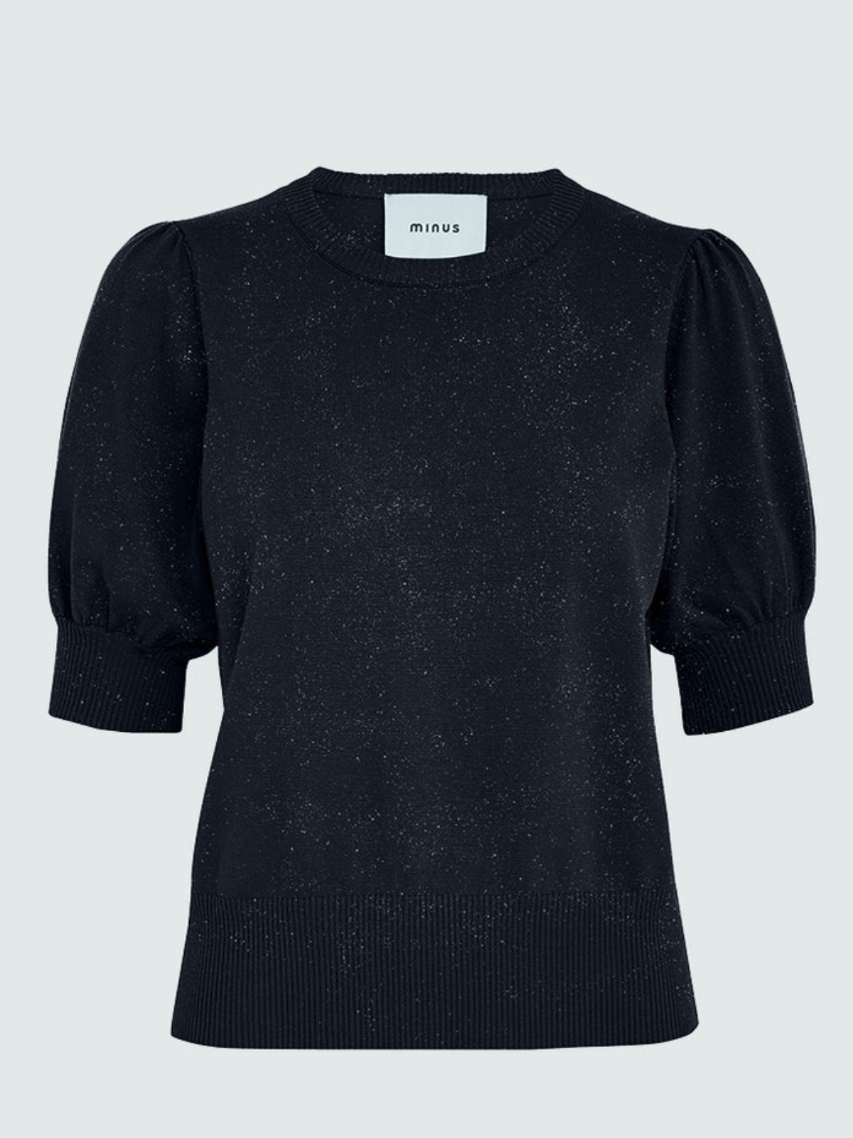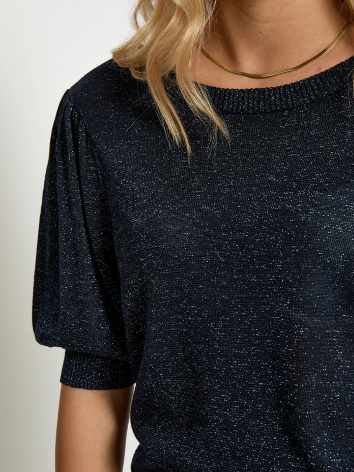 Le pull Liva est confectionné à partir d'un mélange d'Eco Vero, une alternative durable à la viscose, et de fibres métalliques, qui lui confèrent une texture légère et brillante. Ce pull possède une encolure ronde, des manches courtes bouffantes et des bords côtelés.