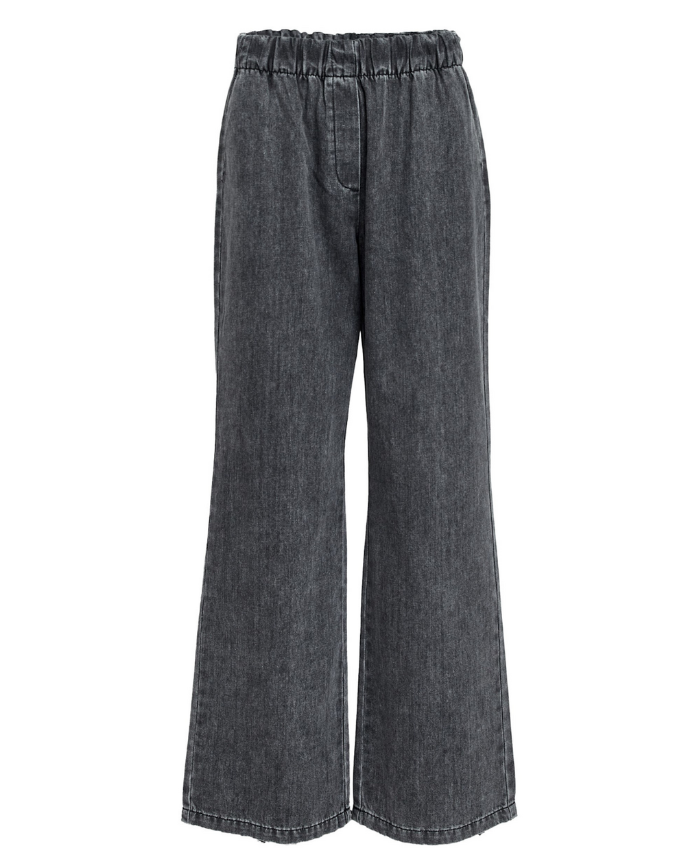 Jean extensible à jambe large, poches latérales et ceinture élastique.
