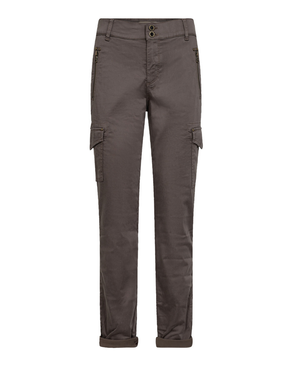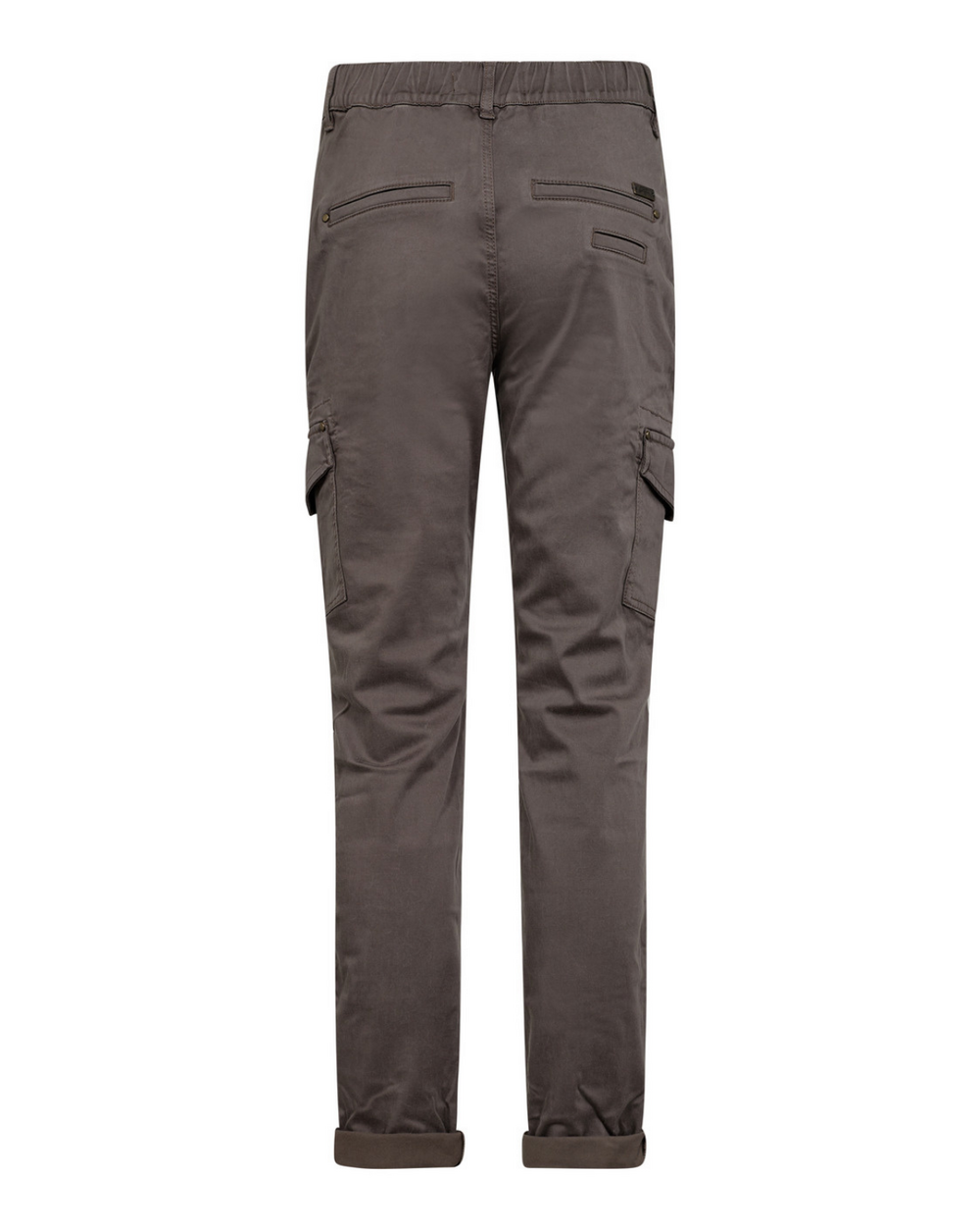 Slim cargo pants with side flap pockets on each side and zippered pockets on the front.