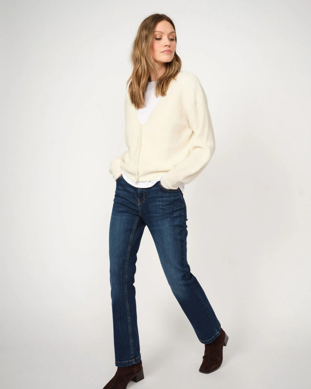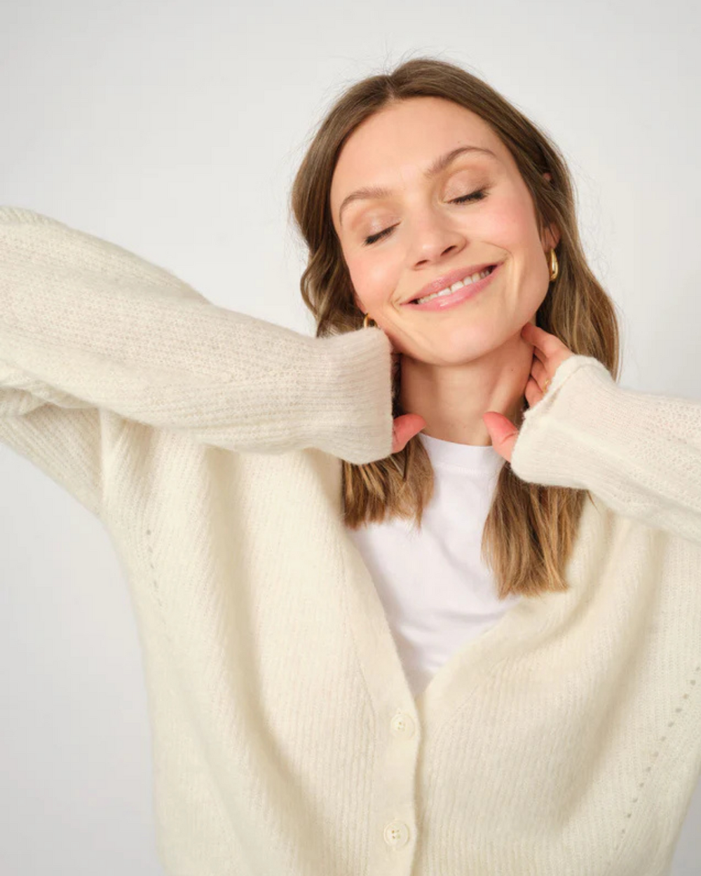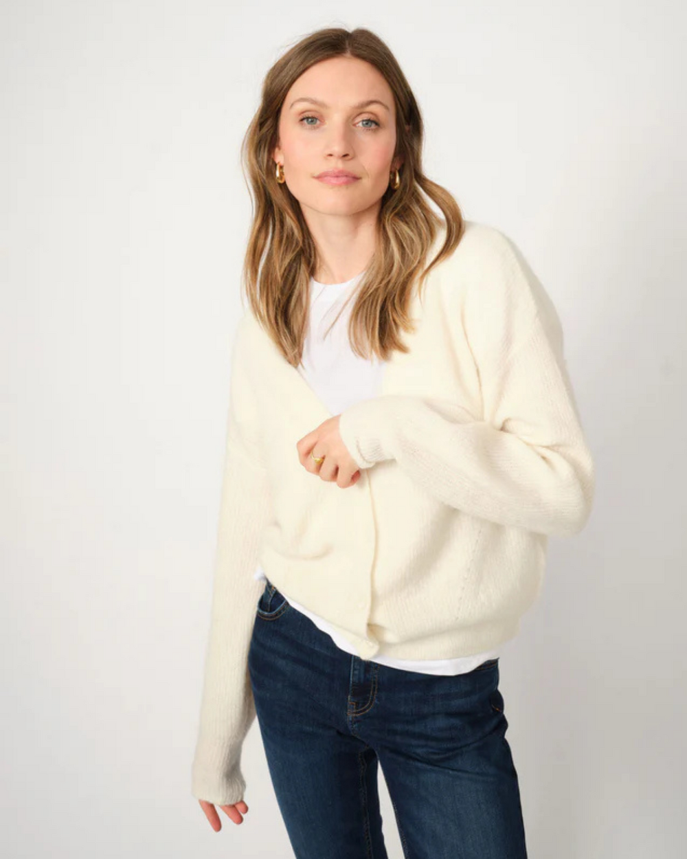 Button-up cardigan with a v-neck and raglan sleeves, made from a soft wool and alpaca blend.
