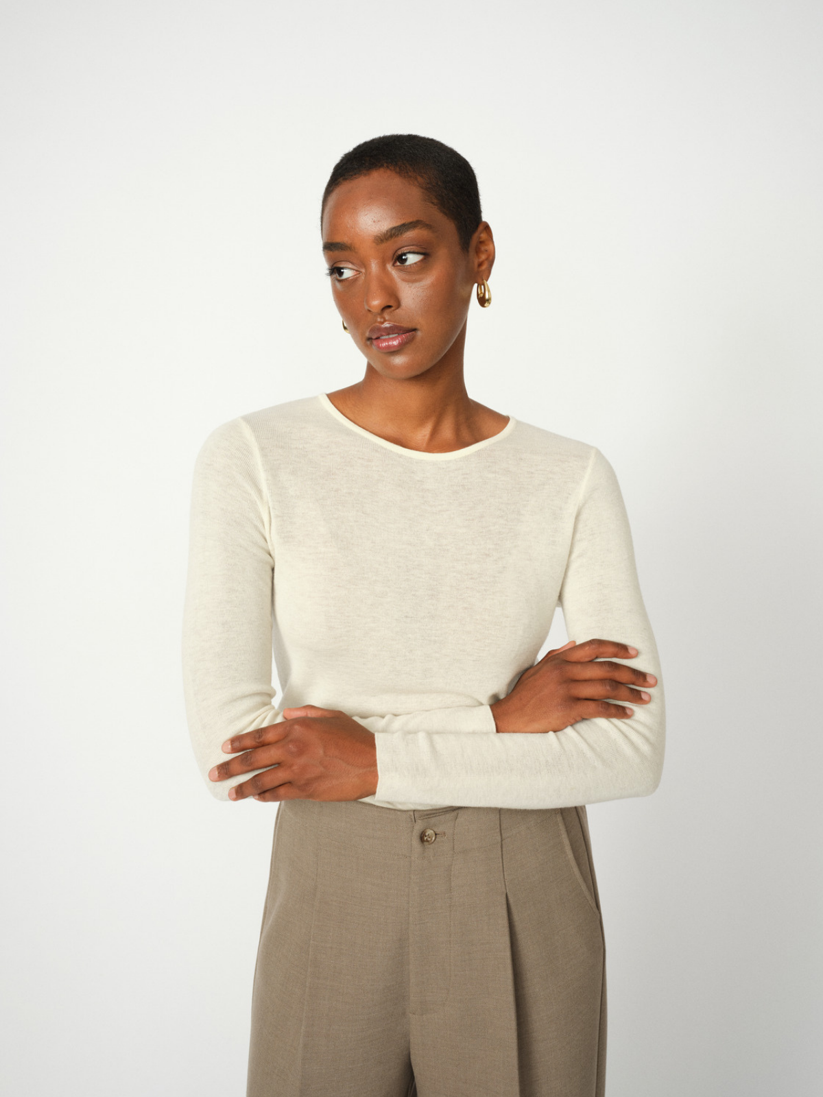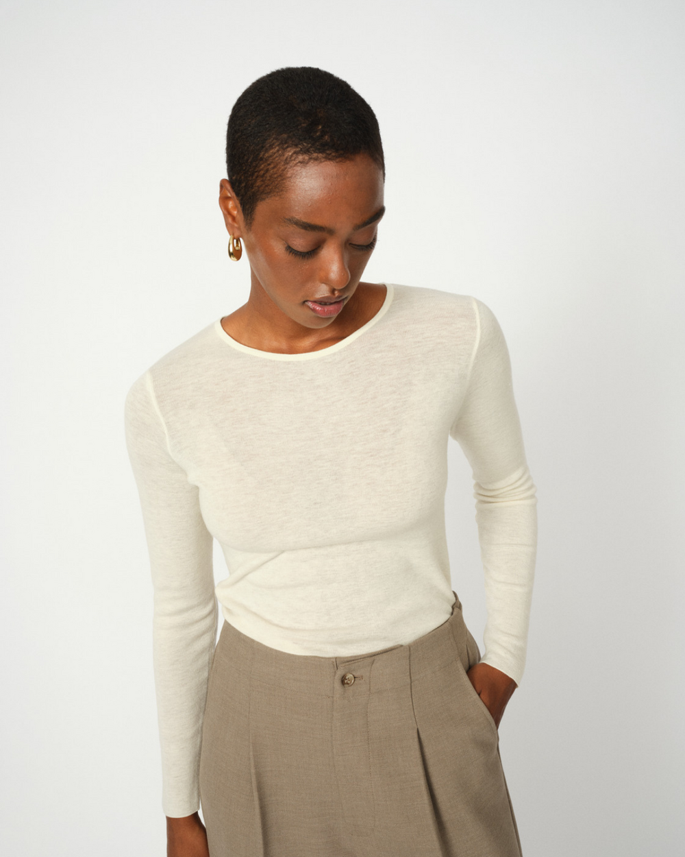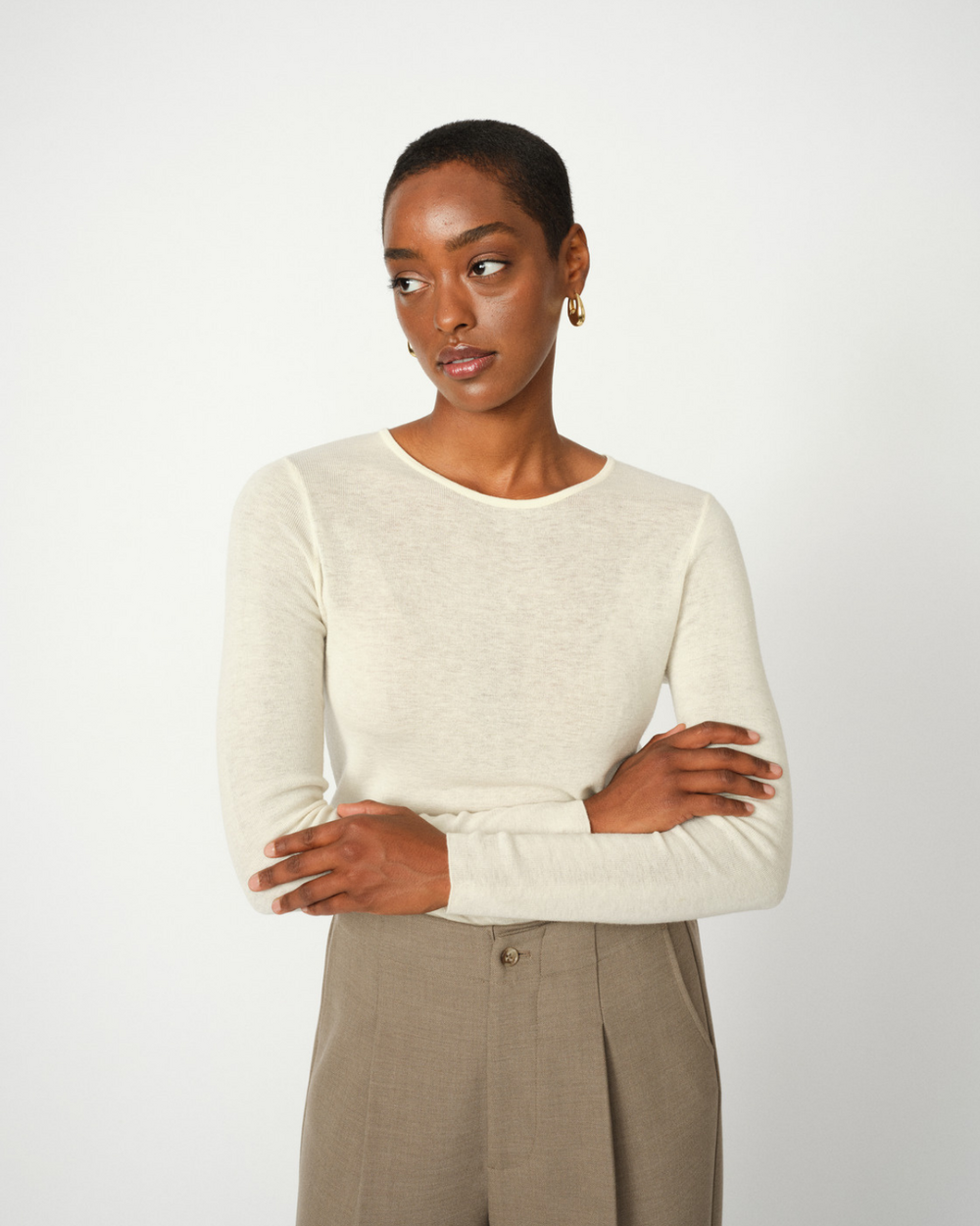 Super soft round neck longsleeve knit in a lightweight wool quality which matches to all cold season outfits.