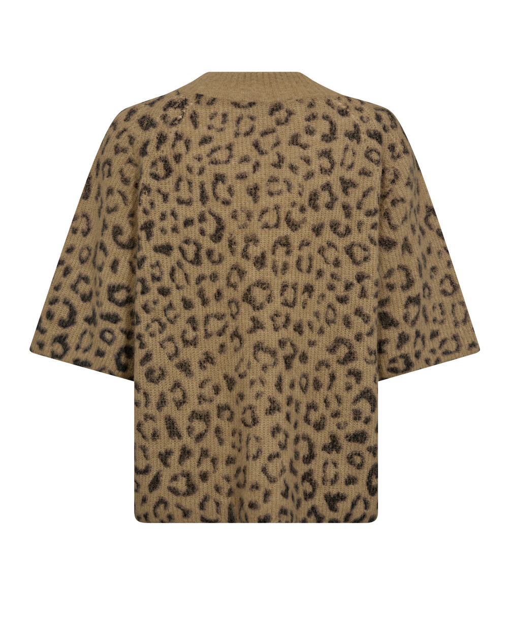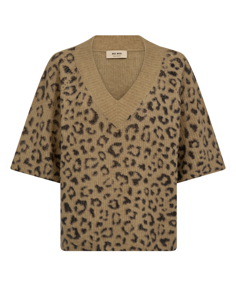 Leopard print v-neck sweater with 3/4 sleeves, made from a soft wool and alpaca blend.