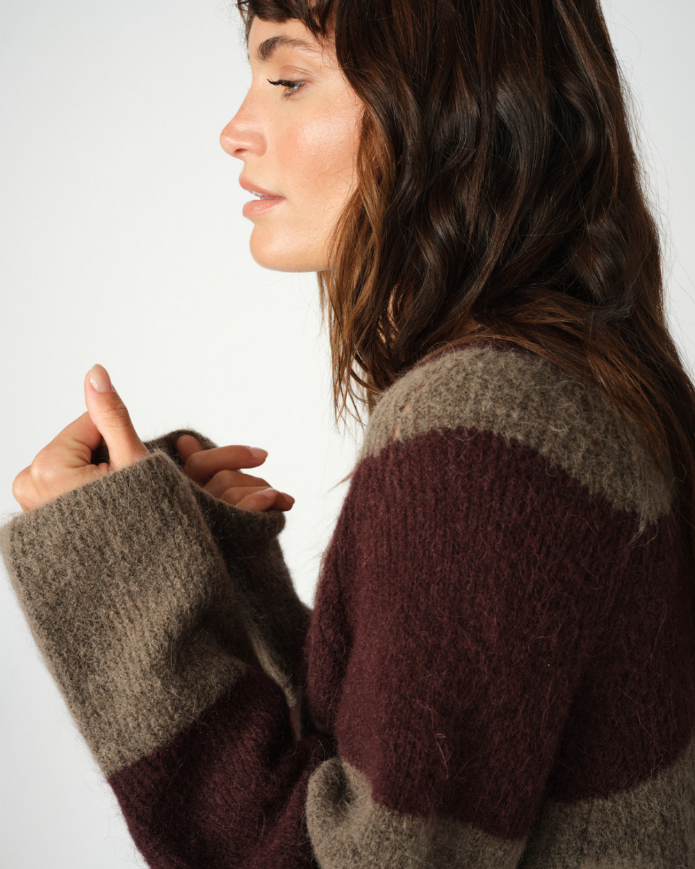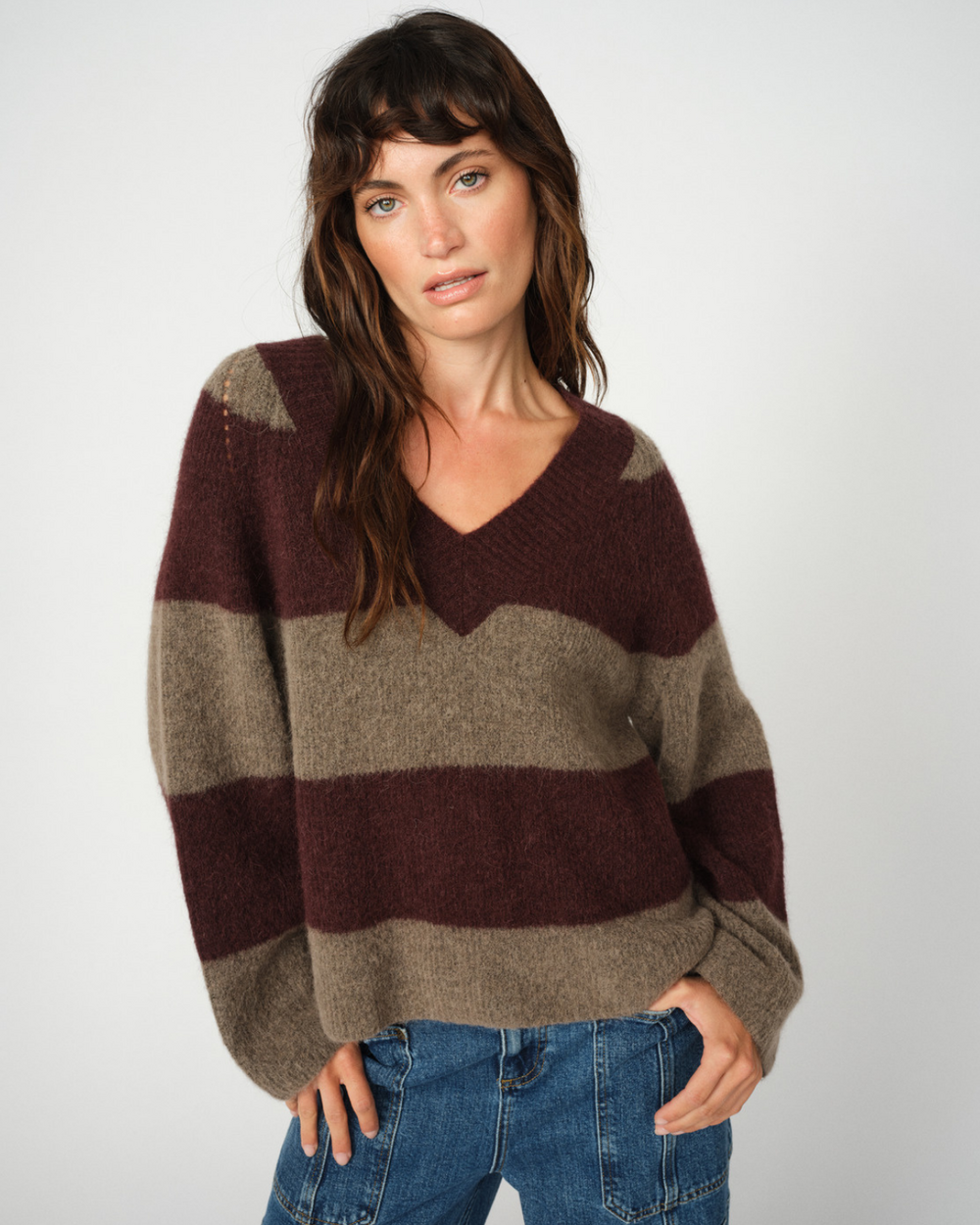 Striped v-neck sweater made from a soft wool and alpaca blend.