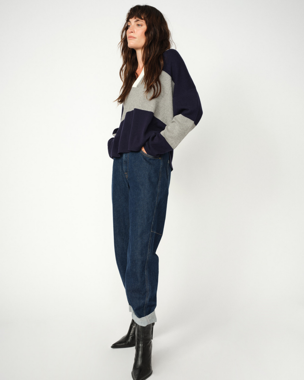 Boyfriend jean in a dark blue wash, finished in an ankle length