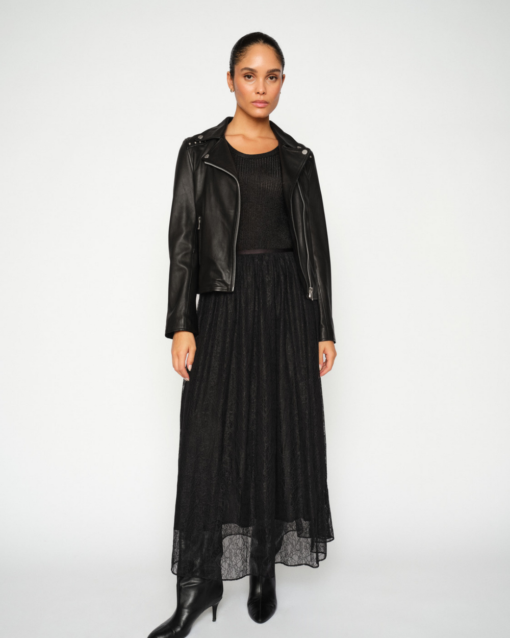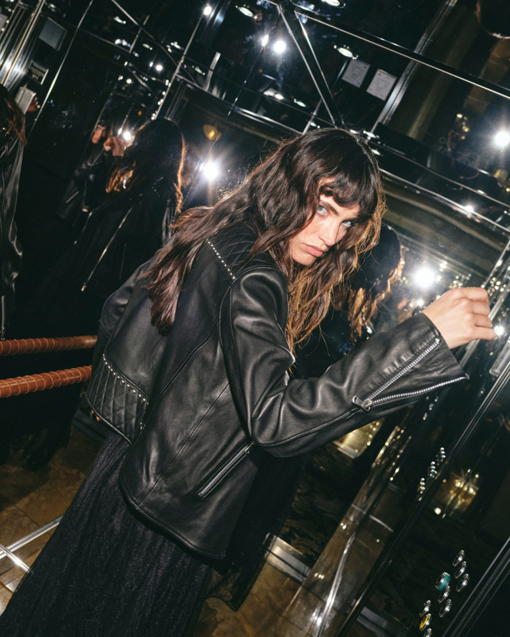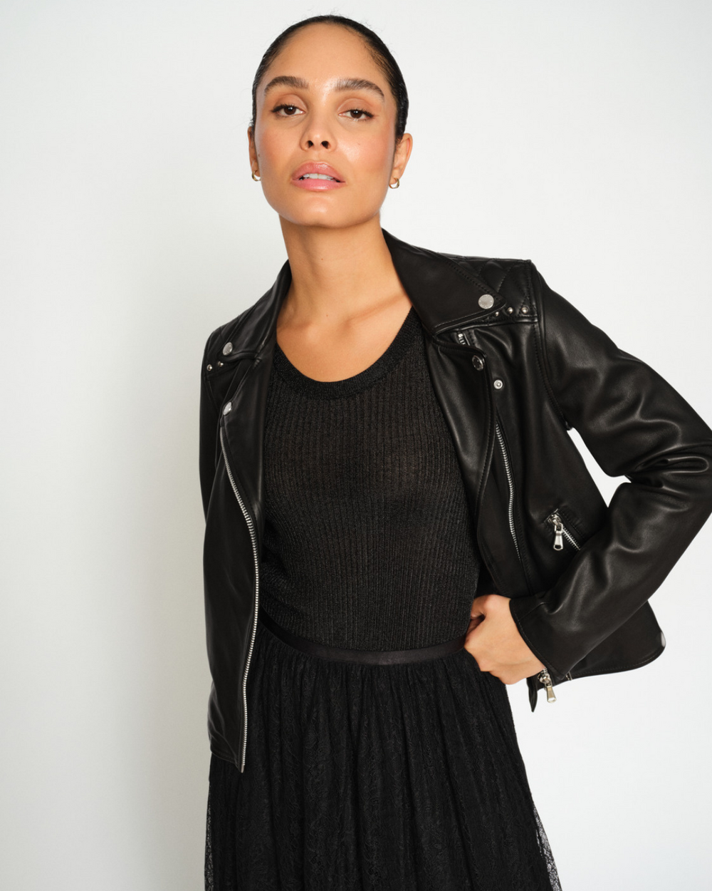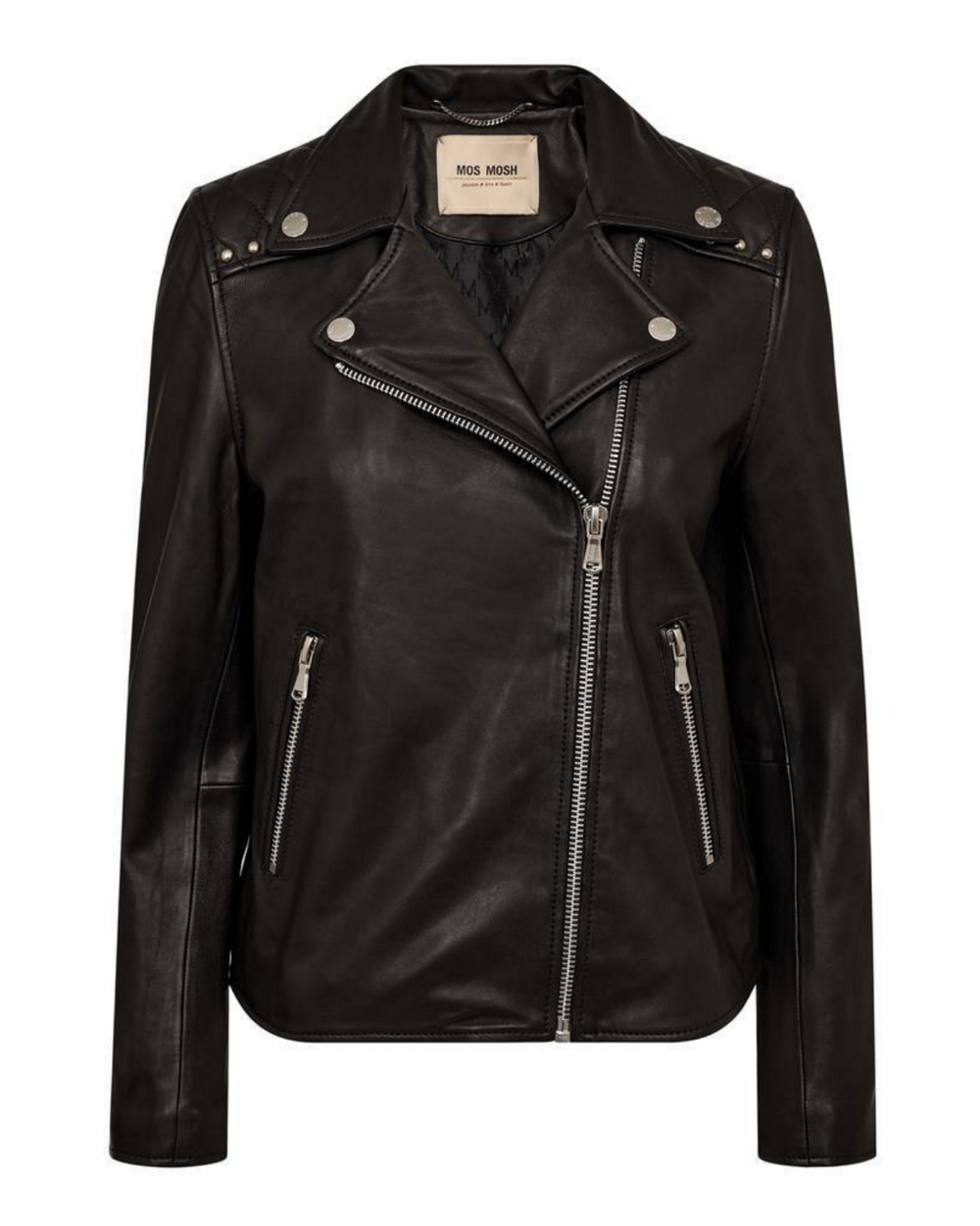 Classic fit fully lined biker jacket with studded details, made of a soft leather and finished with an unique diamond quilting pattern at the shoulders and higher back.
