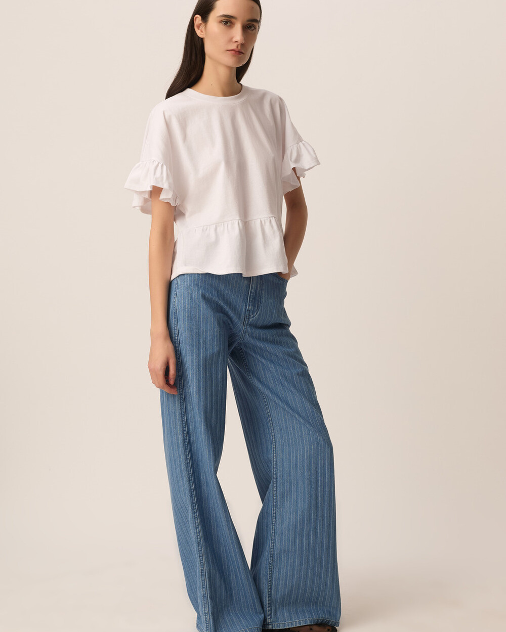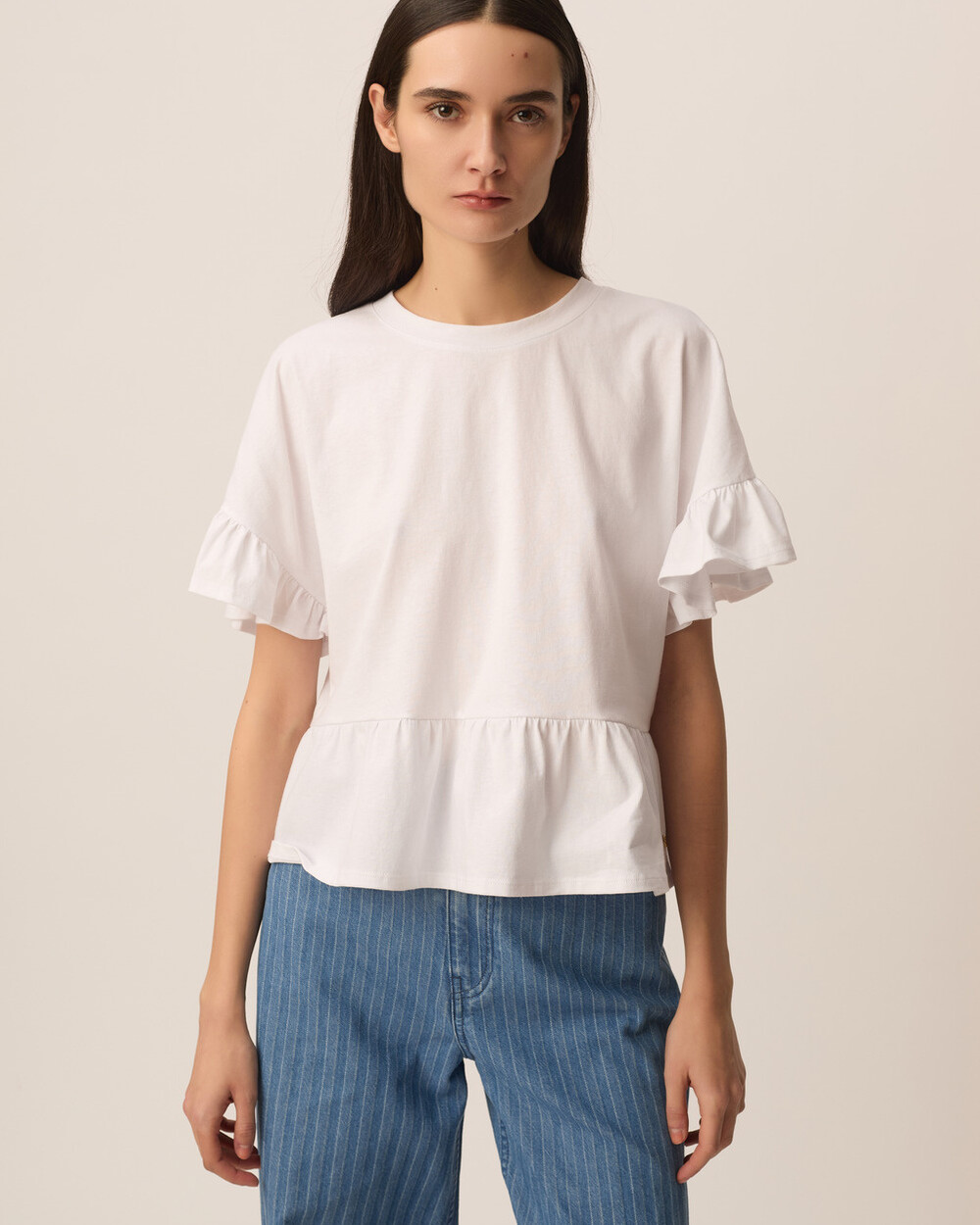 Oversize fit crew neck t-shirt with ruffled details at the sleeves and hem, made of soft cotton.