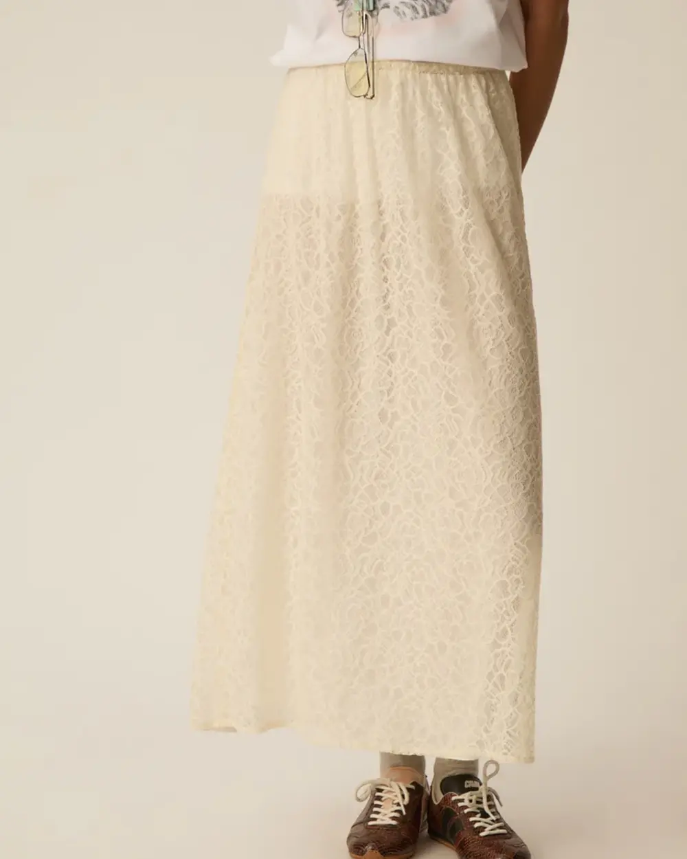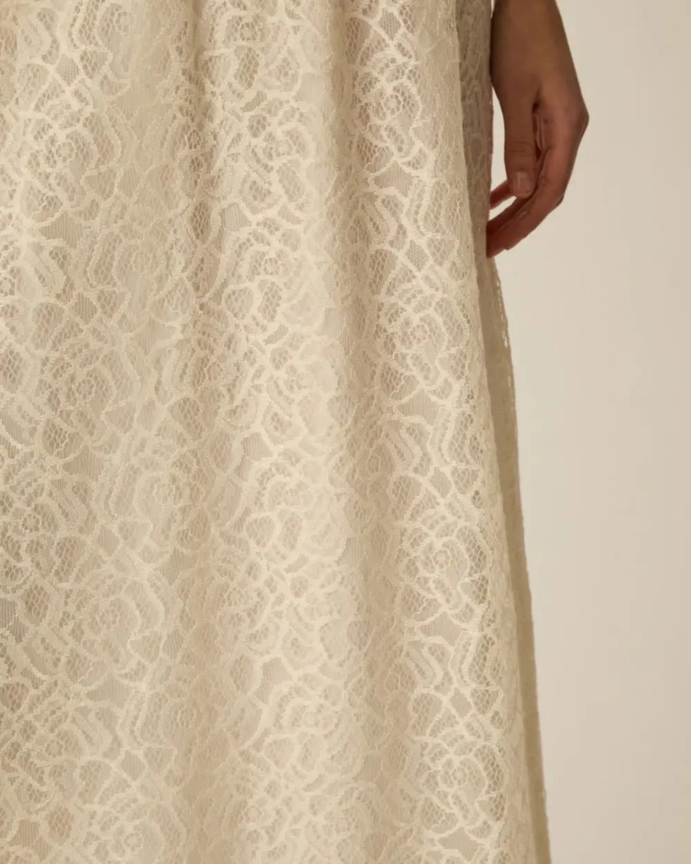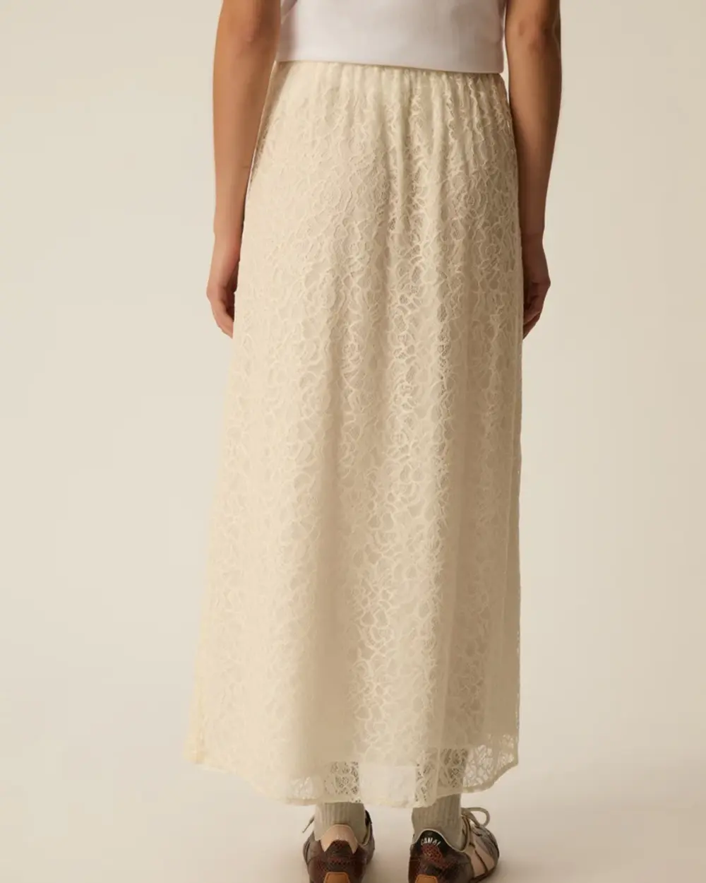 Fully lined semi-fit ankle length skirt, made of a soft lace with a see-thorugh flower pattern.