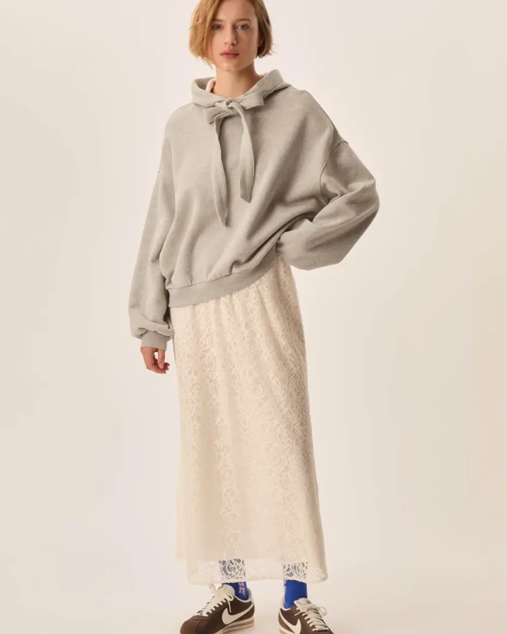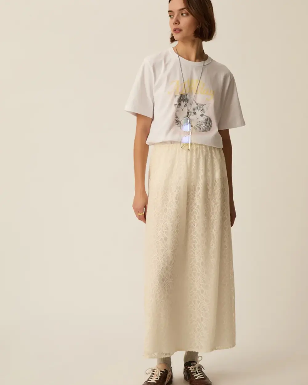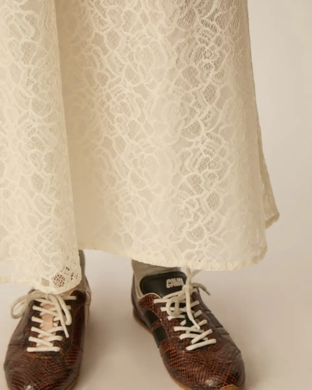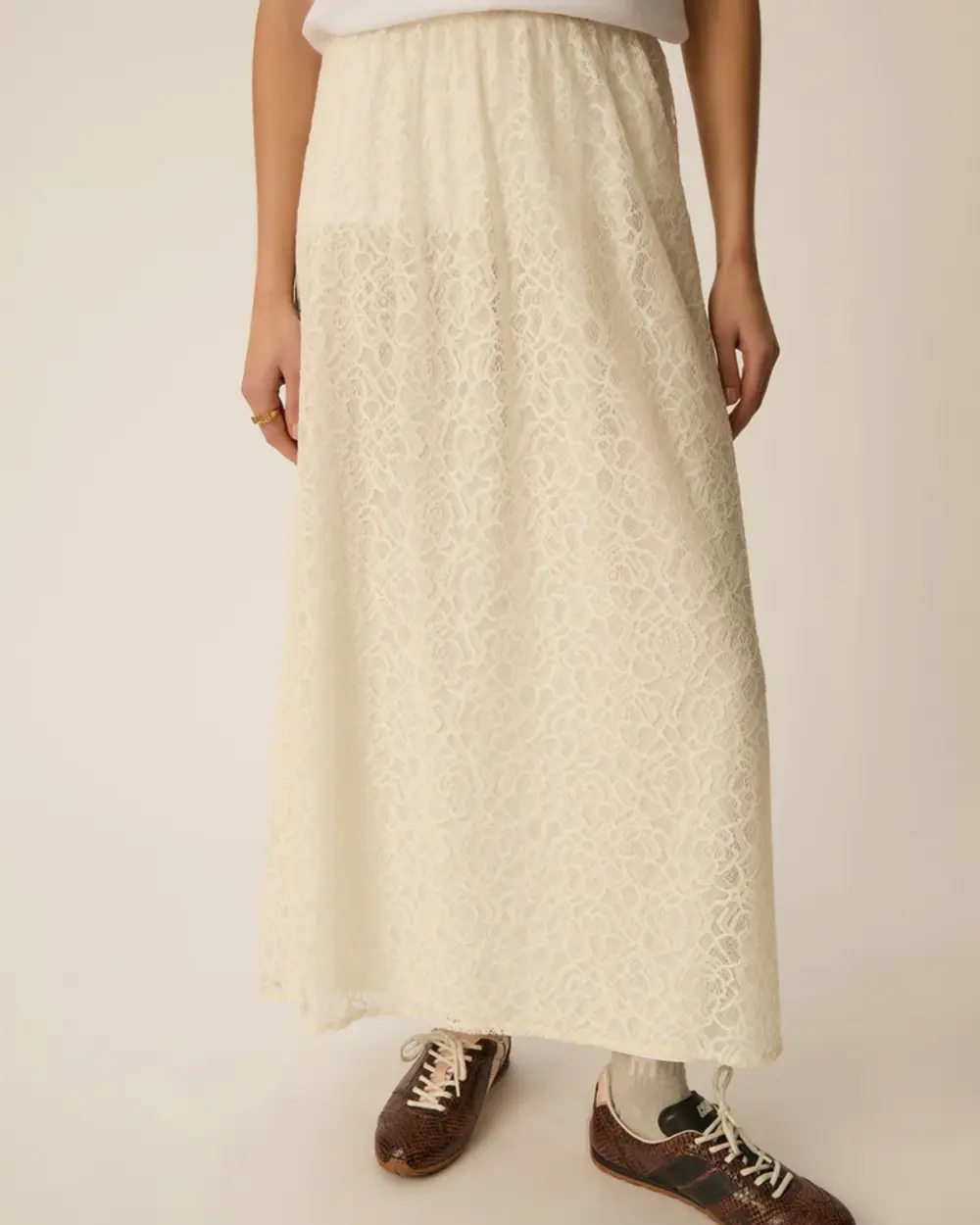 Fully lined semi-fit ankle length skirt, made of a soft lace with a see-thorugh flower pattern.