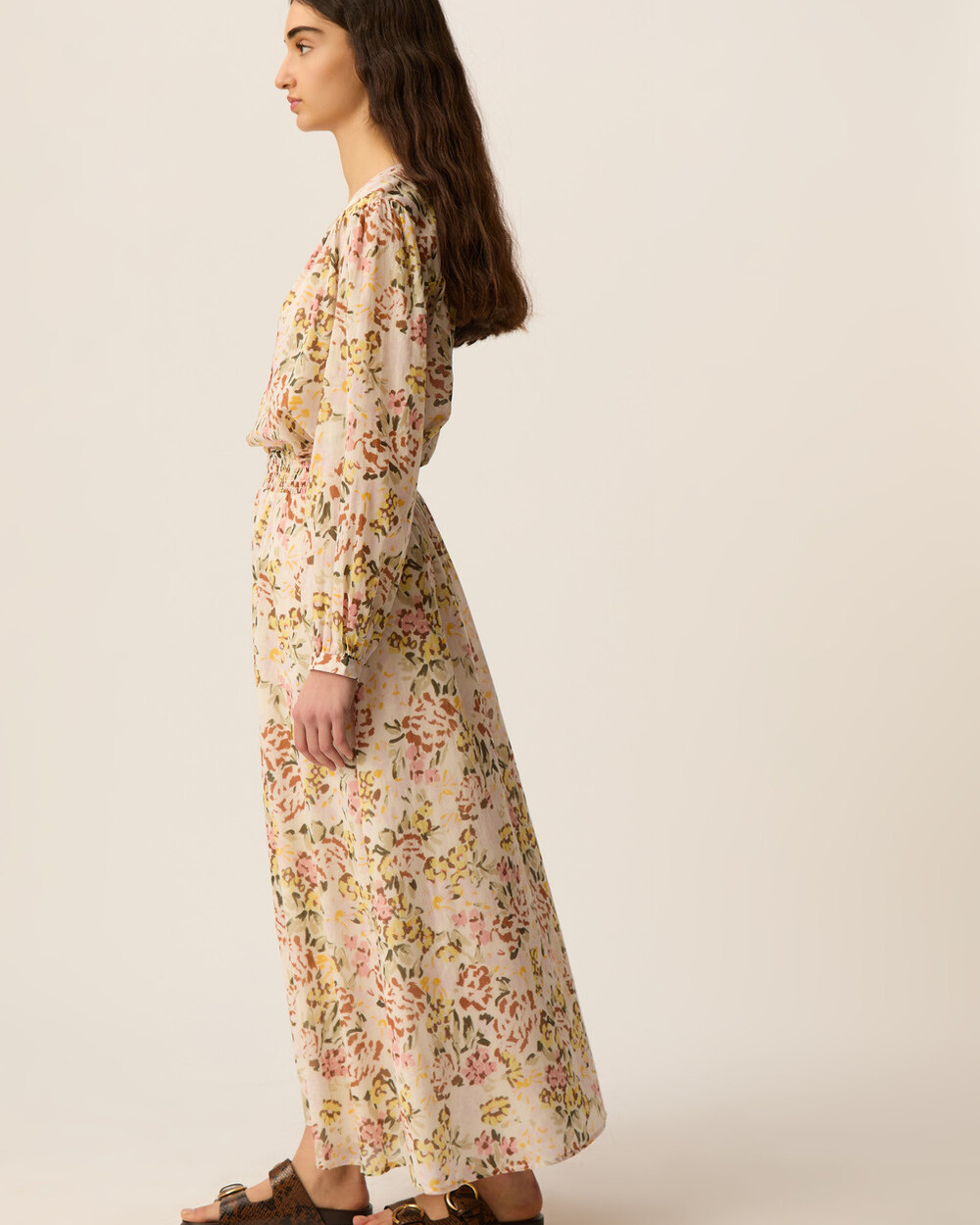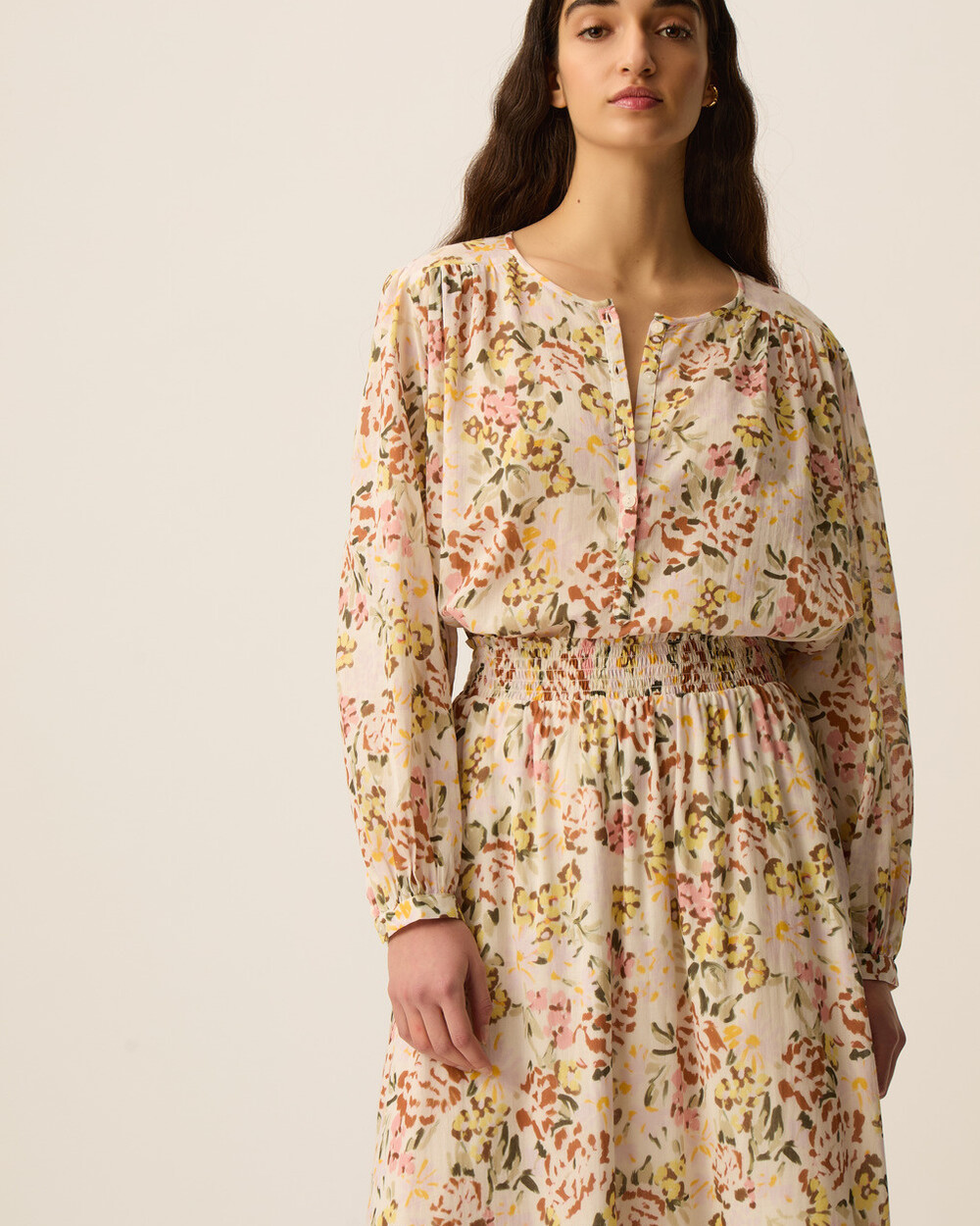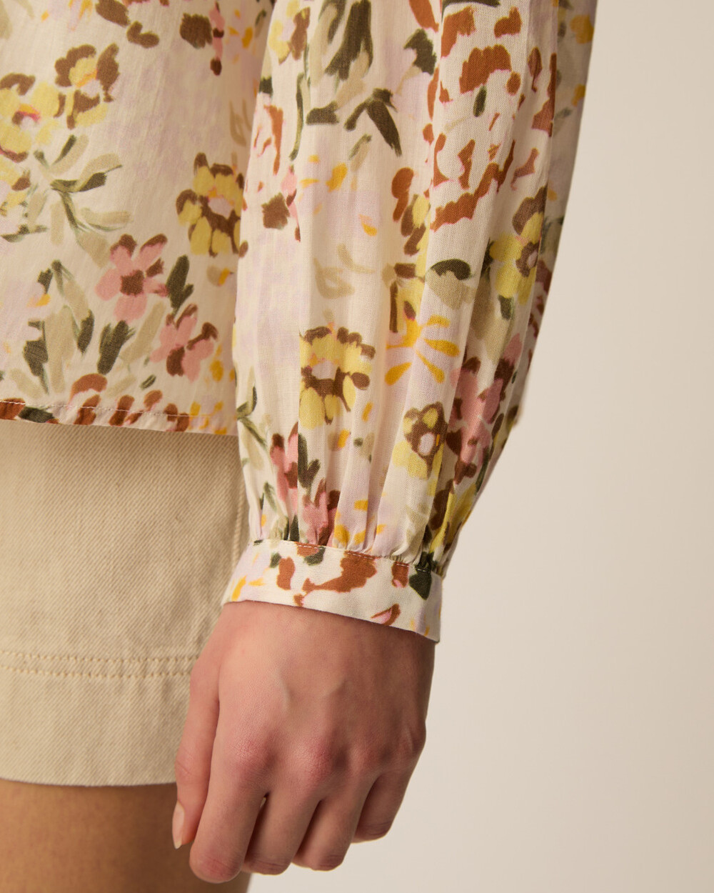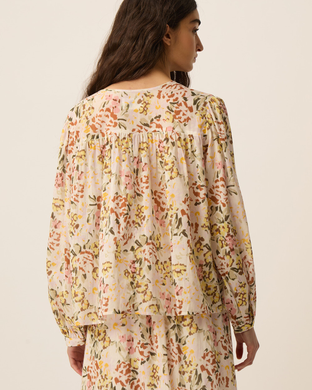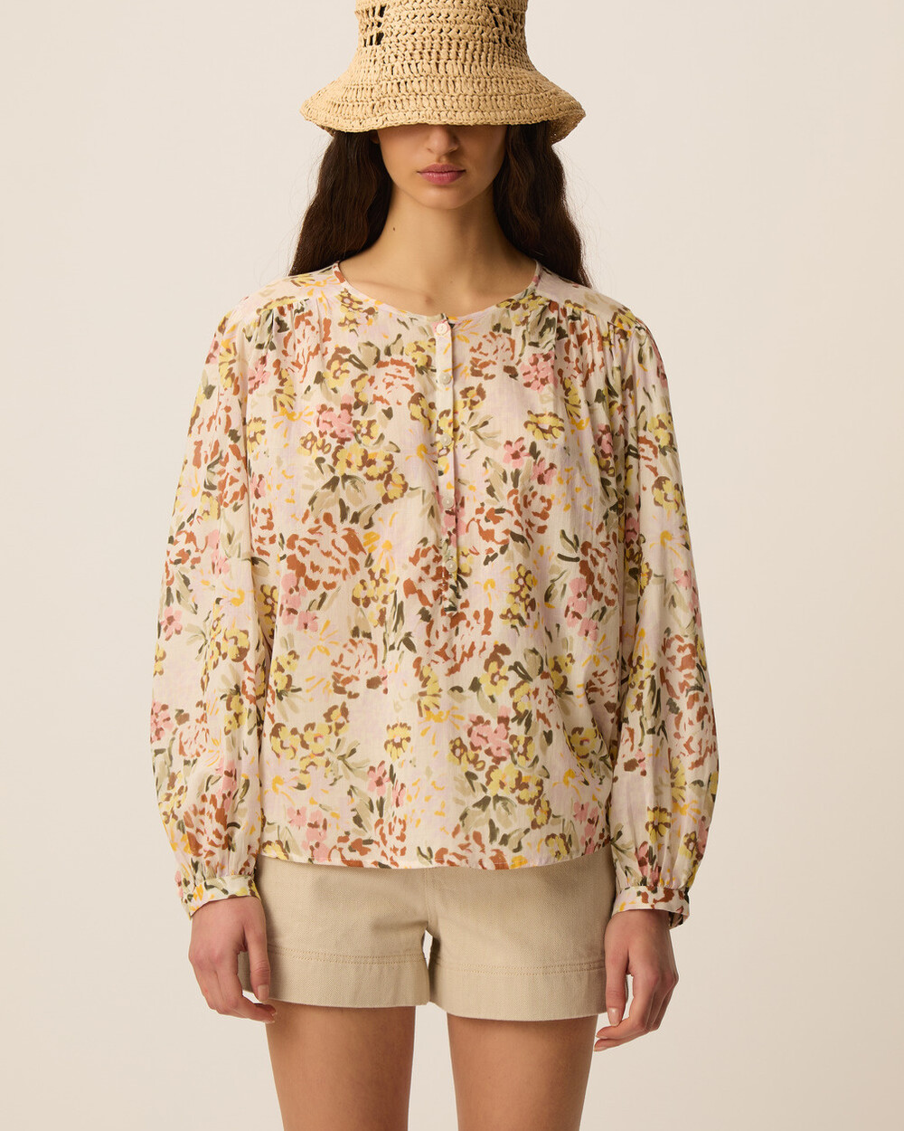 Collarless long sleeve blouse in a relaxed fit, made of a lightweight cotton voile with an unique flower pattern.