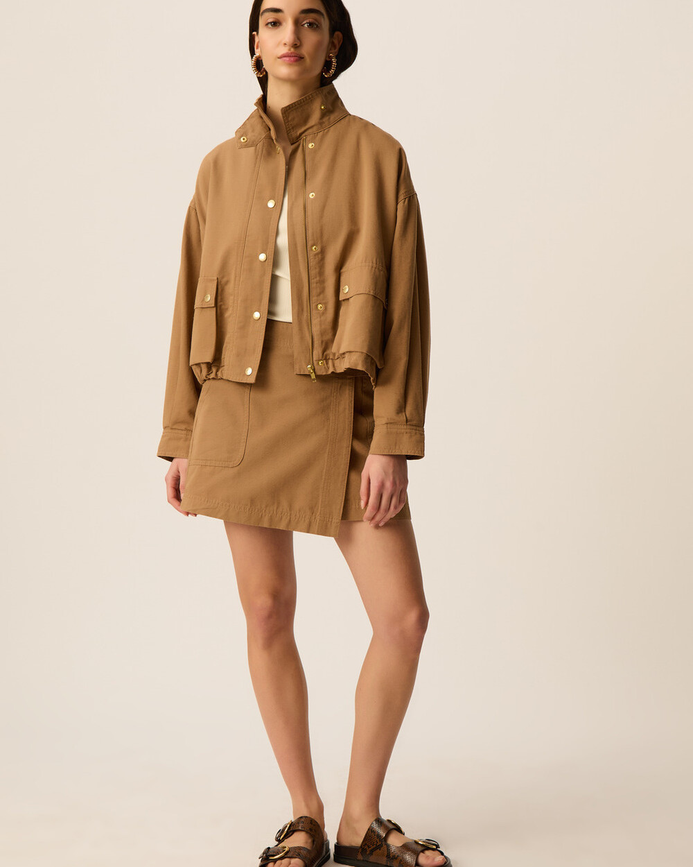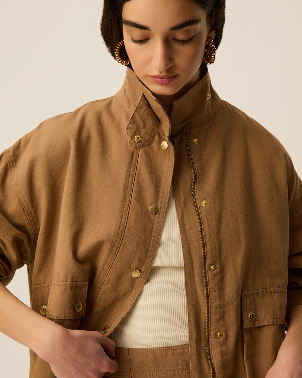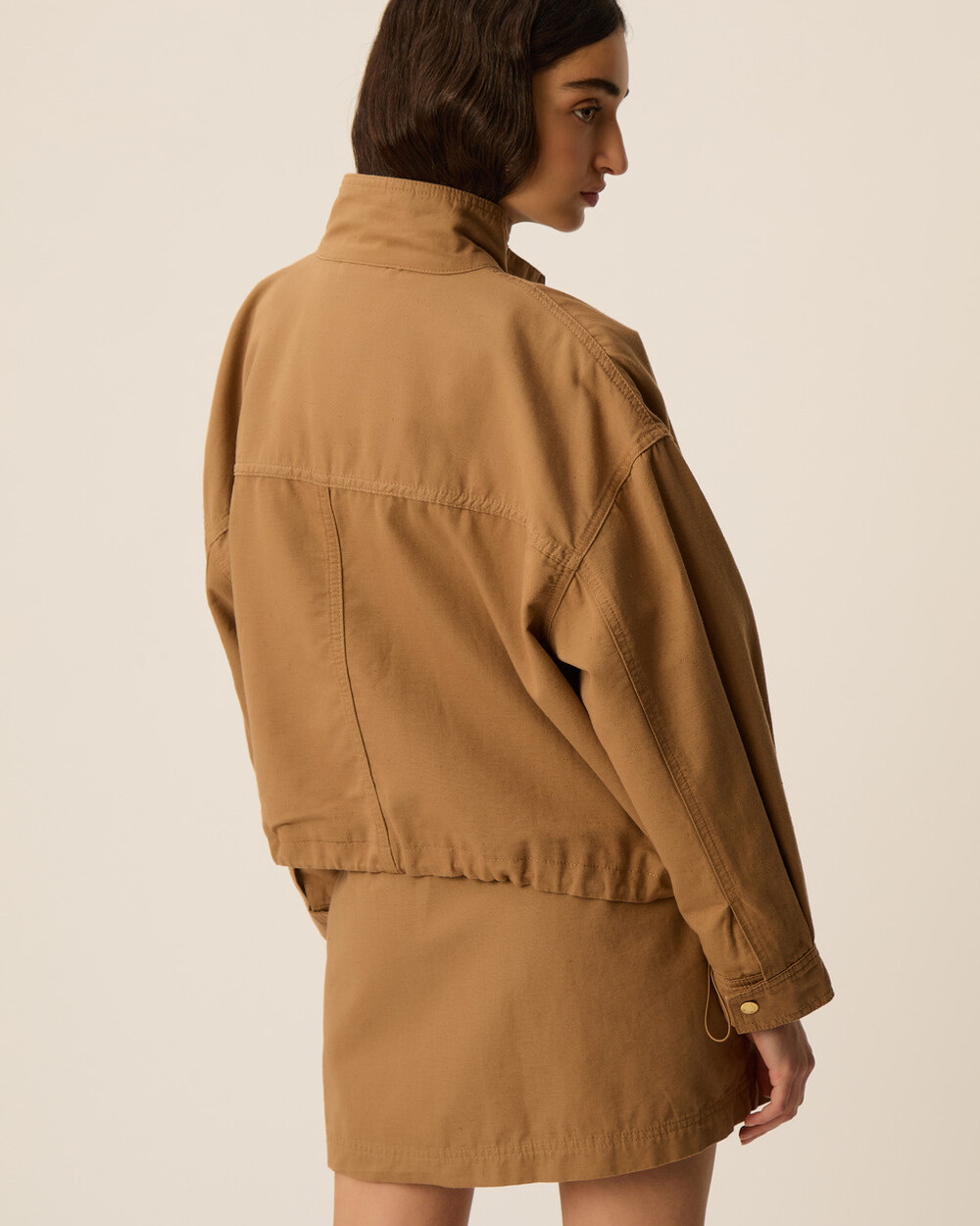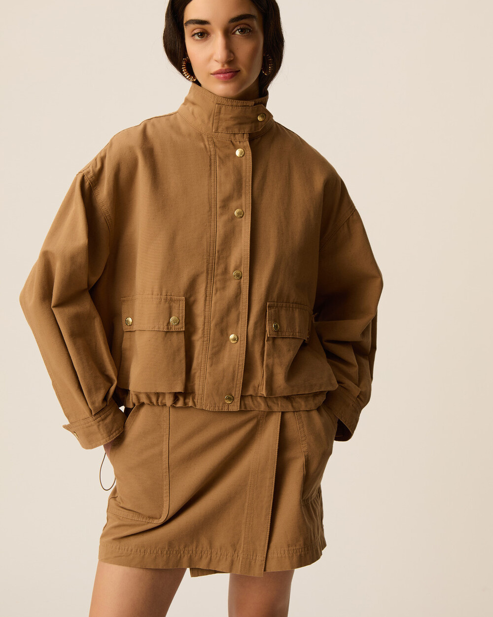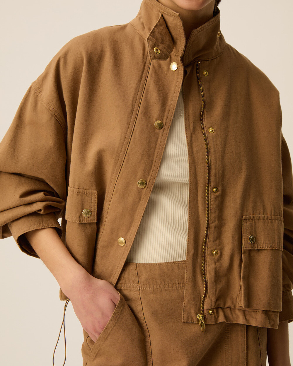 Fully lined cargo jacket in a box fit with front pockets, stand collar and elastic details for ajdusting the width. Pair it back to our YKARIS pant to complete the look!