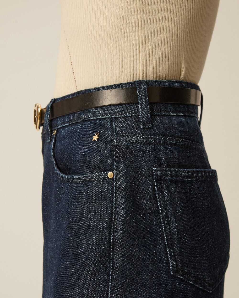 Sized black belt with a heart shaped golden buckle, made of a soft leather.