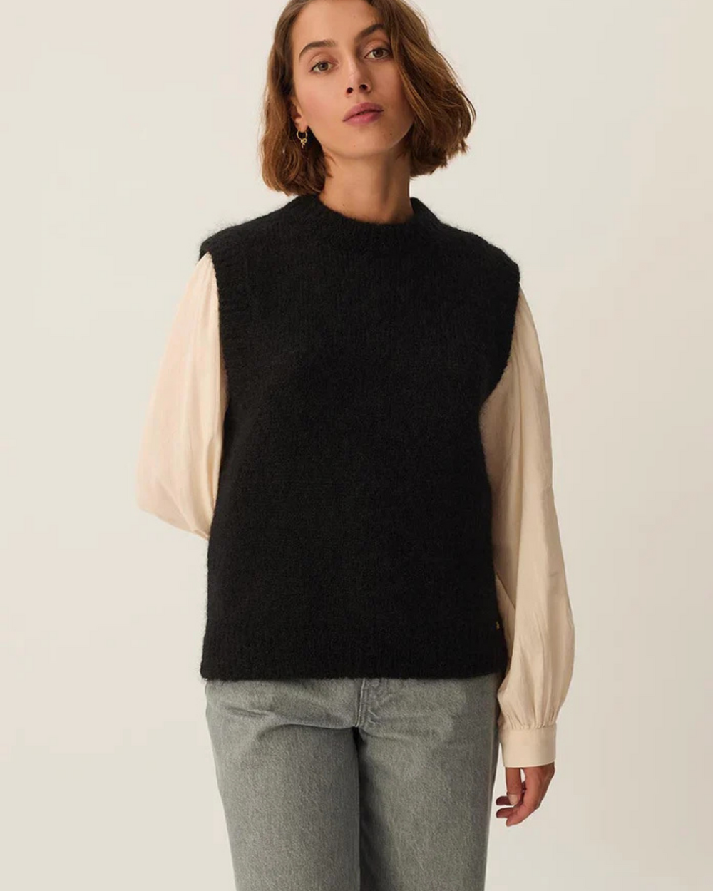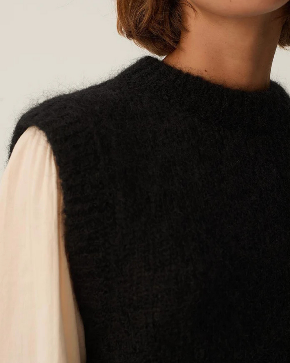 Black cardigan in fluffy mohair with ribbed trim and side slits. Wear layered over a sheer blouse or T-shirt.