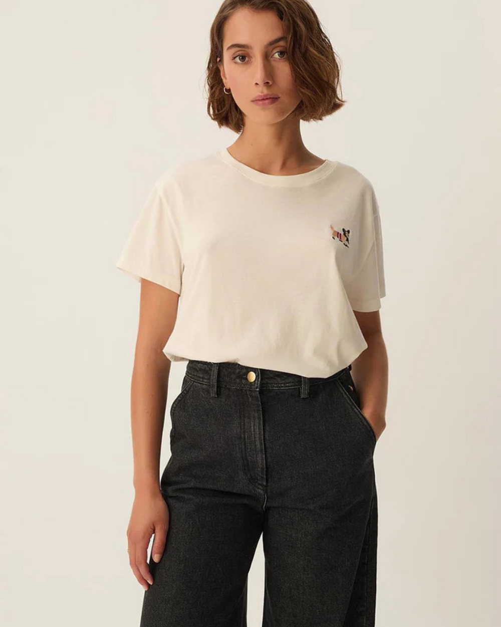 White t-shirt with Corgi dog embroidered on the front.
